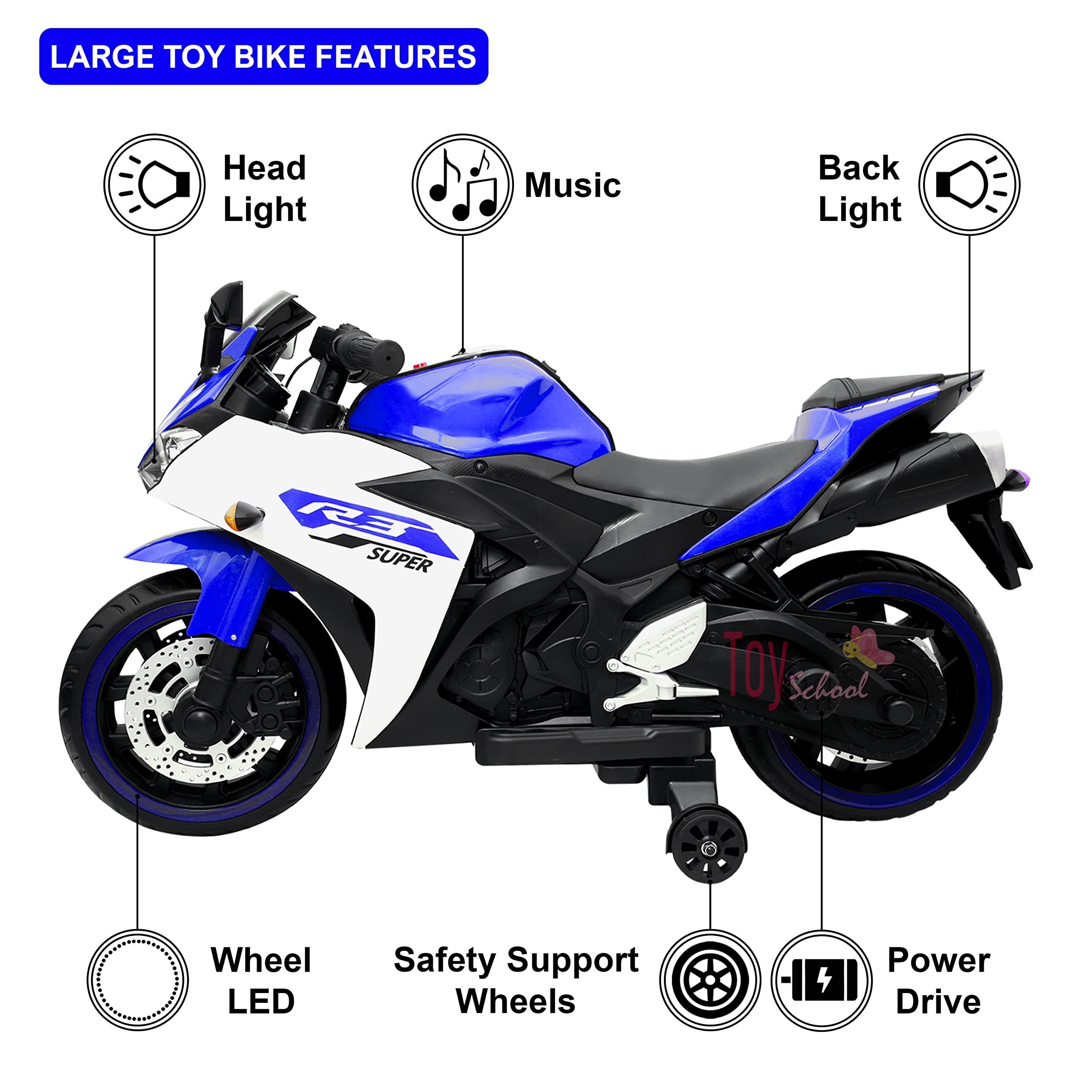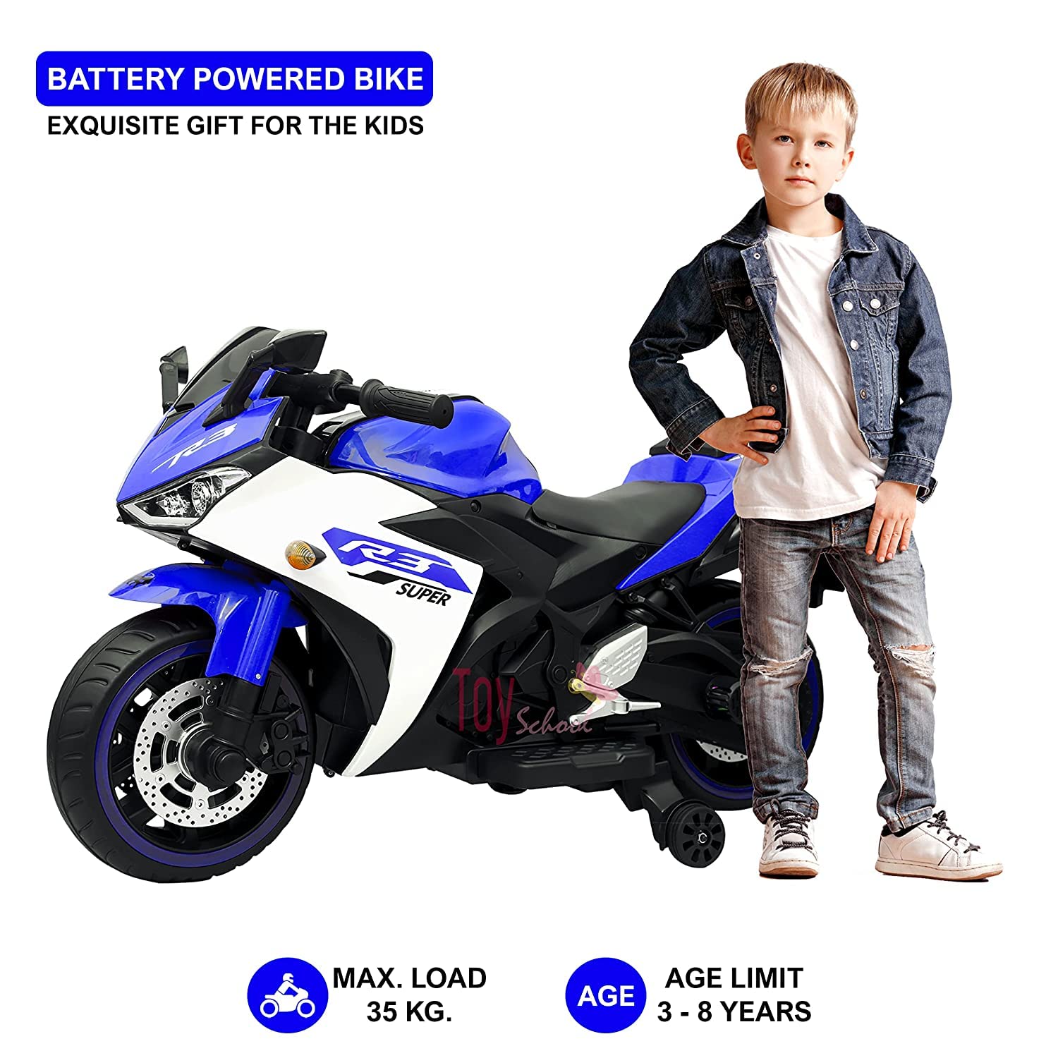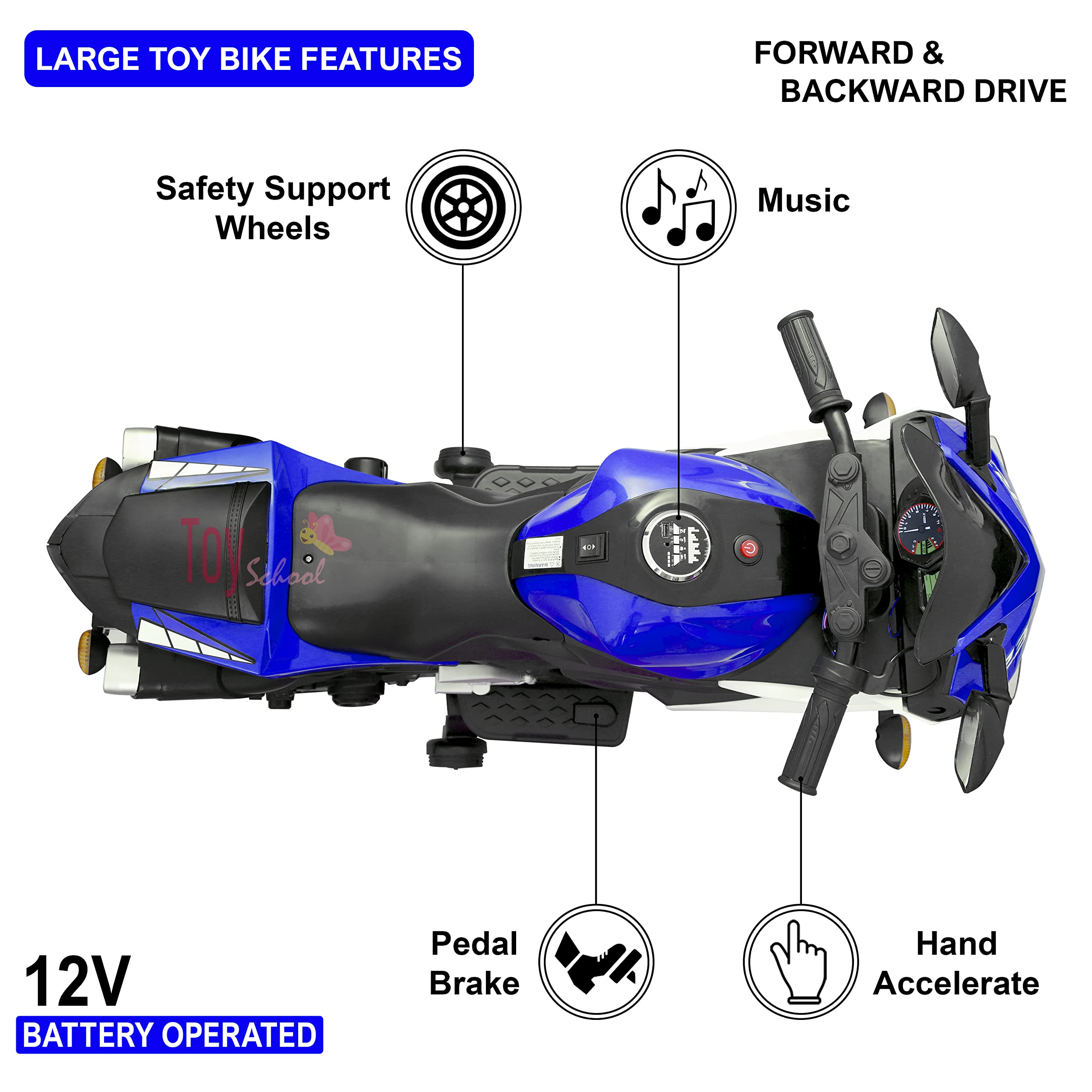 - Product Details: This 550W single-motor bike supports up to 35 kg and ensures safety with hand-throttle acceleration, LED headlights, wheel lights, balance wheels, and a reliable brake system. Features include a push-button start, digital display, forward/reverse modes, and a max speed of 5 km/h. It also offers a music panel with USB, volume control, and a horn. Battery-operated, it’s designed for stability and fun, making it ideal for young riders.