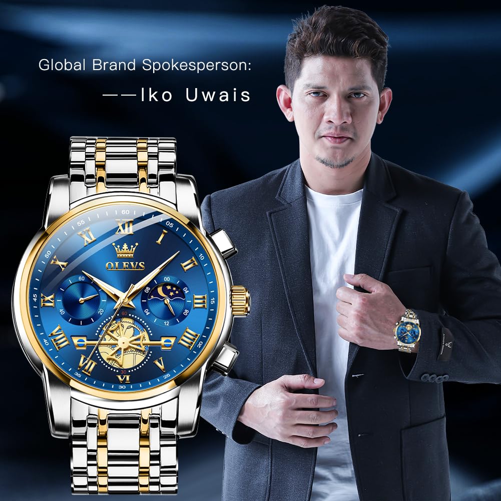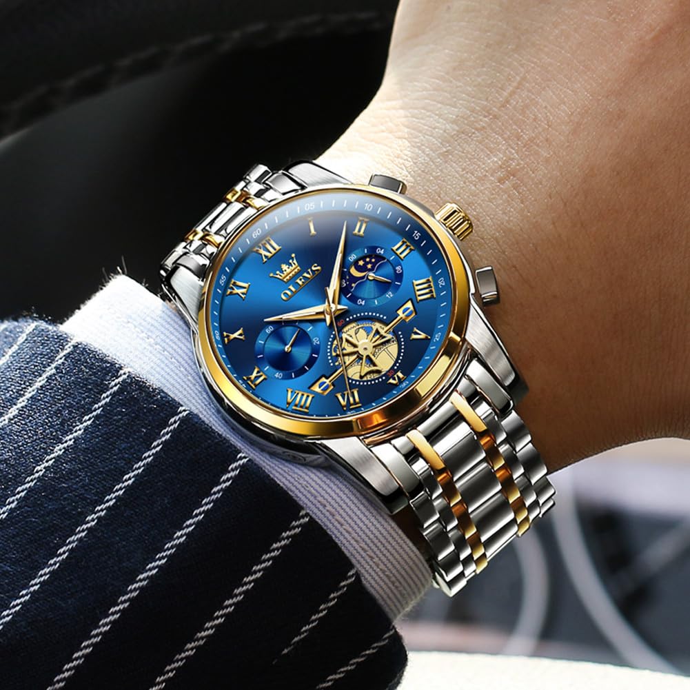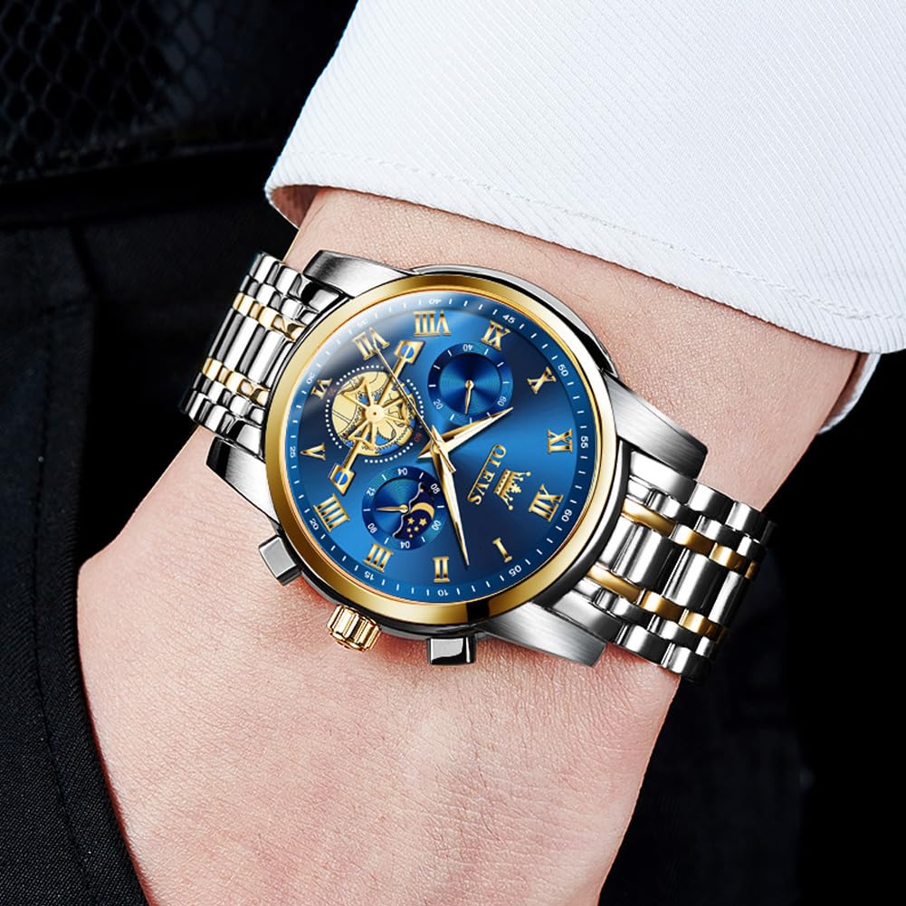 OLEVS Watches for Men Chronograph Business Blue Wrist Watches Analog Quartz Moon Phase Stainless Steel Waterproof Luminous Dress Watches