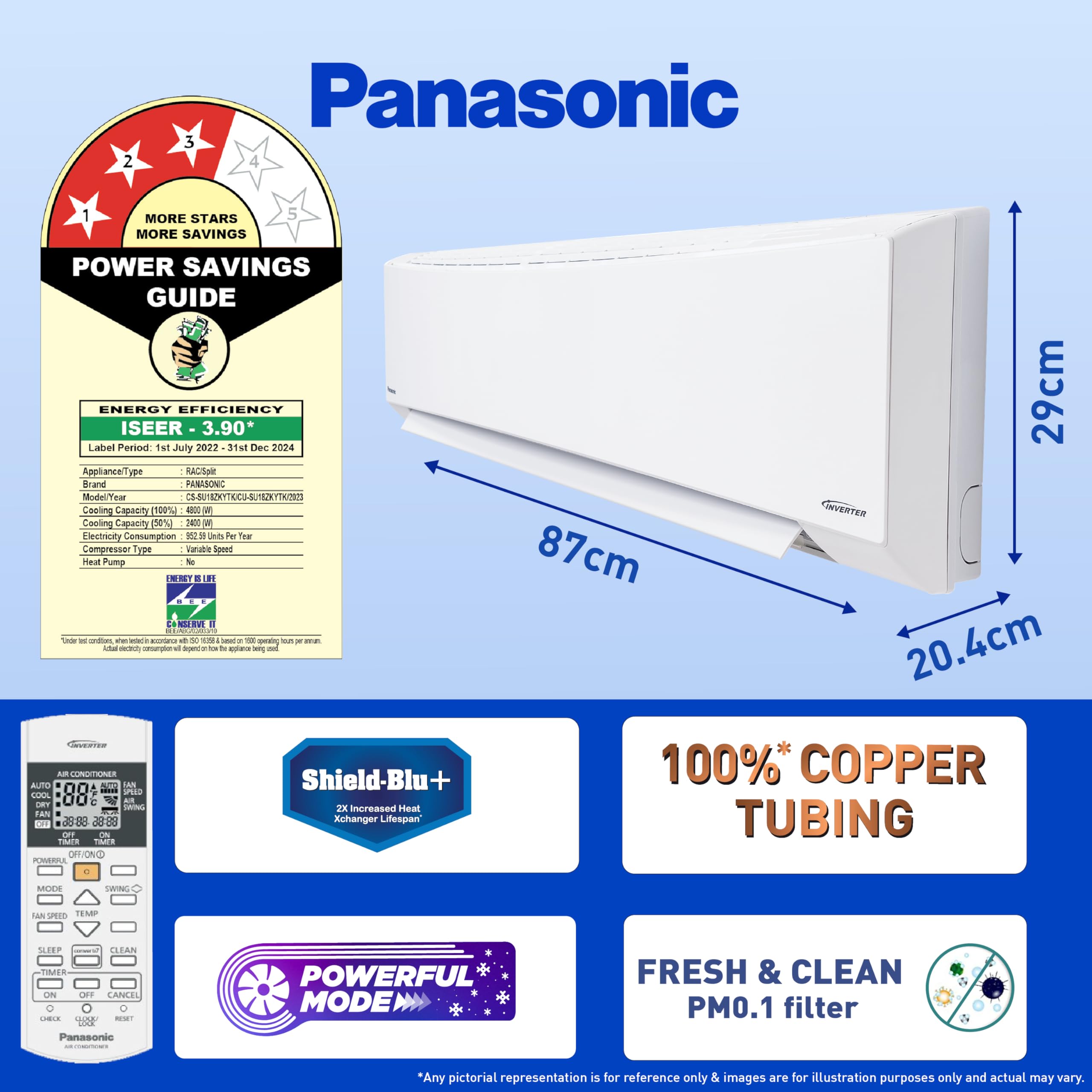 Panasonic 1.5 Ton 3 Star Inverter Split AC (Copper Condenser, 7 in 1 Convertible, PM 0.1 Air Purification Filter, Hidden Display, CS/CU-SU18ZKYTK, 2024 Model, White)