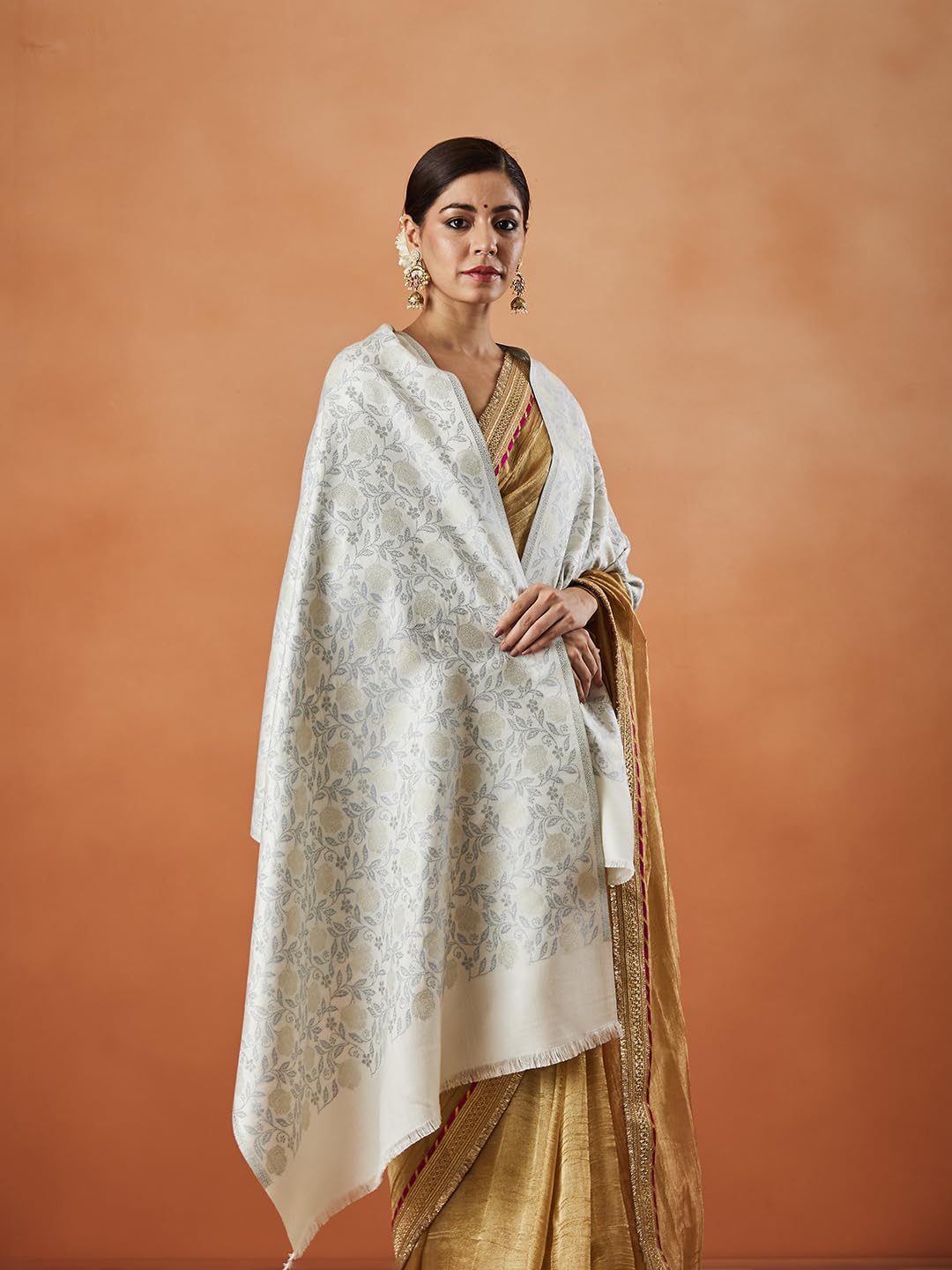 Brand: PashmodaColor: WhiteFeatures: Kaani stoles, originating from Kashmir, are a testament to intricate artistry. Woven with fine woolen threads, these... Read more