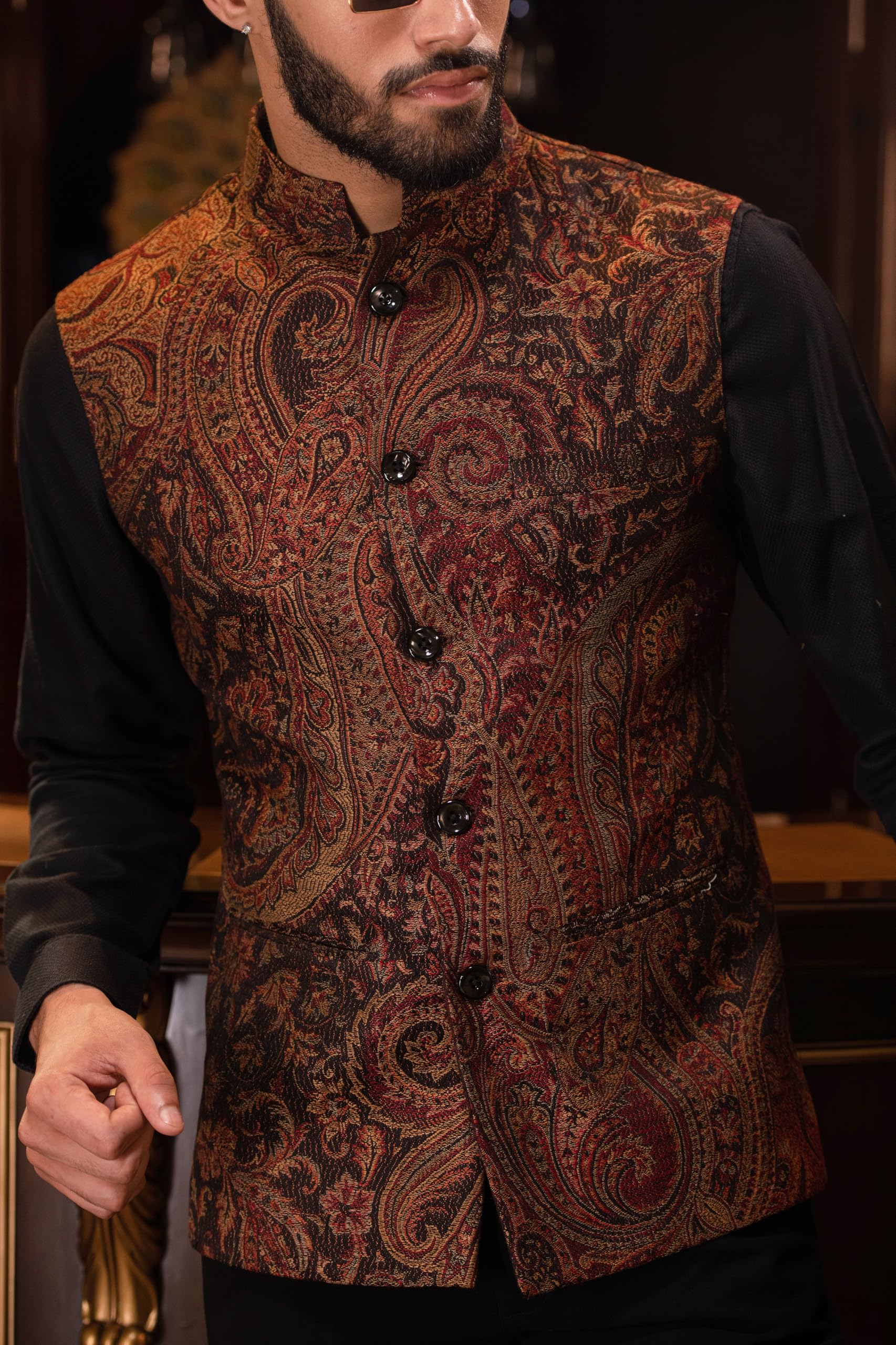 Pashtush Mens Woven Jacquard Structured Waistcoat, Slim Fit, Royal Black (38 - S)
