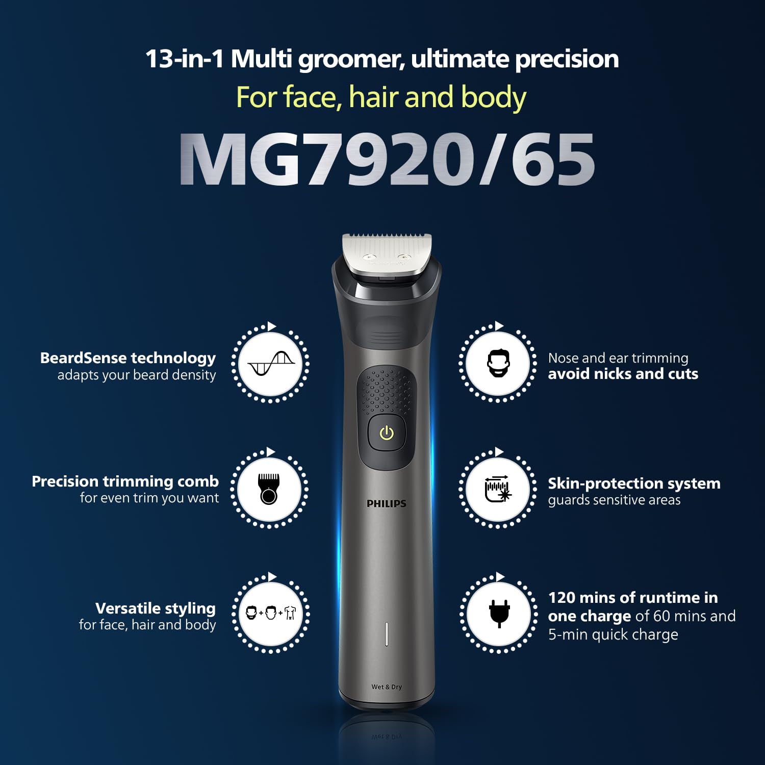 Philips India's No.1 Men's Trimmer| Patented Twin Trim Blades I Precision Trimming, 13-in-1 Modern Man Kit -Face, Body & Private Parts I 3 Year Warranty I120Min Runtime I 5 min Quick Charge MG7920/65