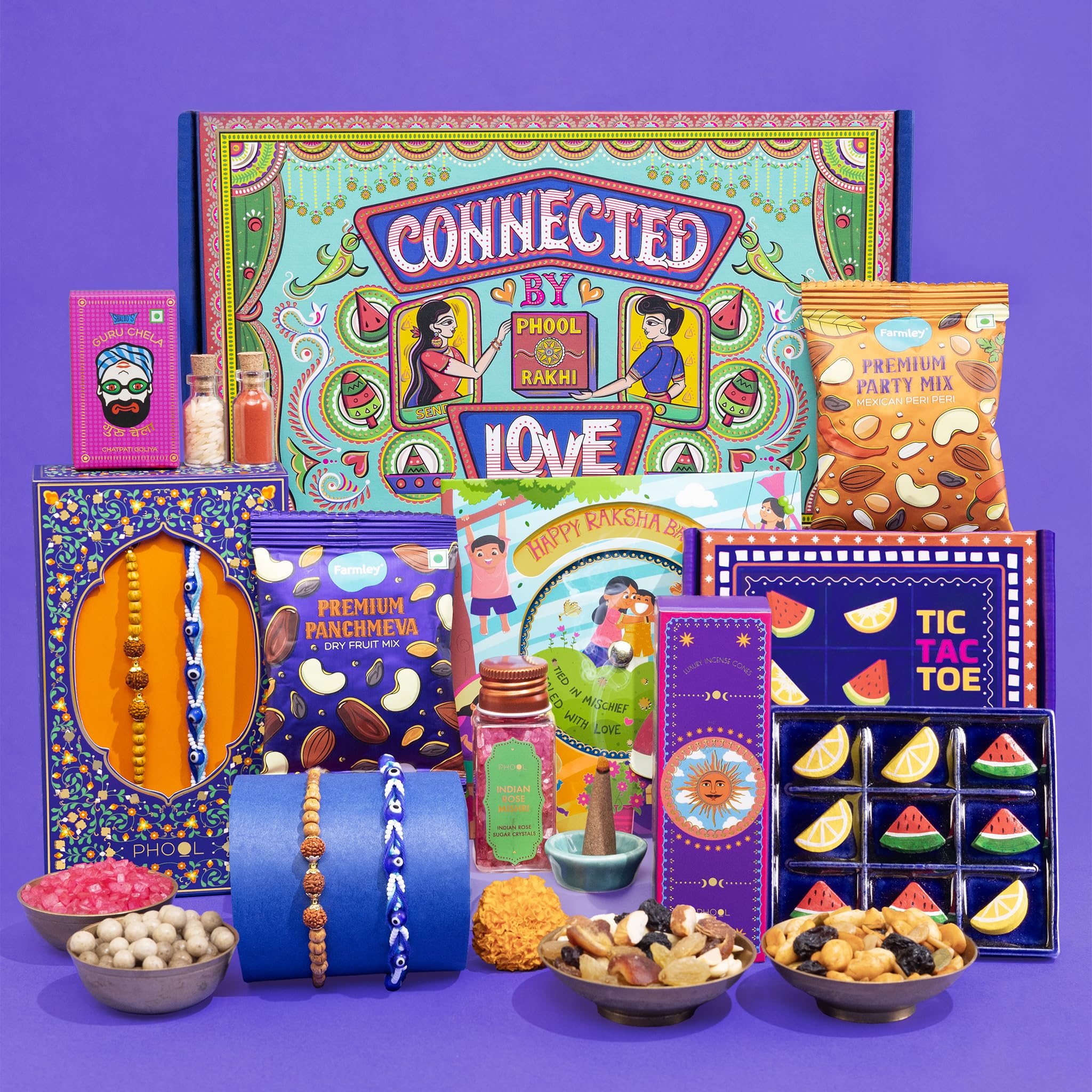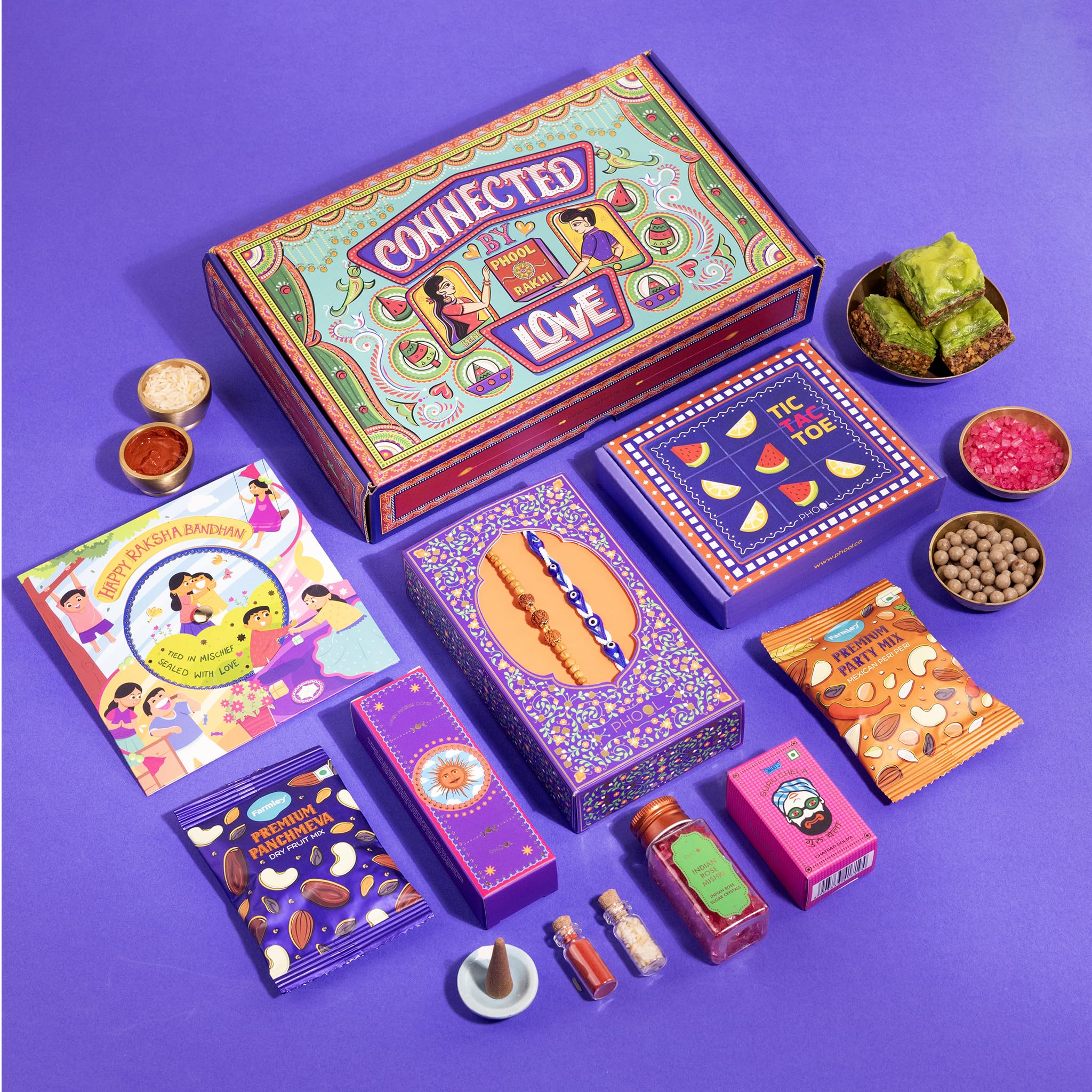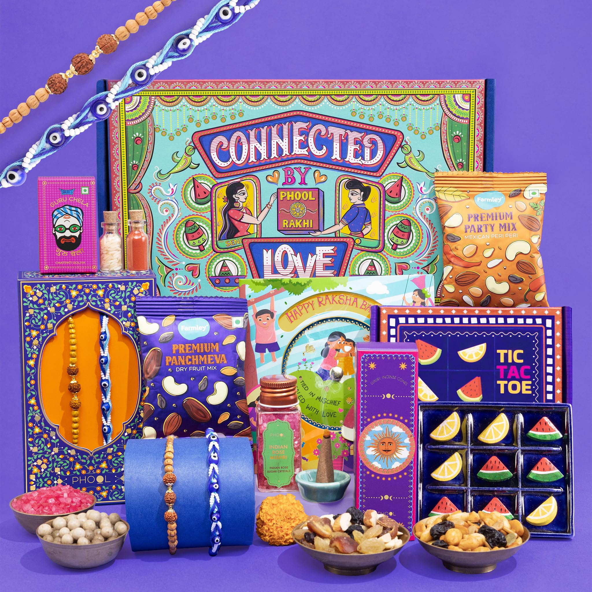 Phool Tera Mera Rakhi Giftbox for Brother |11 Inclusions rakhi gift hamper | 2 Combo Rudraksha & Mystic Braid Rakhi | Dhoop Cone | Farmley Dry Fruit Mix | Guru Chela Mouth Freshener | Tic-Tac-Toe Game | Greeting Card