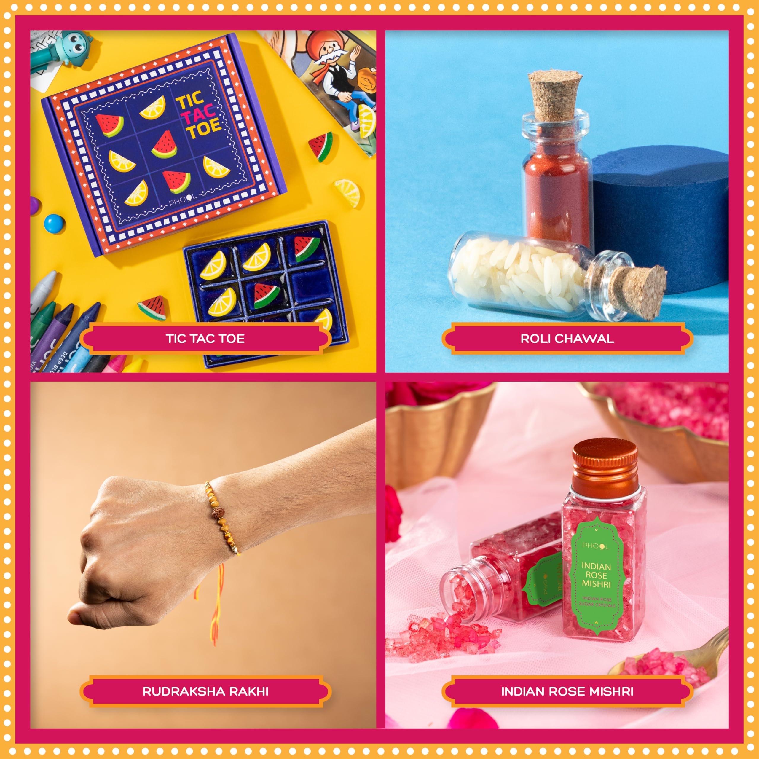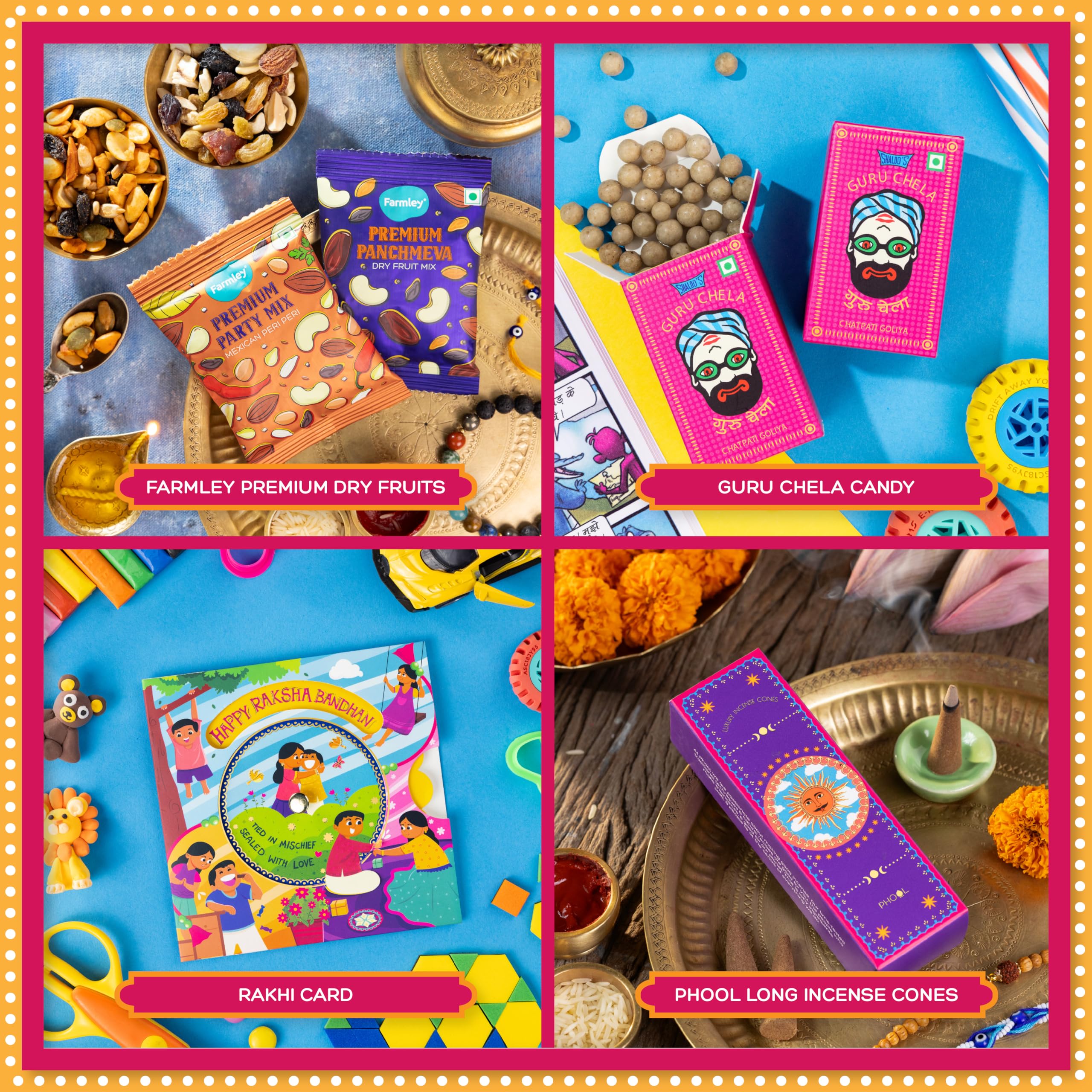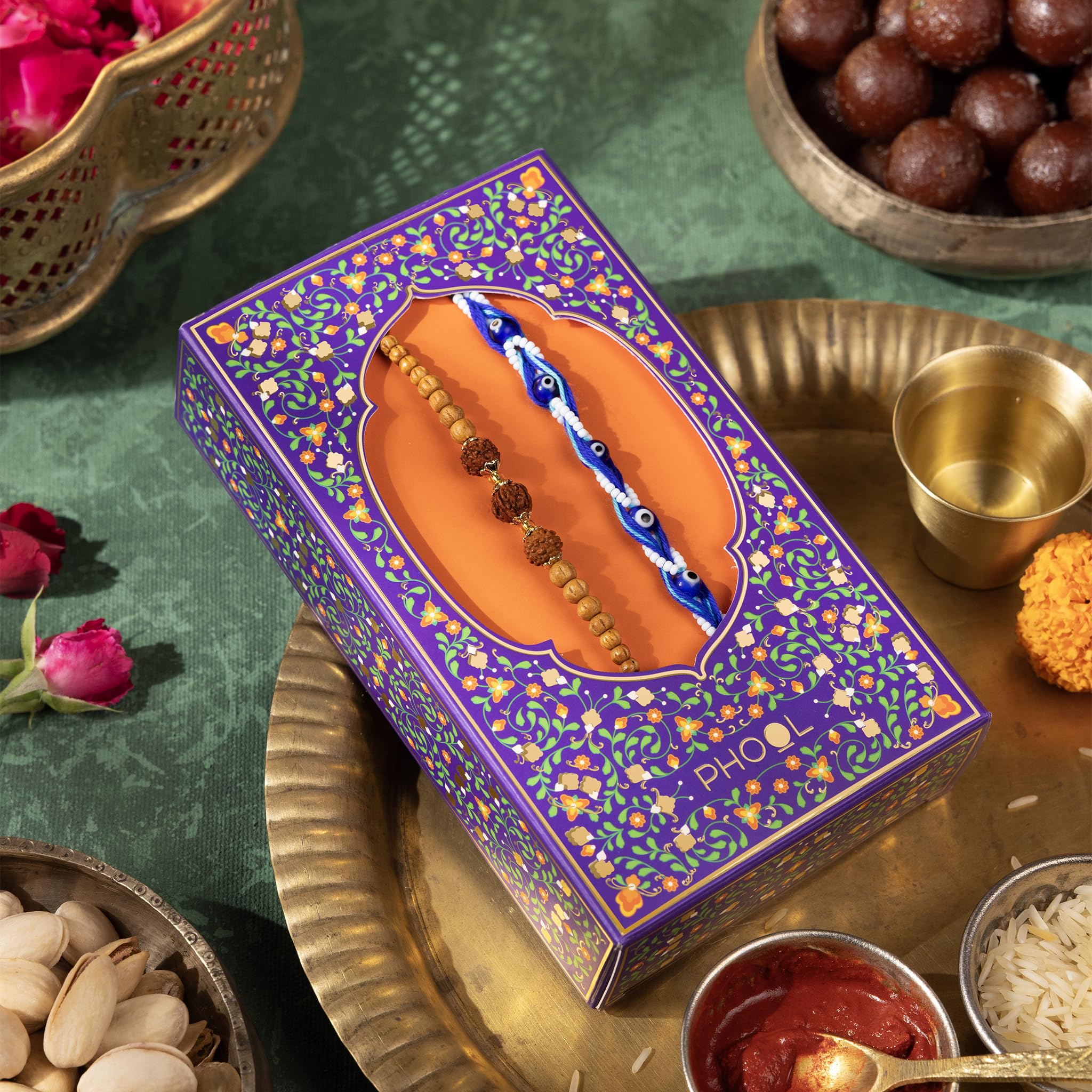 Phool Tera Mera Rakhi Giftbox for Brother |11 Inclusions rakhi gift hamper | 2 Combo Rudraksha & Mystic Braid Rakhi | Dhoop Cone | Farmley Dry Fruit Mix | Guru Chela Mouth Freshener | Tic-Tac-Toe Game | Greeting Card