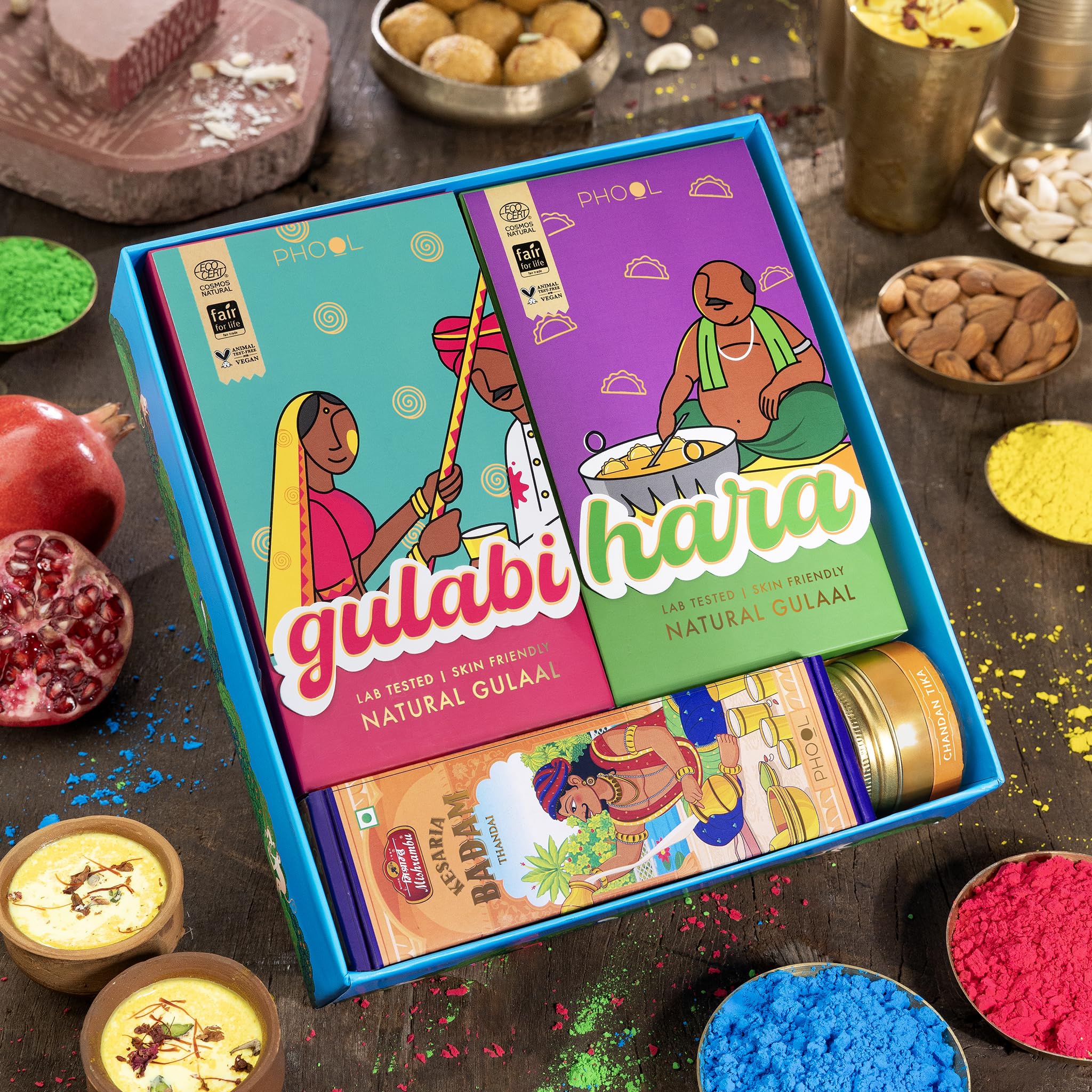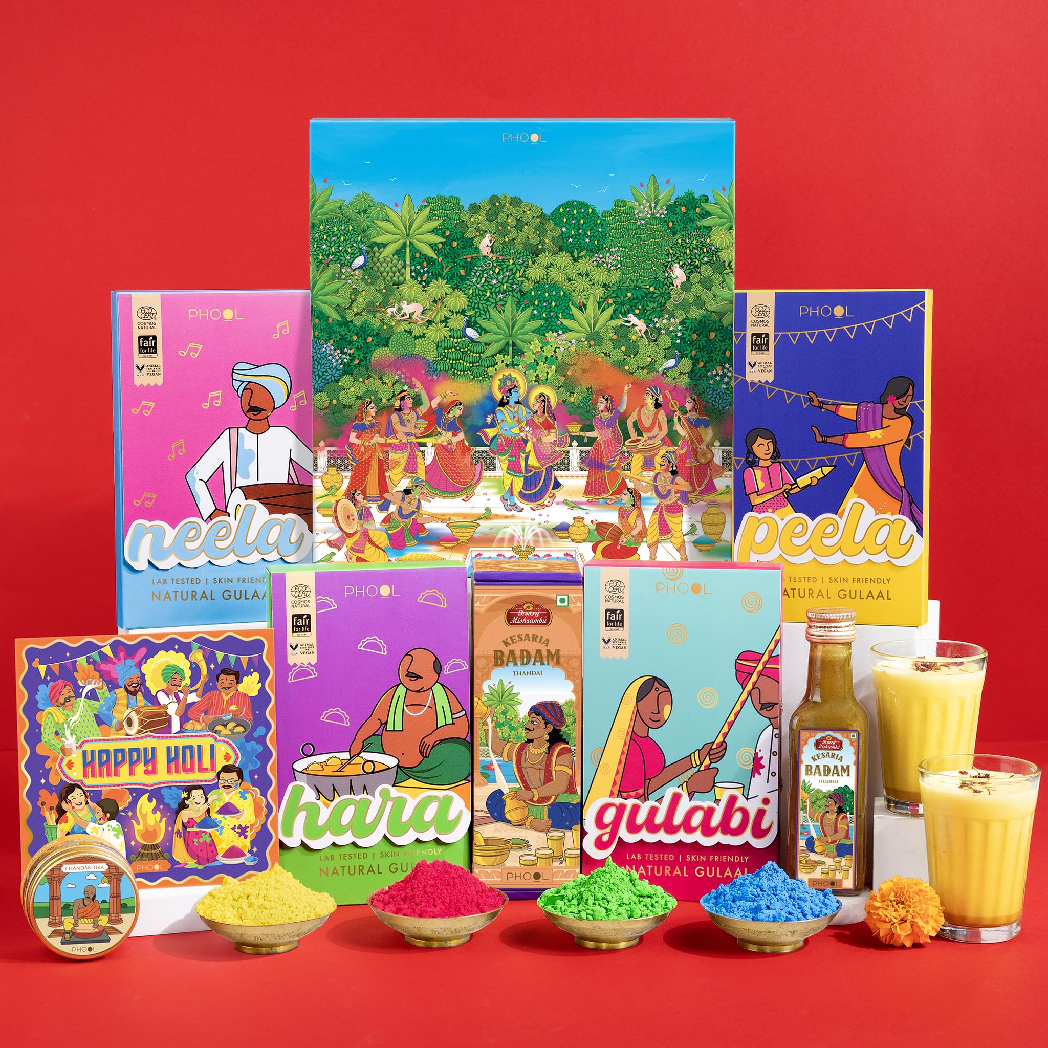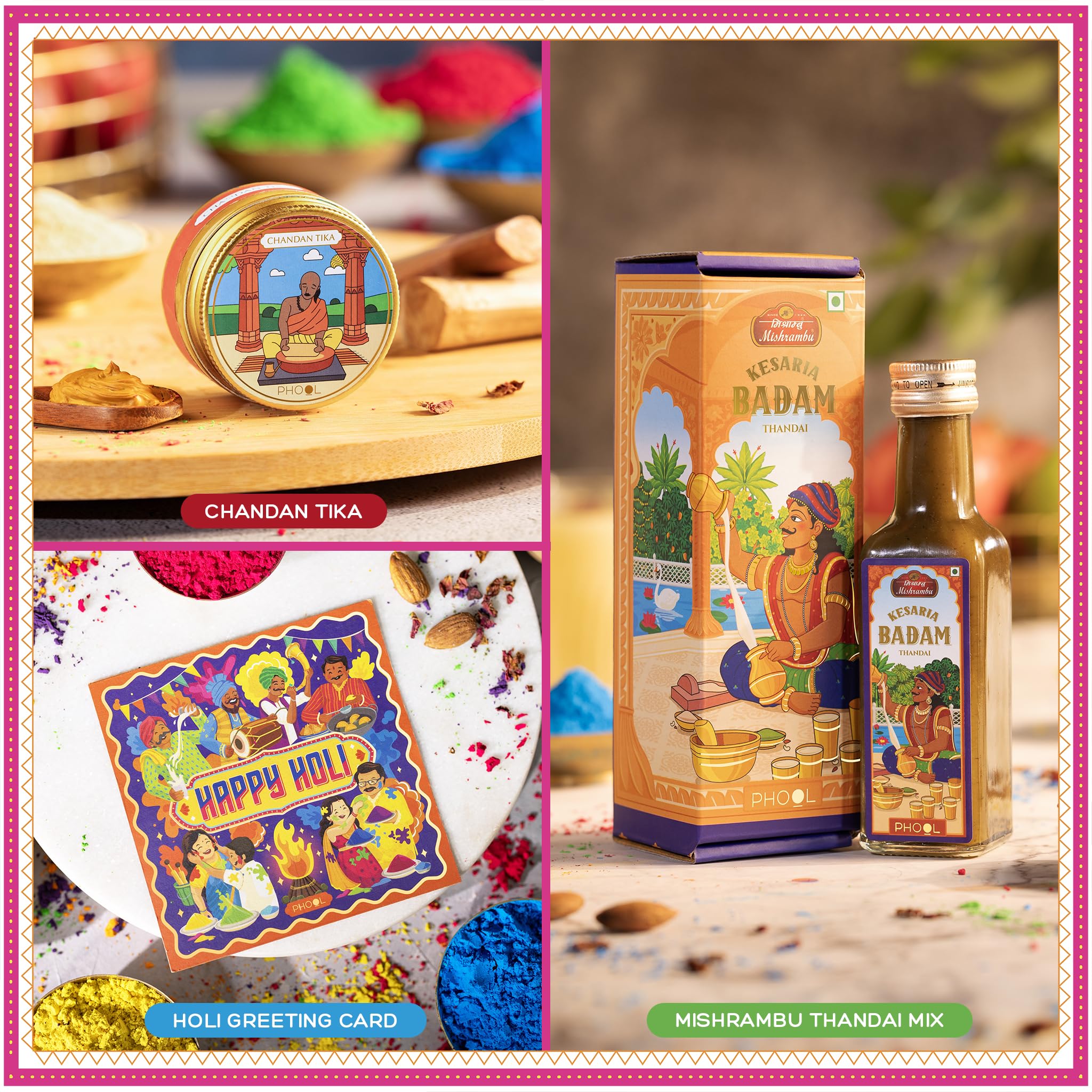 Phool Vrindavan Holi Gulal Collection 4 Vibrant Natural Gulaal Colors with Mishrambu Kesaria Thandai, Chandan Tika, & Holi Greeting Card Premium Holi gulal box Holi colours