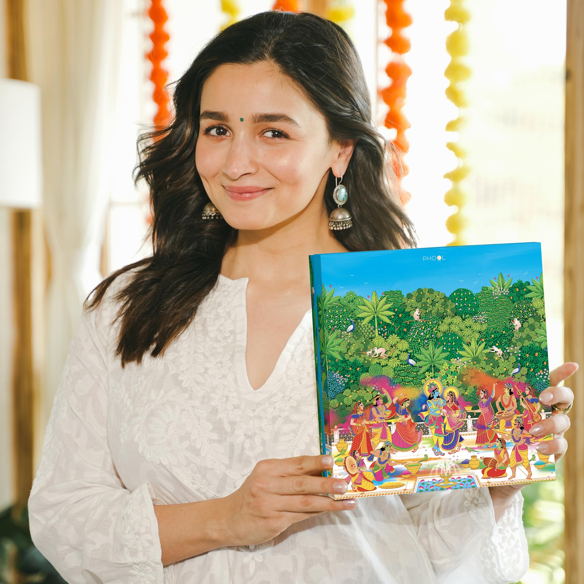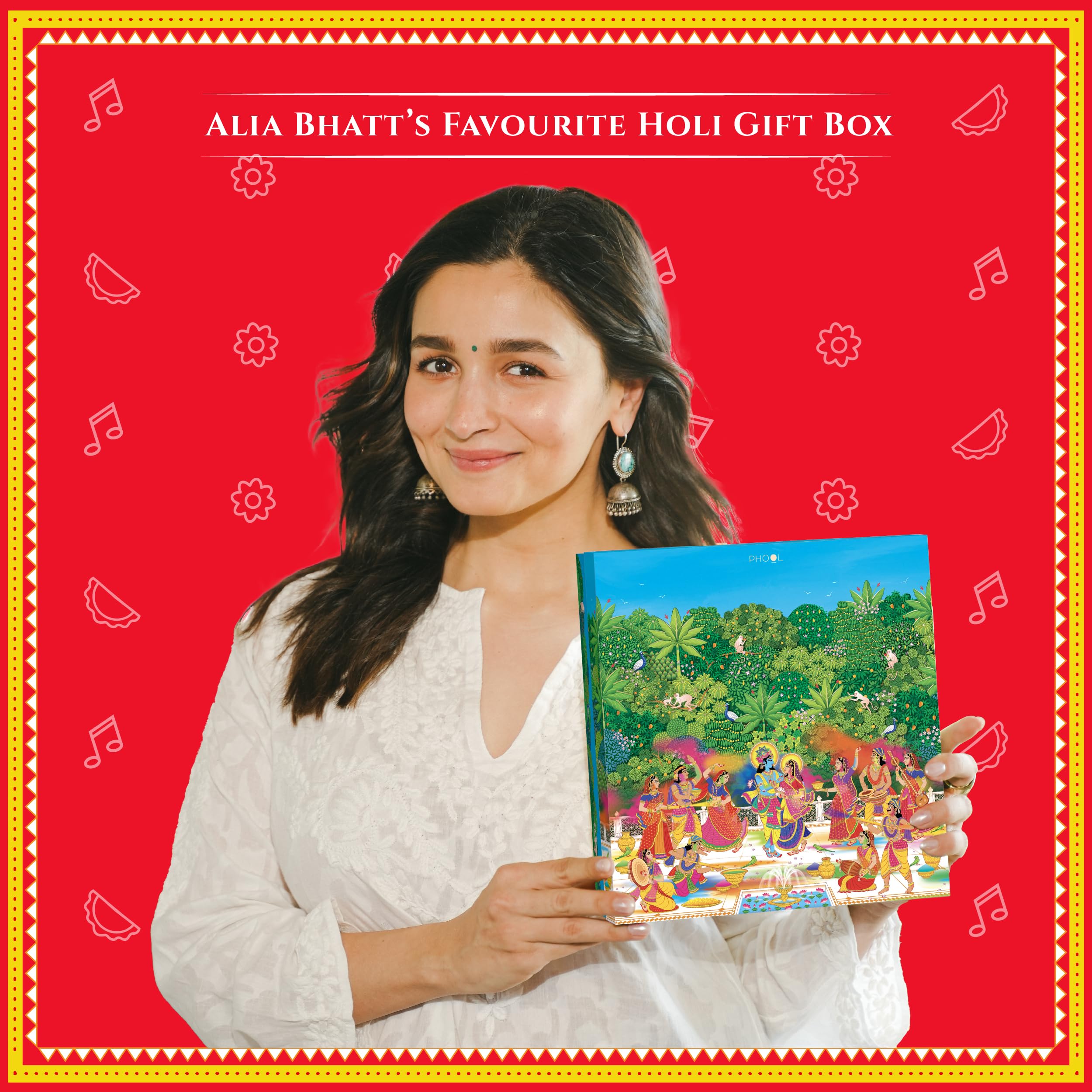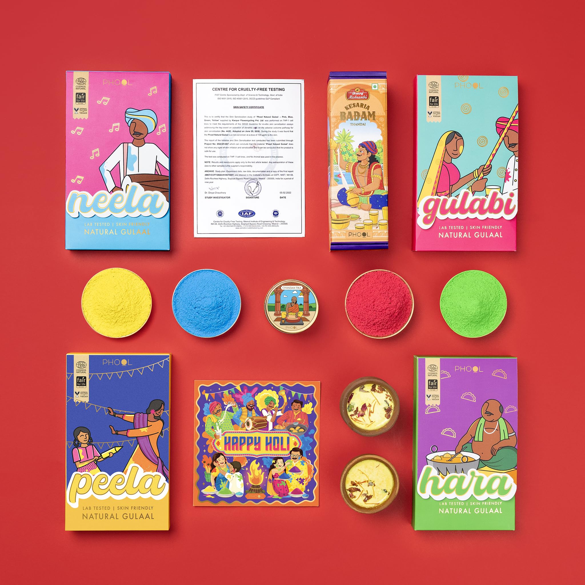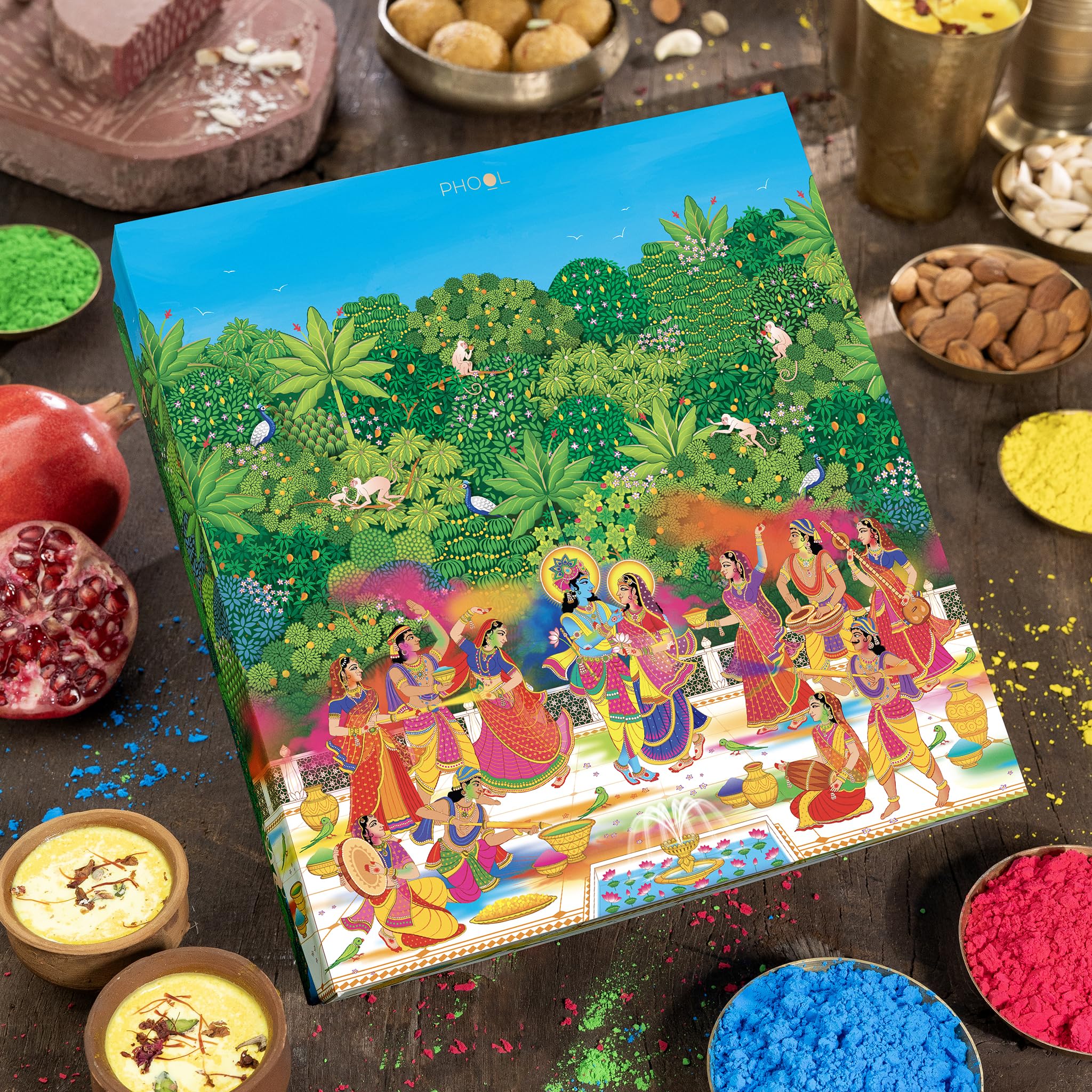 Phool Vrindavan Holi Gulal Collection 4 Vibrant Natural Gulaal Colors with Mishrambu Kesaria Thandai, Chandan Tika, & Holi Greeting Card Premium Holi gulal box Holi colours