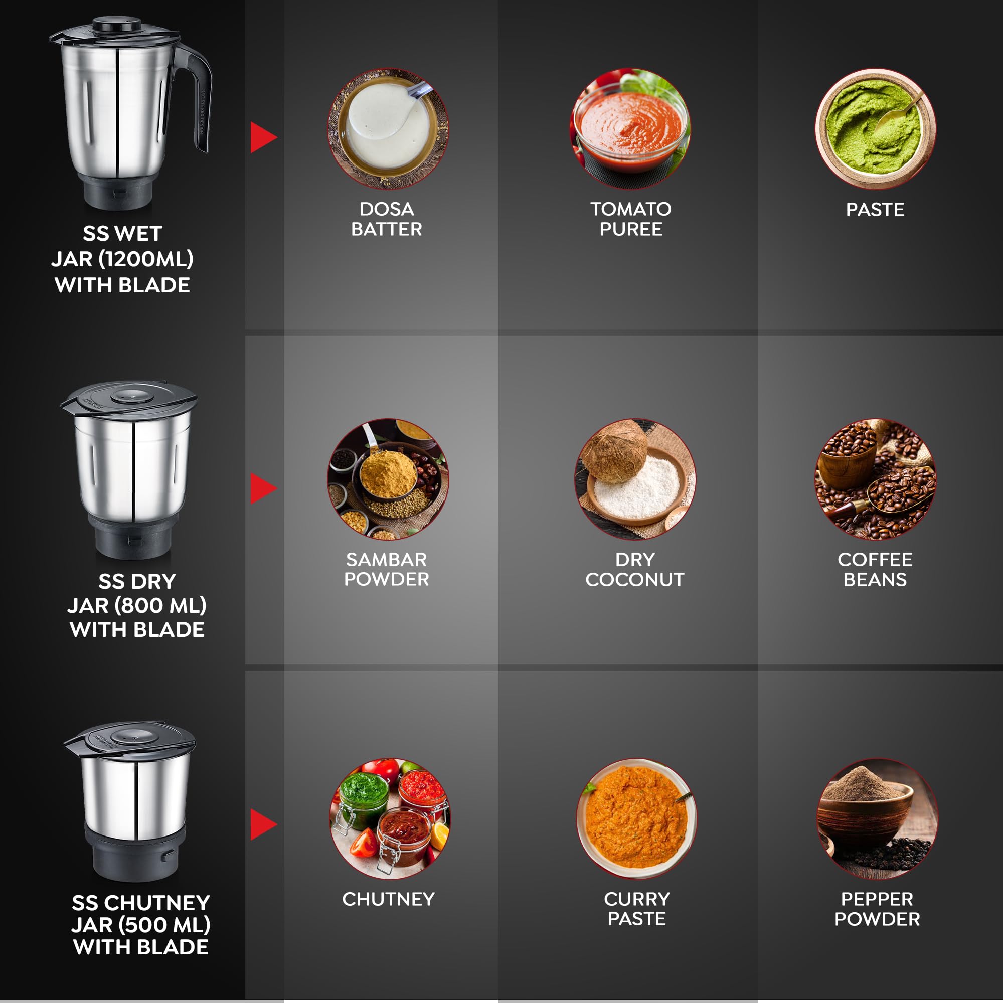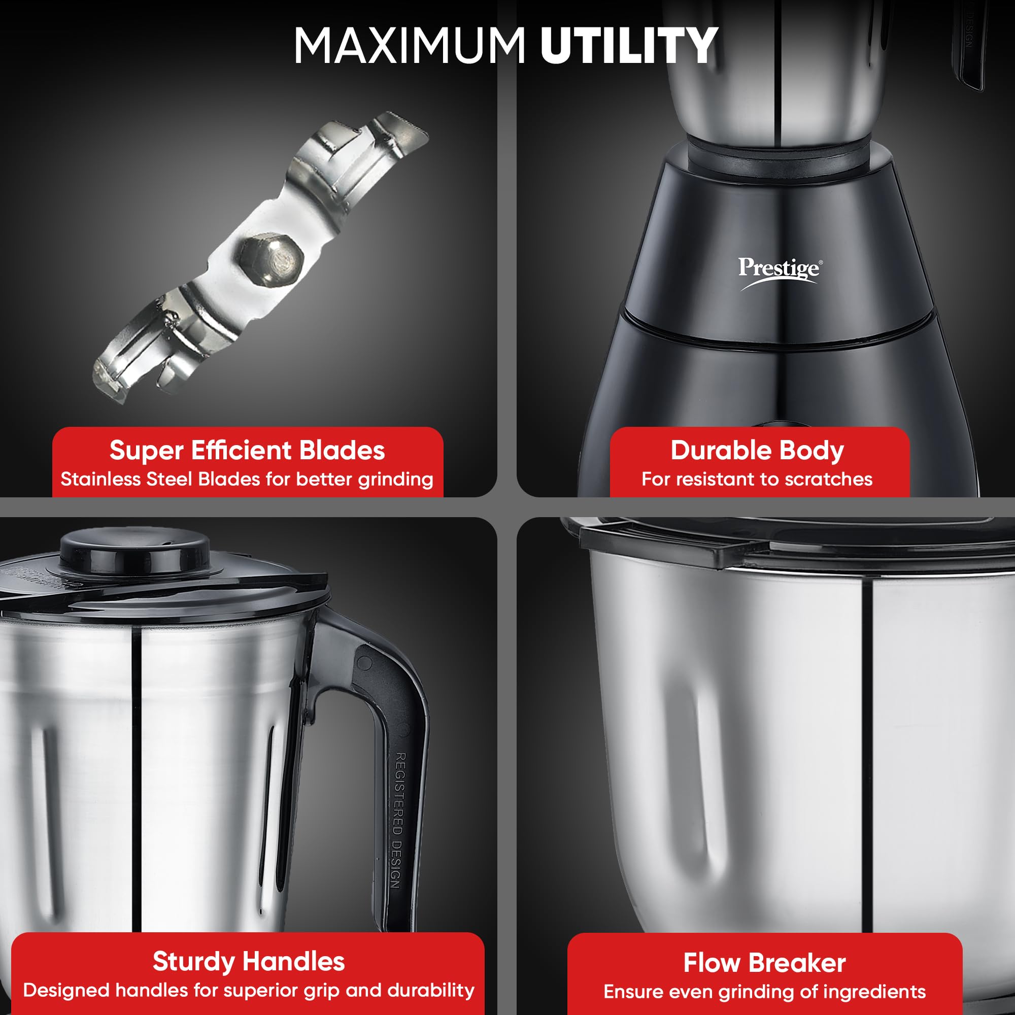 Brand: PrestigeColor: BlackFeatures: CAPACITY of JARS: Wet Grinding Jar: 1.2L, Dry Grinding Jar: 700ml and Chutney Jar: 400ml, grinds tough... Read more