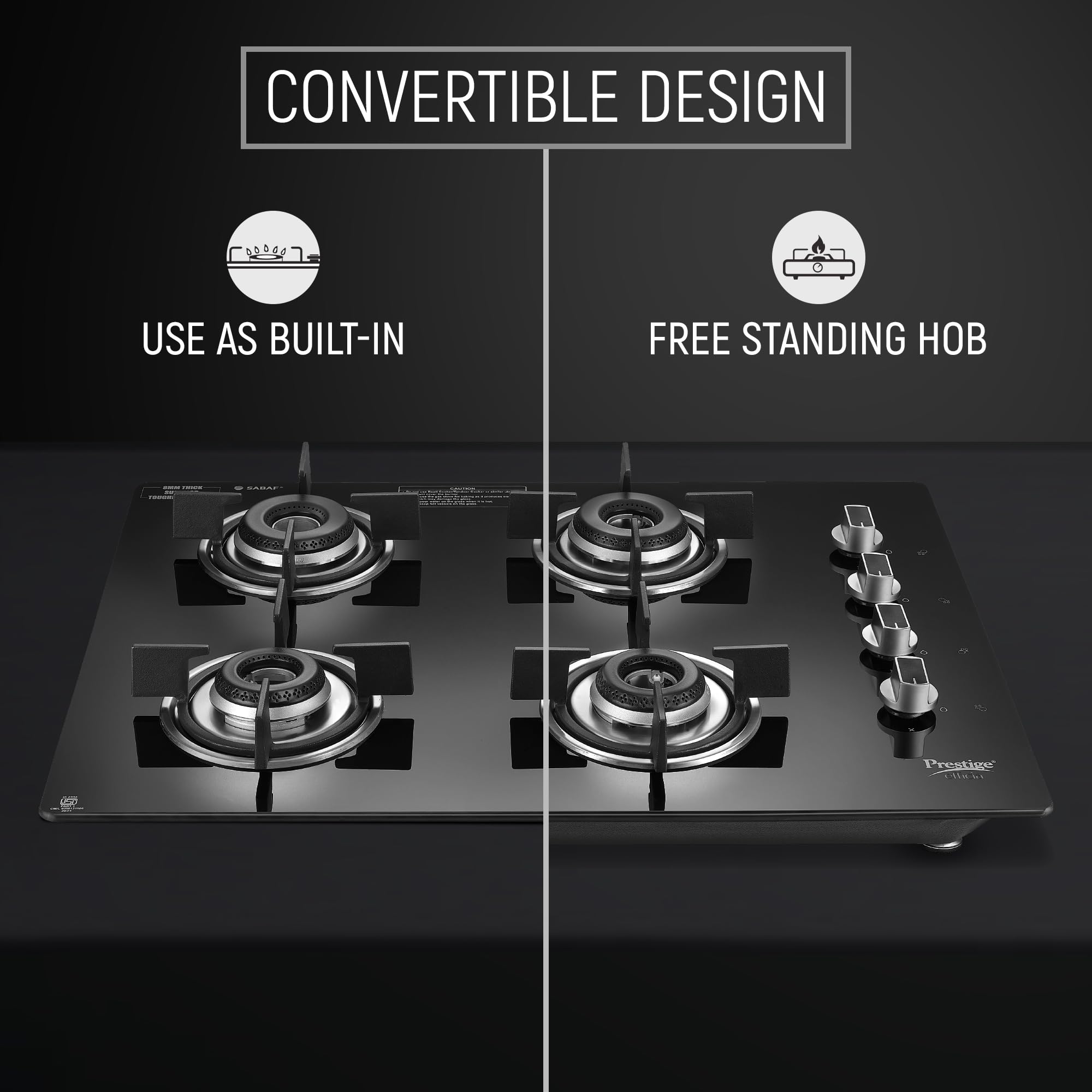 Prestige Efficia Convertible 4 Burner Glasstop Hob|One-Touch Advance Auto-Ignition|Cast-Iron Pan Support|Toughened Glass|SABAF Burners|Ultra-Slim Body|5 Years Warranty on Glass|Black