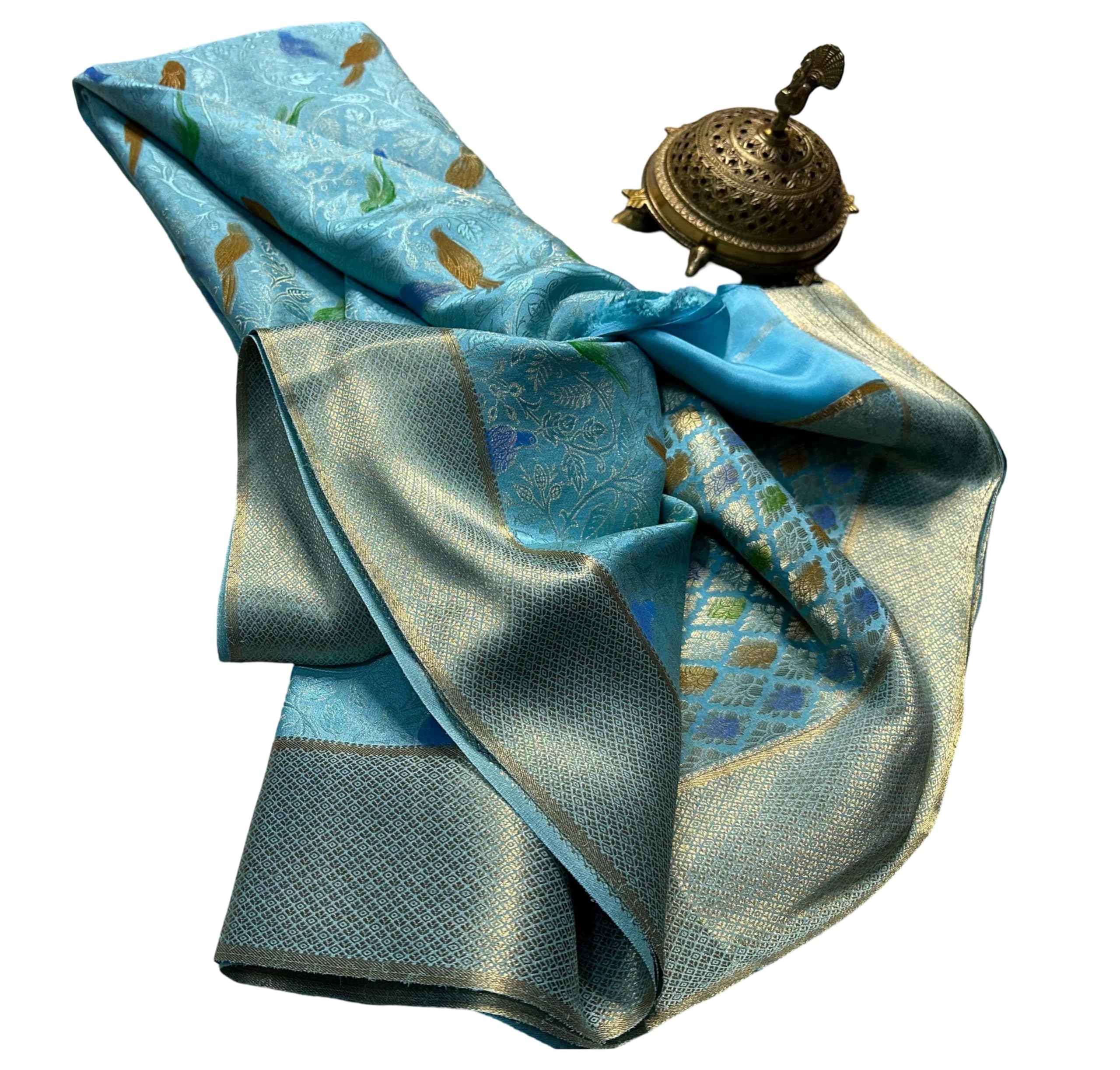 Pure Brocade Mysore Silk Sarees, Jacquard Blouse, Parrots Design, Blue Saree