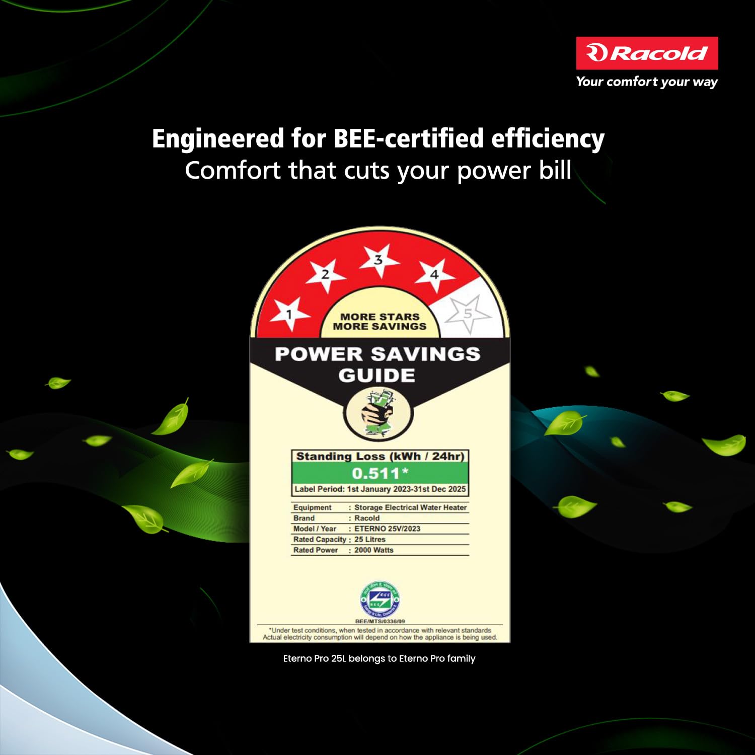 Racold Eterno Pro Storage Water Heater (Geyser) 25L with ABS Body – Corrosion Prevention with Titanium Enameled Coating, 7 Yrs Warranty on Tank, Energy Efficient, Free Standard Installation & Pipes