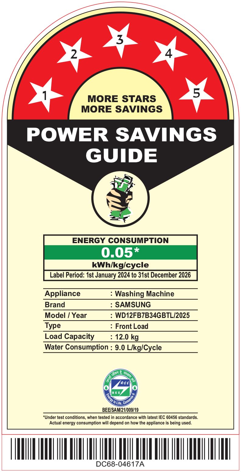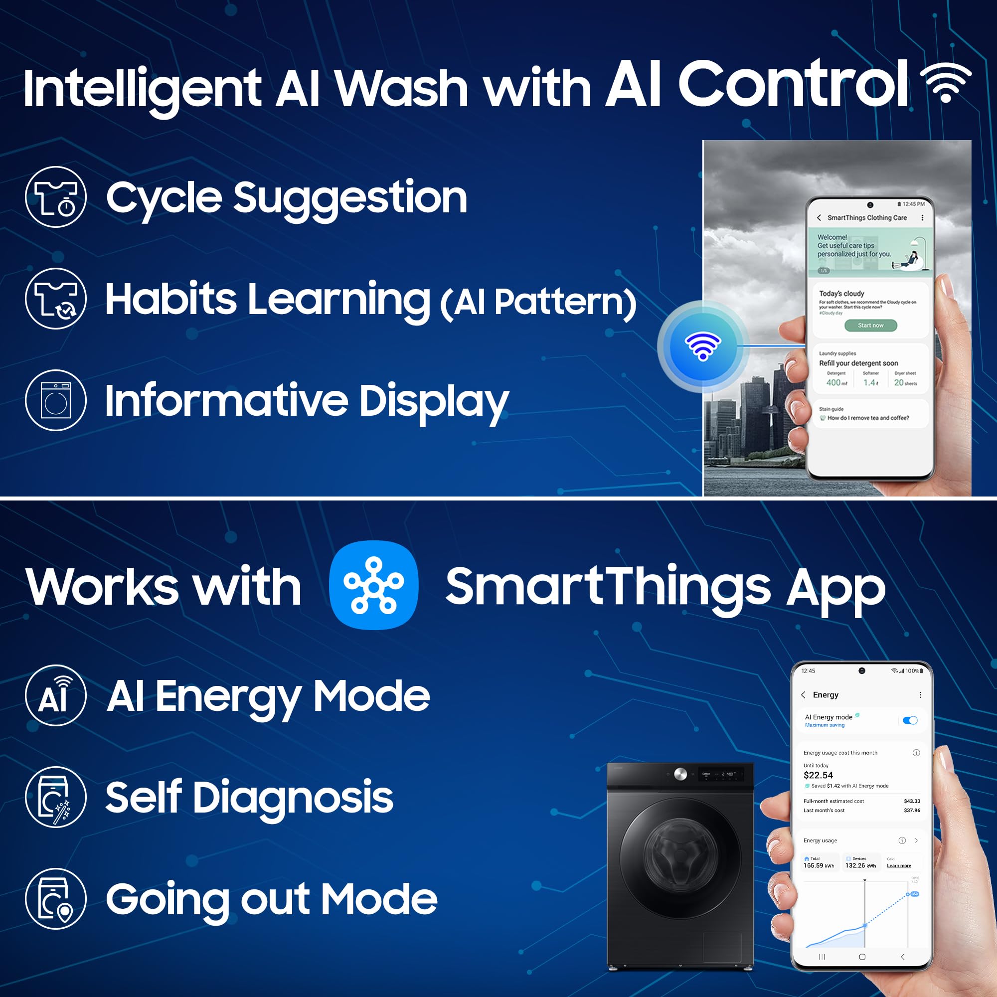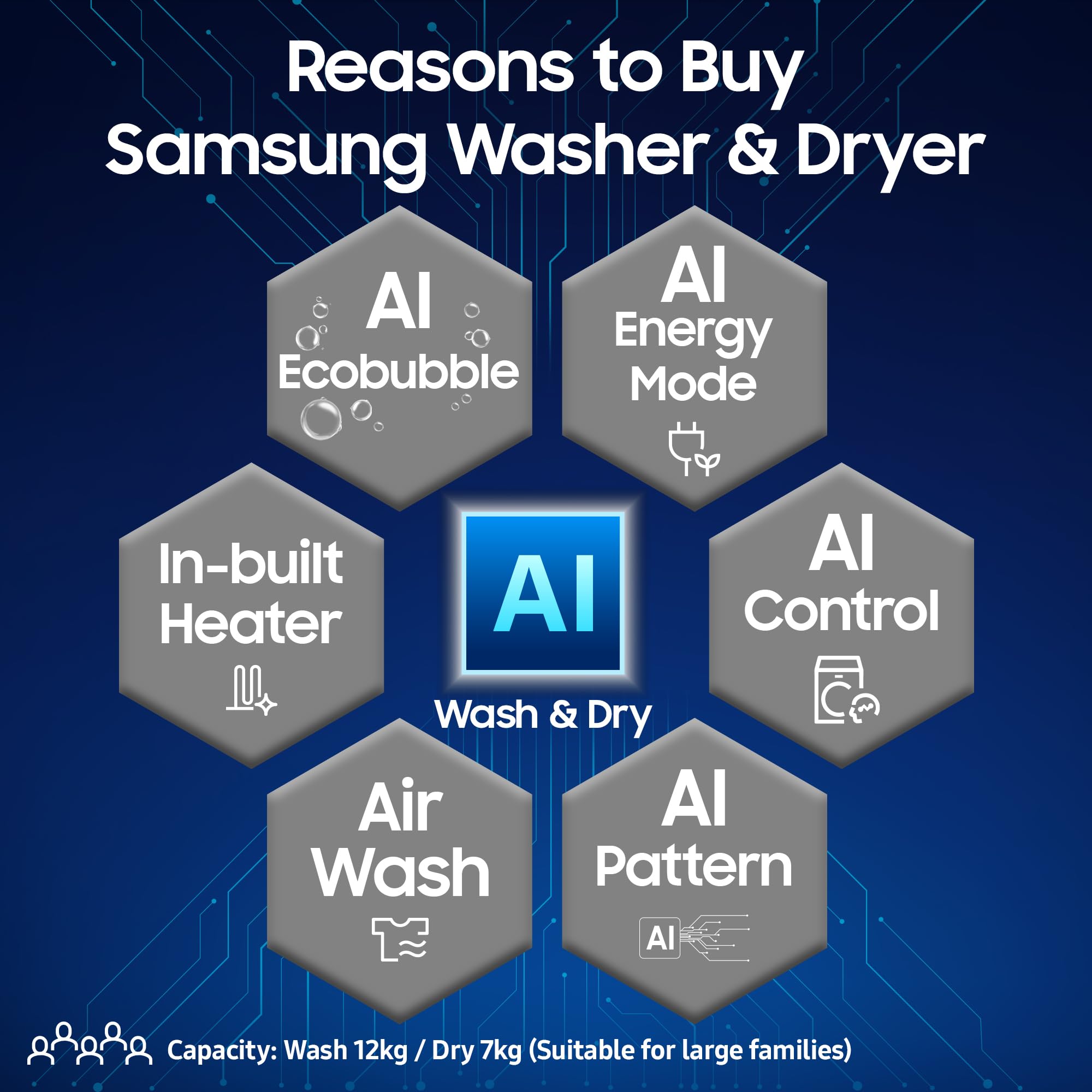 Samsung 12 kg (Wash) / 7 kg (Dry), 5 Star, AI EcoBubble, AI Control, AI Energy Mode, Air Wash, Hygiene Steam, Wi-Fi, Digital Inverter, Fully-Automatic Front Load Washer Dryer (WD12FB7B34GBTL, Black)