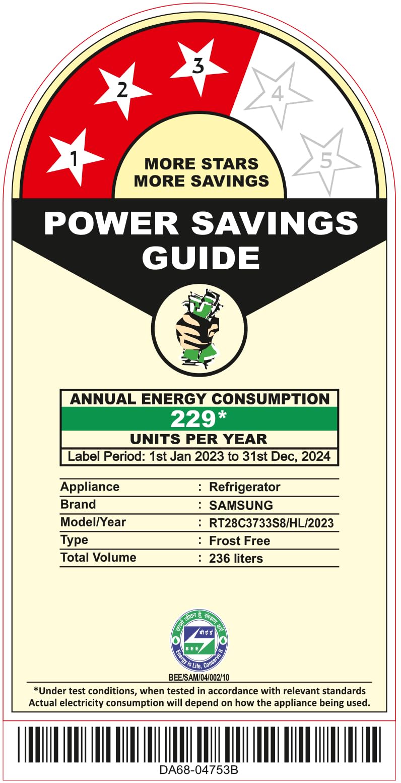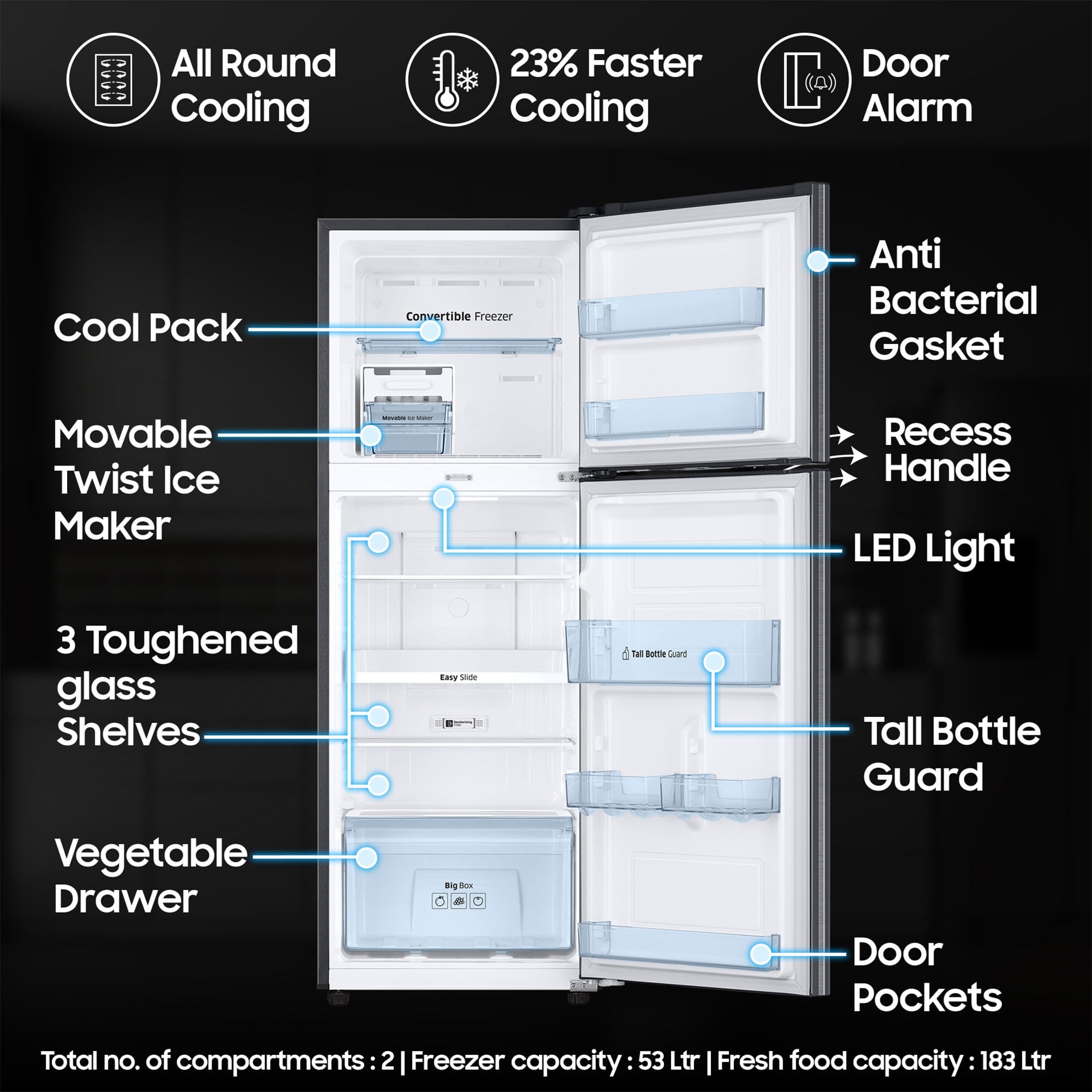 Samsung 236 L, 3 Star, Convertible, Digital Inverter with Display Frost Free Double Door Refrigerator (RT28C3733S8/HL, Silver, Elegant Inox)