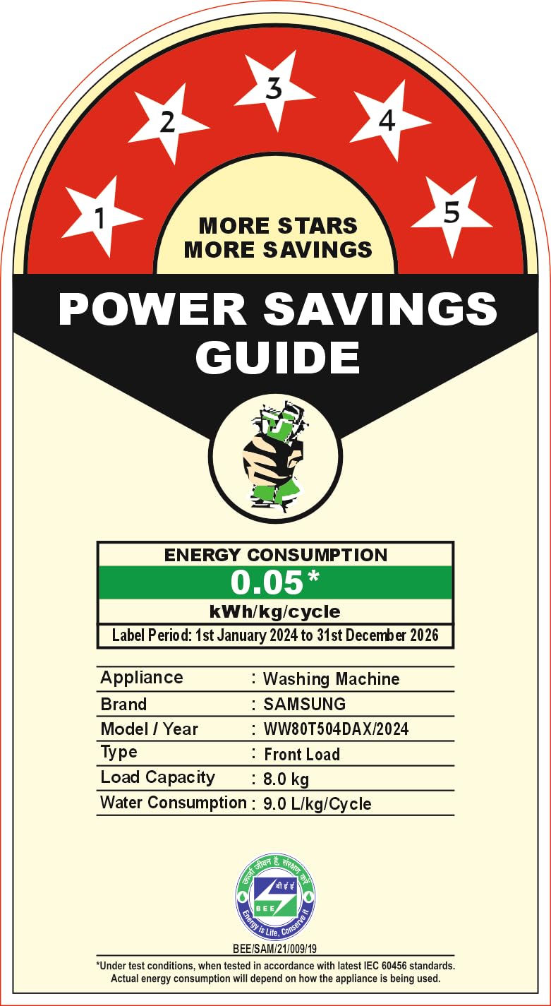 Samsung 8 kg, 5 star, Eco Bubble Technology, AI Control, Wi-Fi, Digital Inverter, Motor, Fully-Automatic Front Load Washing Machine (WW80T504DAX1TL, Hygiene Steam, Inox)