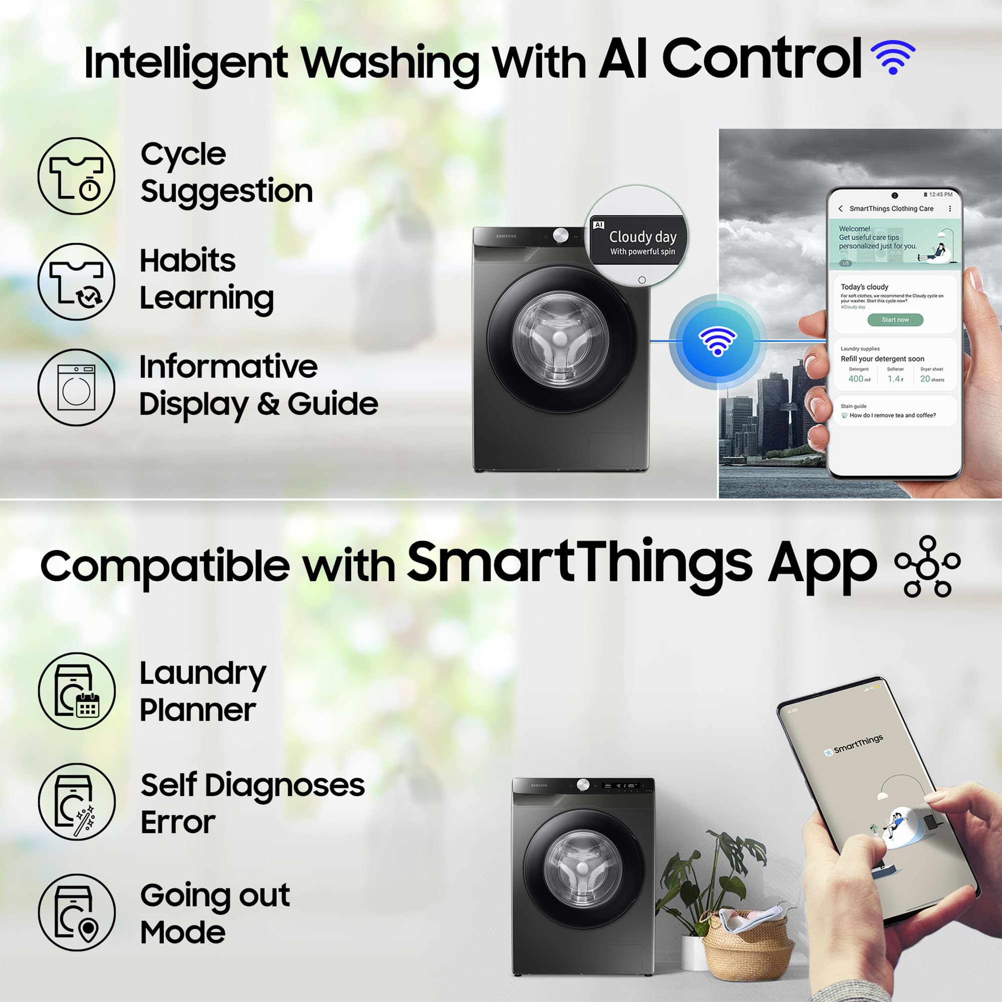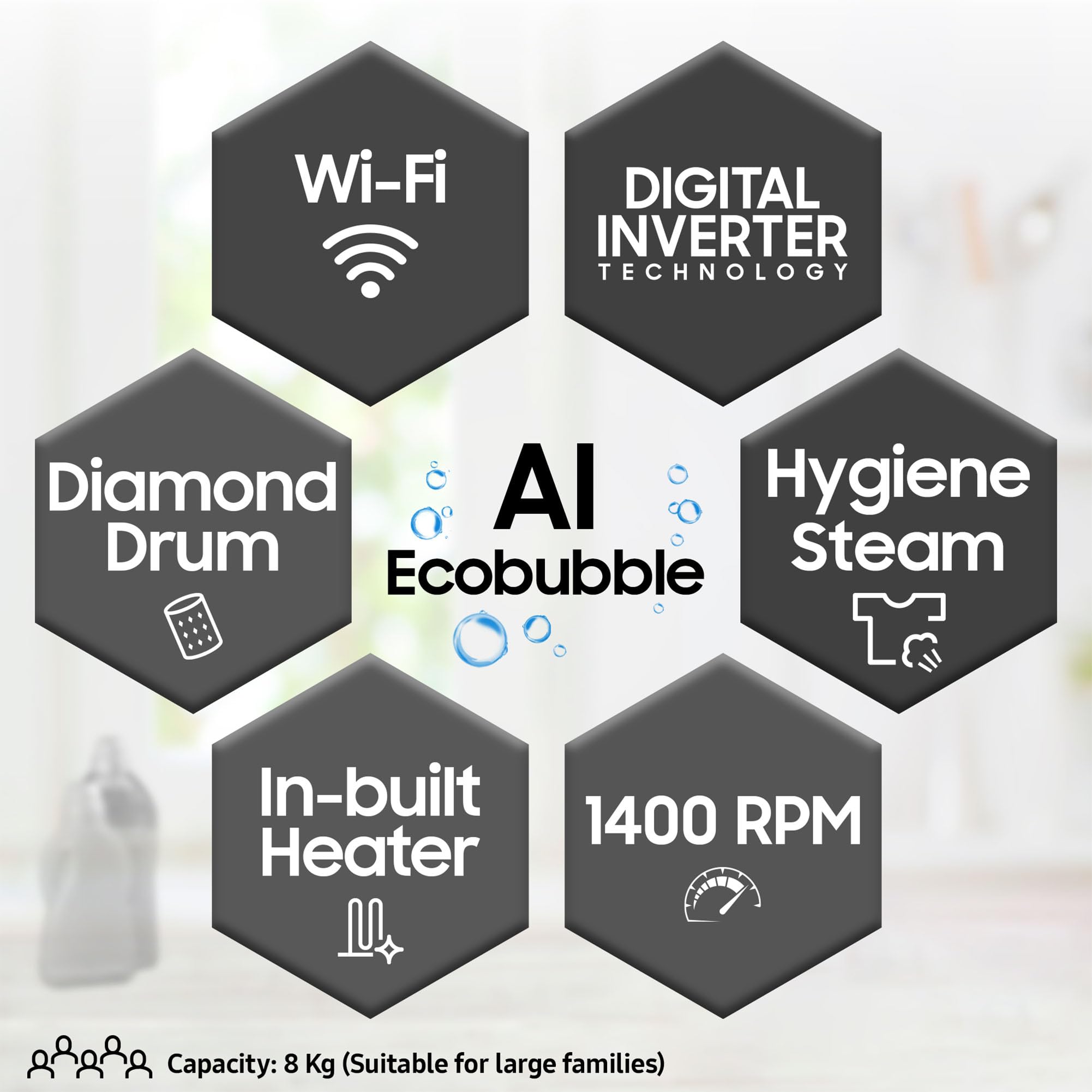 Brand: SamsungColor: InoxFeatures: Fully-automatic front load washing machine with Ecobubble and Bubble Soak Technology | AI Control and Wi-Fi Technology... Read more