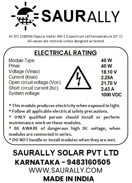 SAURALLY - A RENEWABLE INDIA. MADE IN INDIA! Aluminium Solar 40W 12V Solar Panel, 67 x 43 Cm