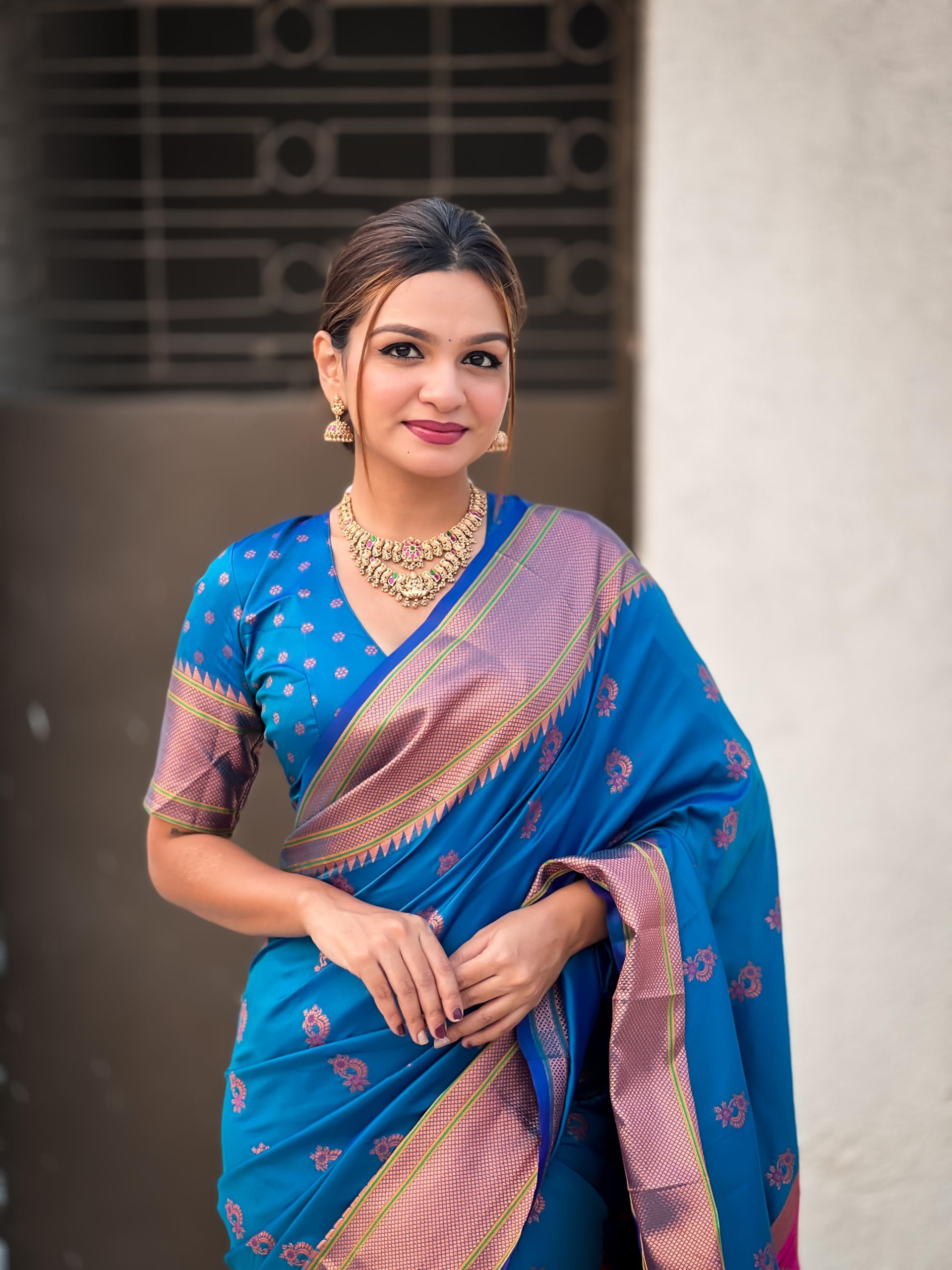 SGF11 Women's Kanjivaram Paithani Pure Soft Silk Saree For Womens With Blouse Piece (Blue)