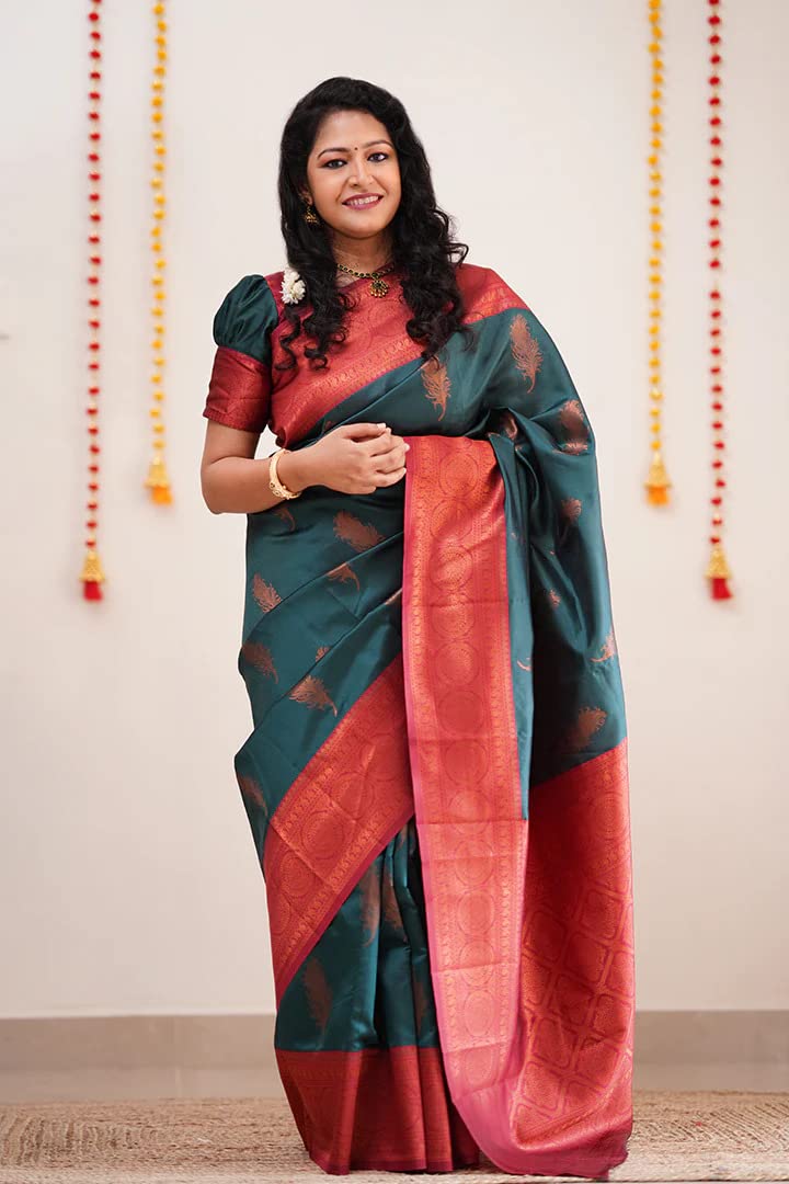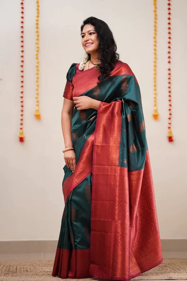 SGF11 Women's Kanjivaram Soft Lichi Silk Saree With Blouse Piece (Rama Green)