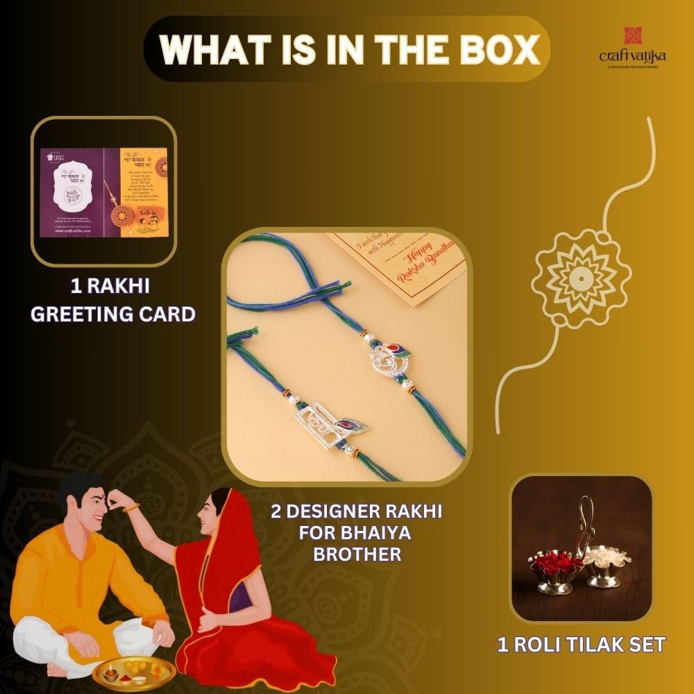 Silver Rakhi Set of 2 for Brother Boy - Krishna Peacock Rakhi for Bhaiya Bhabhi and Kids with Greeting Card Set