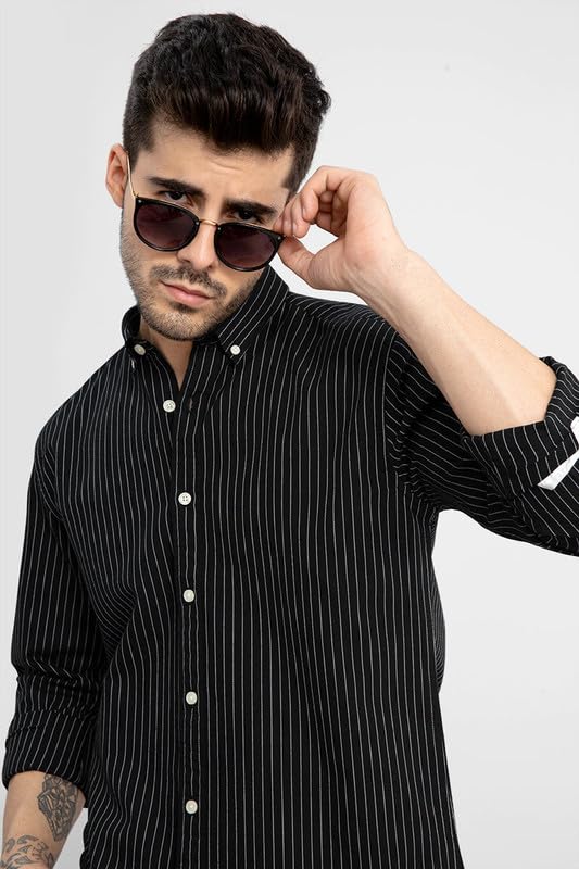 Brand: SNITCHColor: BlackFeatures: Long Sleeves|Stripe Design|Spread Collar|Curved Hem Design|Spare Buttons Included SPECIFICATION|100% Cotton|Slim Fit|Model is wearing a M size |6... Read more