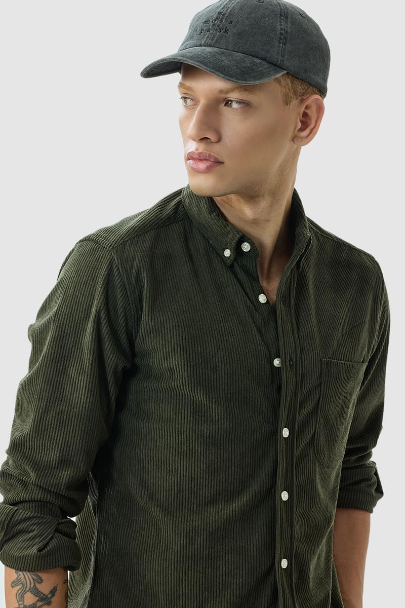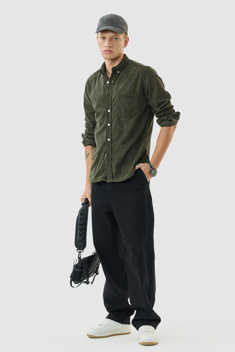 SNITCH Men's Casual Shirt | Slim Fit Long Sleeve Button Down Collar Solid Pattern | 100% Polyester Textured Fabric, Machine Washable | Olive Green
