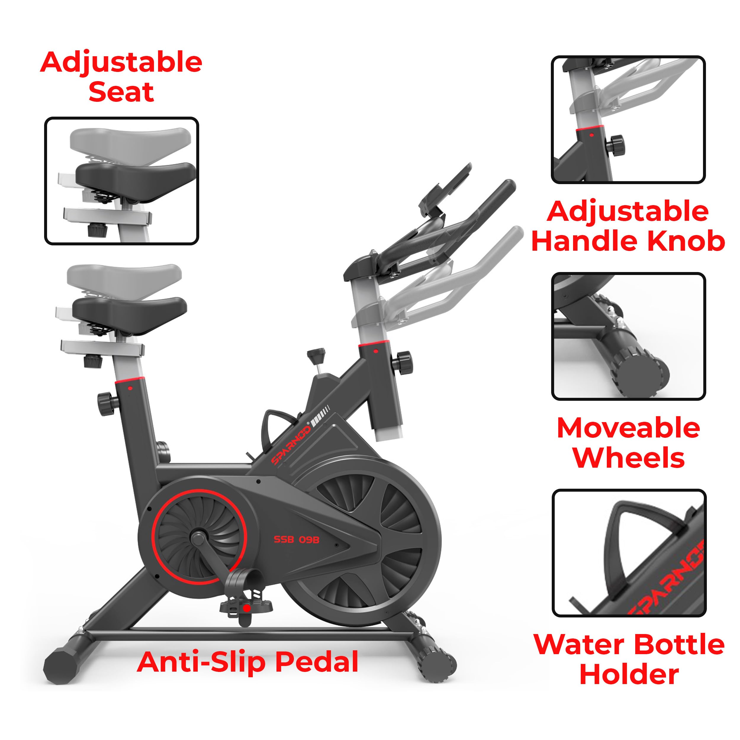 Sparnod Fitness SSB-09B Spin Bike for Home Workout with Belt Drive, 9KG Flywheel, Adjustable Seat & Handlebar, Friction Resistance, LCD Display, Tablet Holder, Max User Weight 110KG (Black)