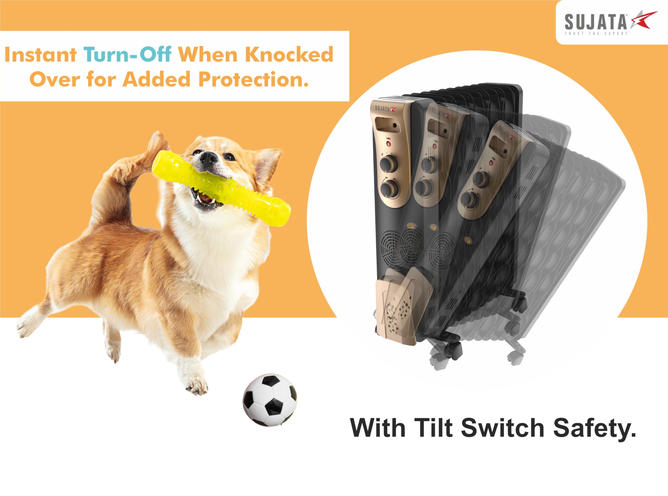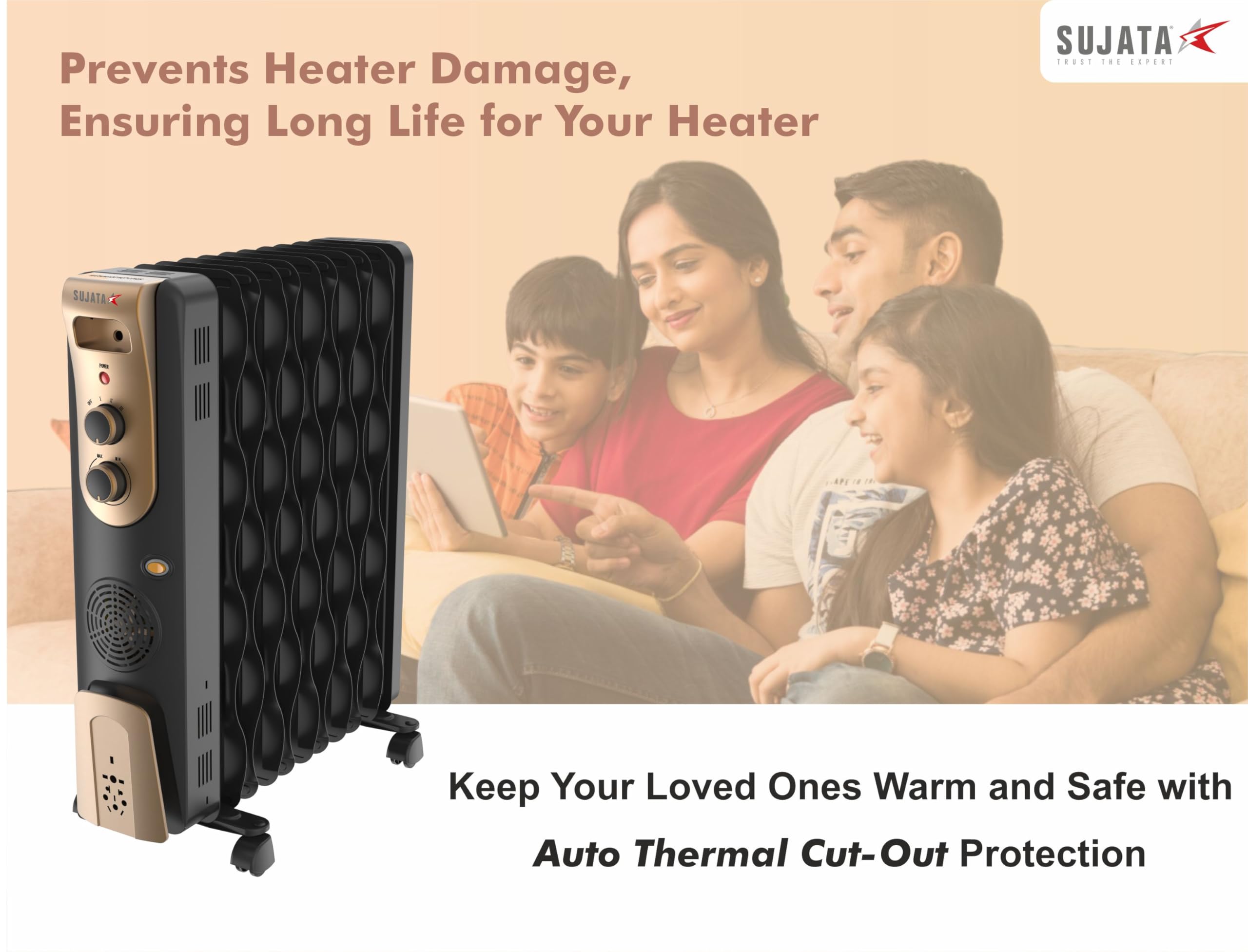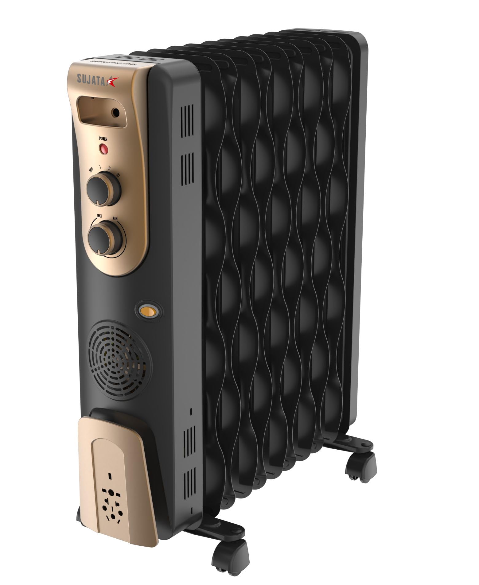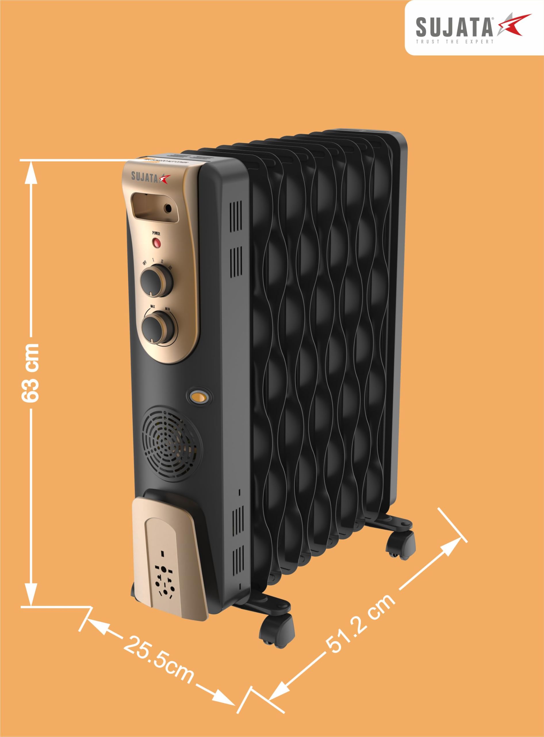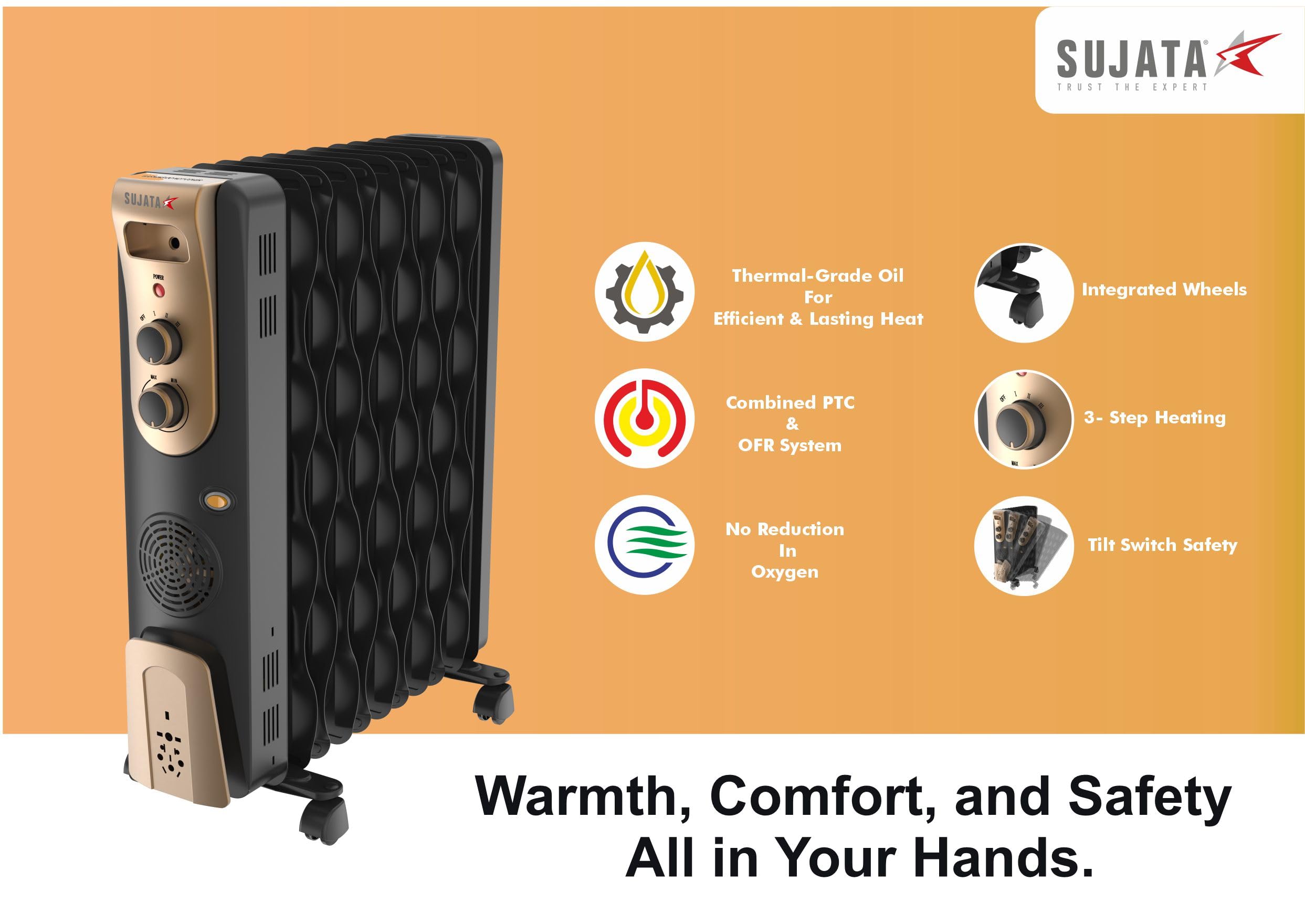 Sujata 11 Fin Oil Heaters For Home | 2 Years Warranty, 2900W | Oil Heater, Oil Heater For Room In Winter, 2 Meter Long Wire, 3 Heat Setting, PTC Fan Heater, ISI Approved, Tilt Switch Safety-Black Gold