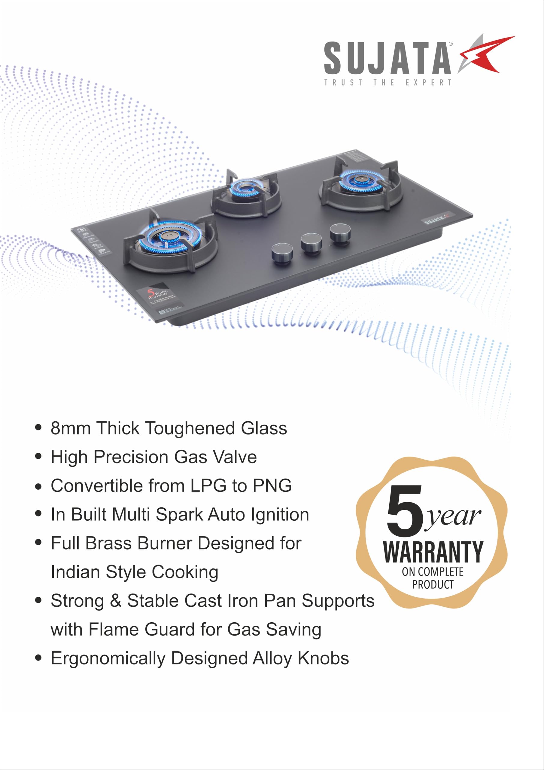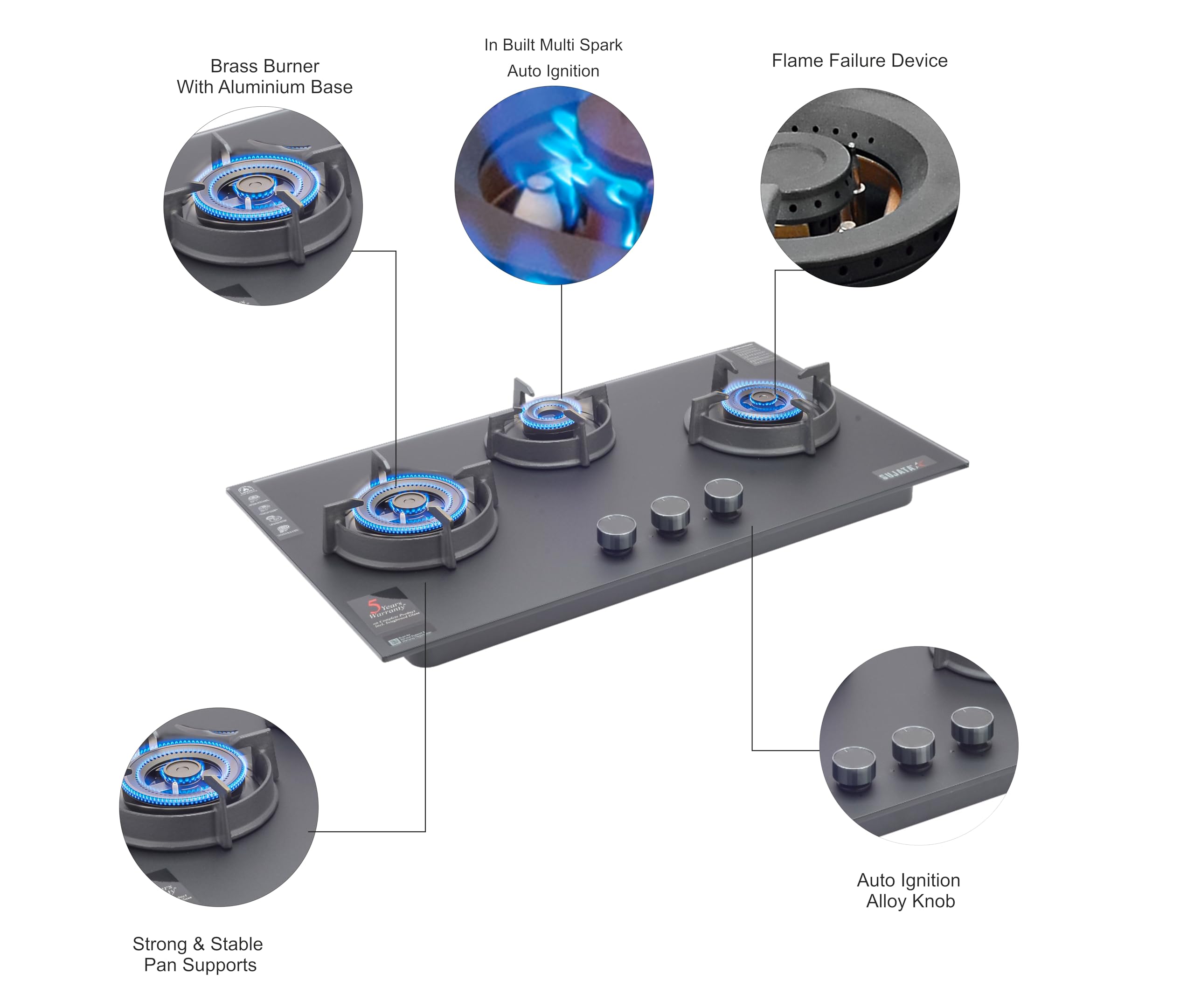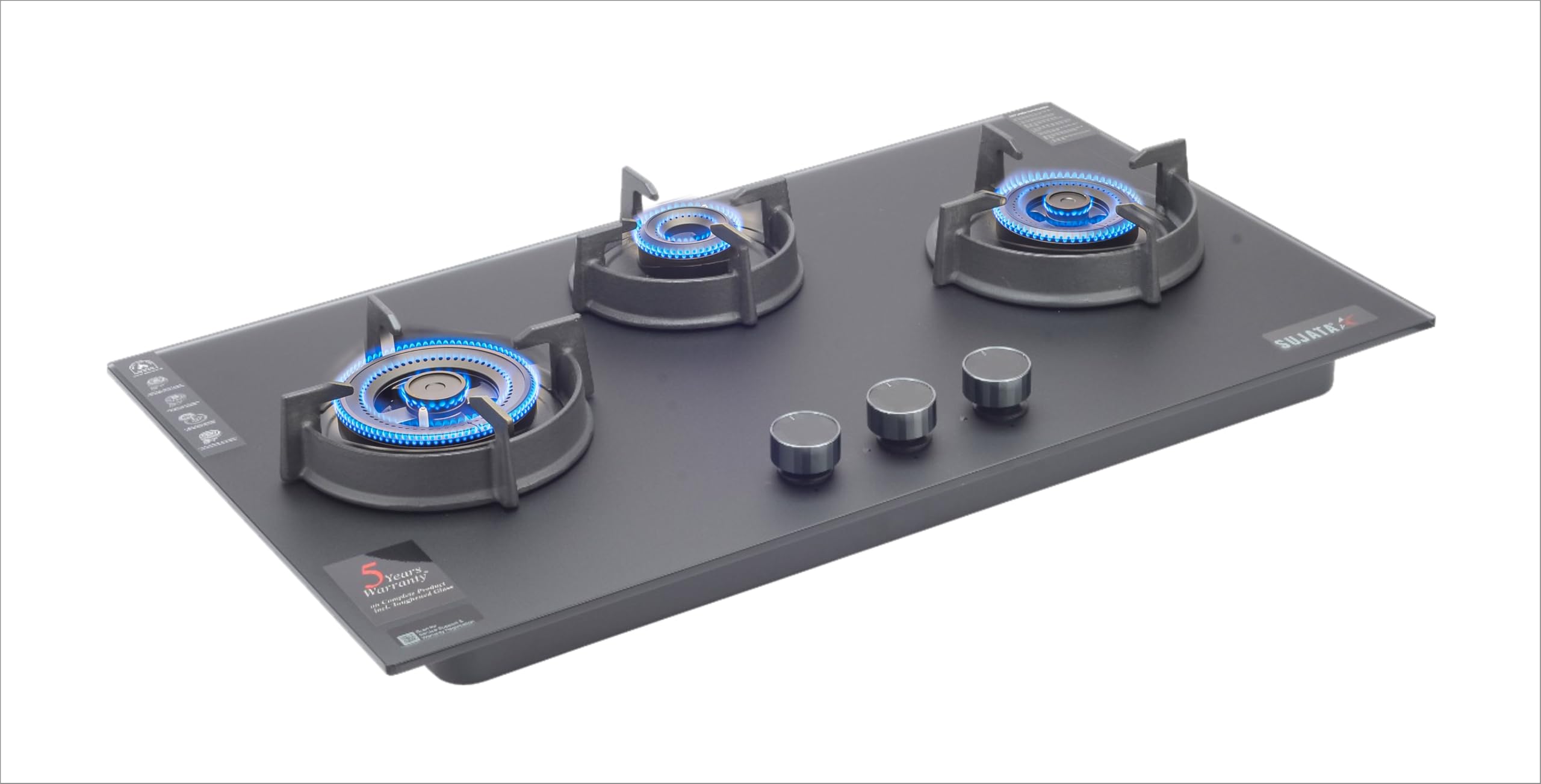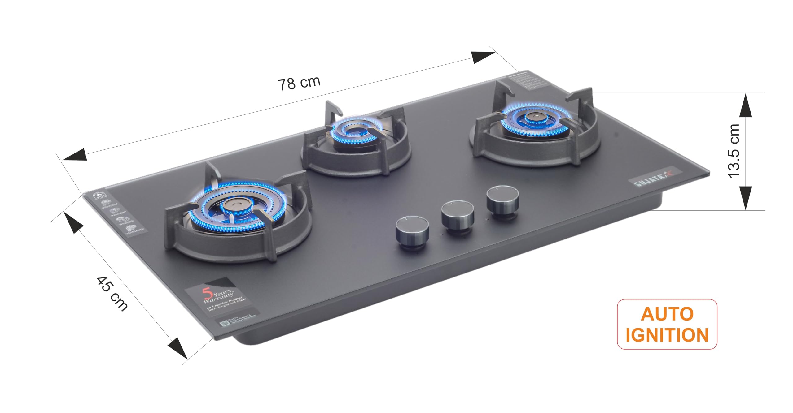 Brand: SujataColor: BlackFeatures: 8mm Thick Matt Finish Toughened Glass In-Built Multi spark Auto Ignition Full Brass Burner with FFD Fully... Read more