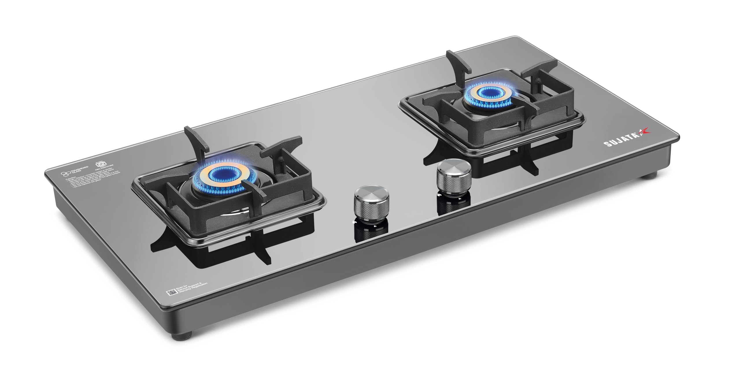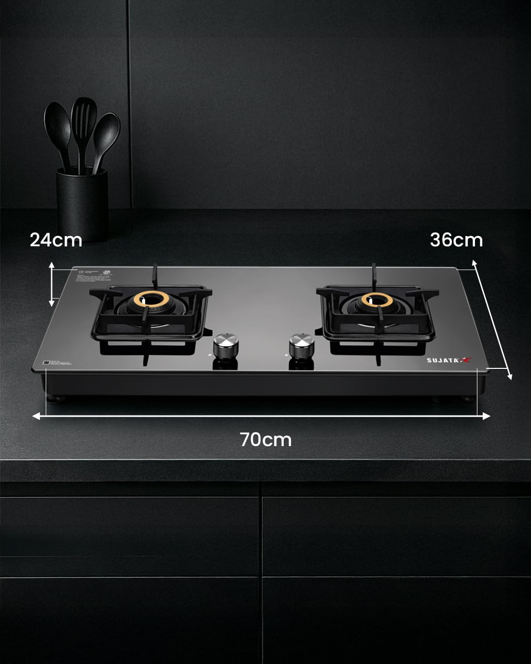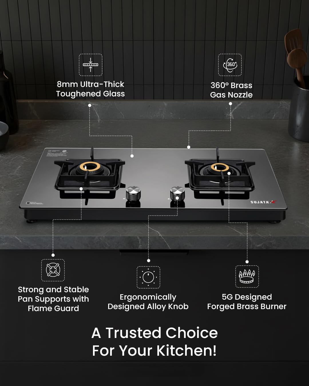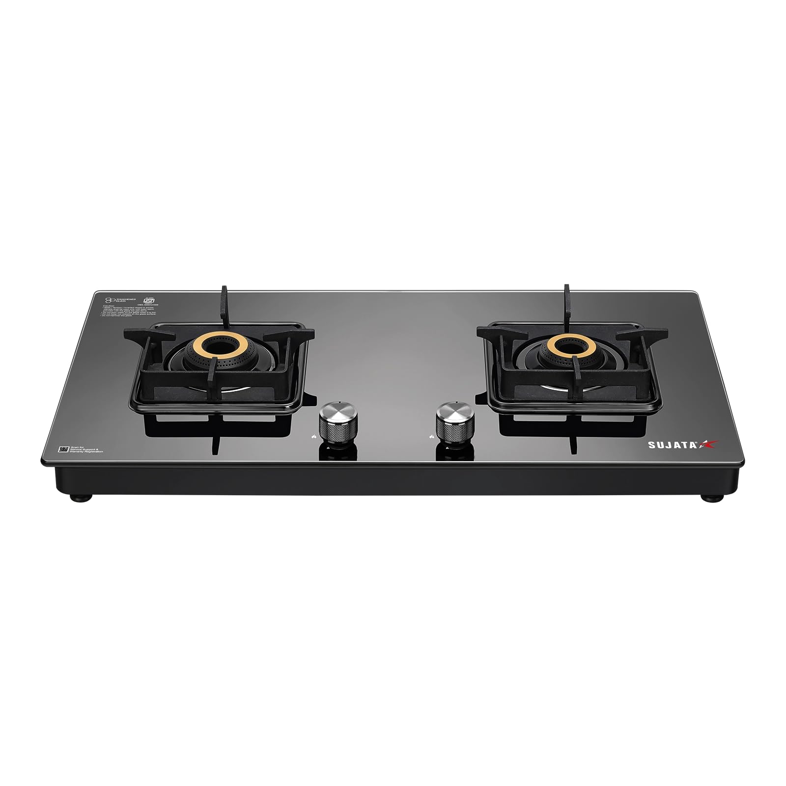 Sujata Premium Gas Stove | 9 Years Warranty | 2 burner gas stove, 2 Burner Gas Stove Glass Top, SABAF, ISI Certified, LPG & PNG Compatible, 360° Rotating Brass Gas Nozzle, Brass Burner (Black)