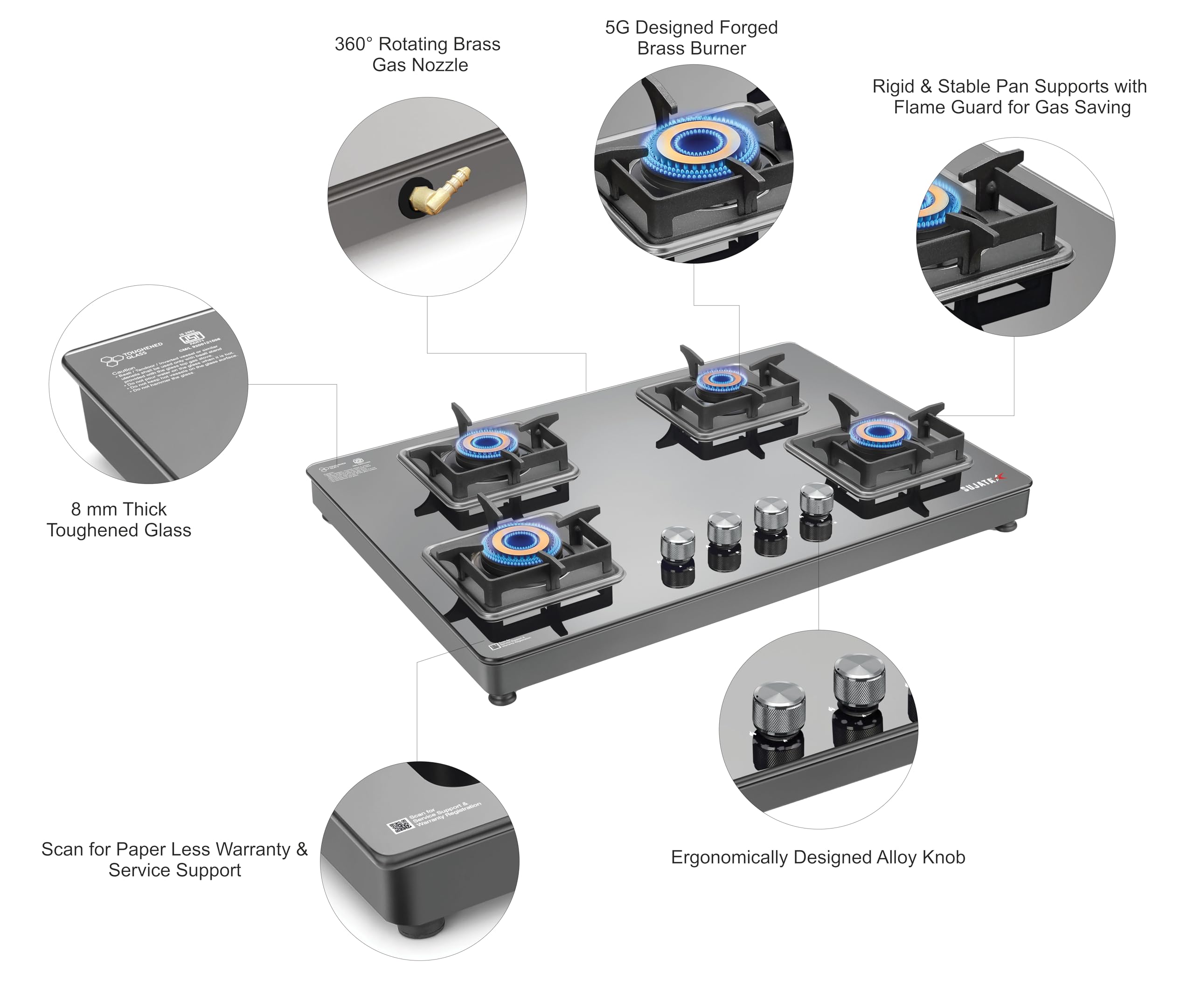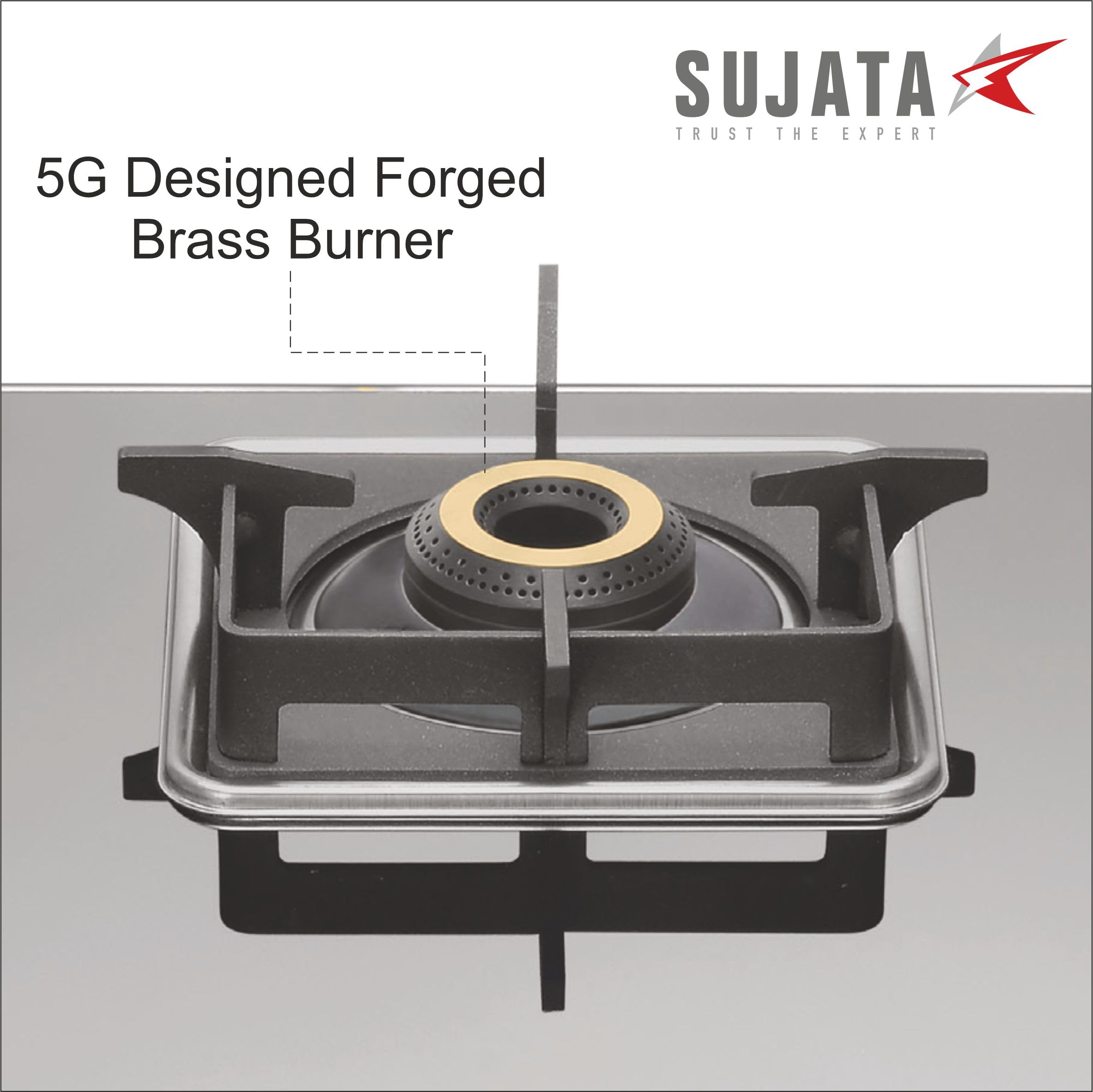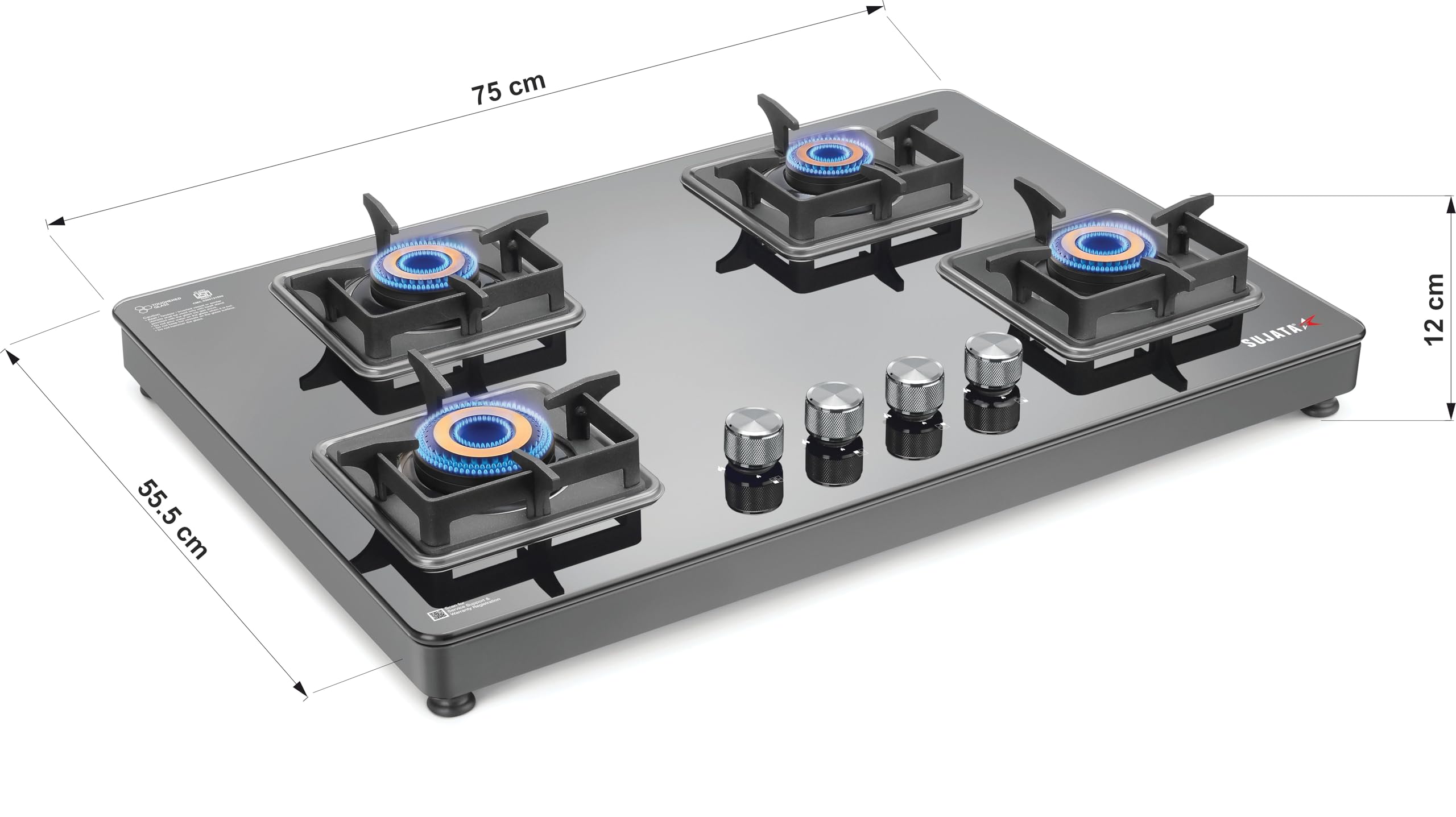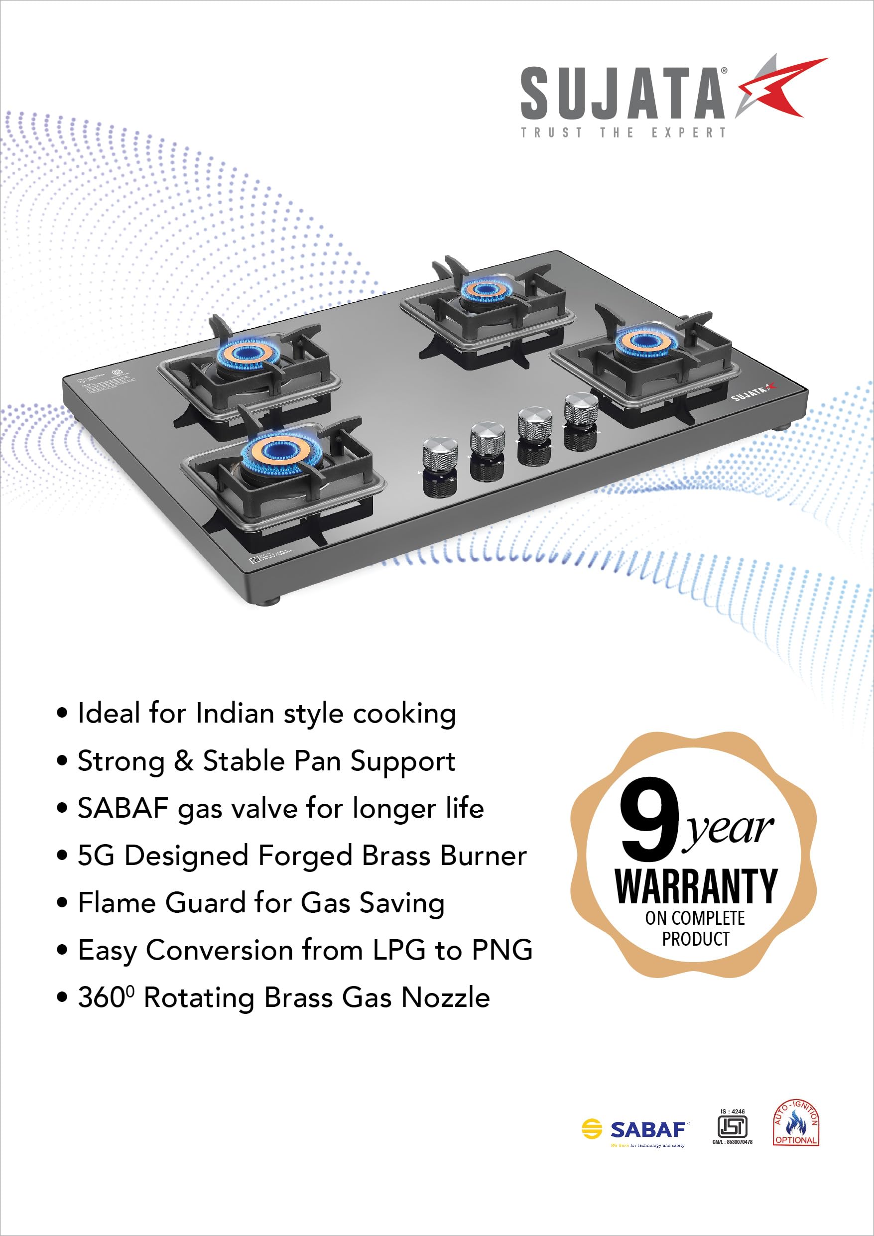 Sujata Premium Gas Stove | 9 Years Warranty | 4 Burner Gas Stove Glass Top, SABAF, ISI Certified, LPG & PNG Compatible, 360° Rotating Brass Gas Nozzle, Jumbo Brass Burner (Black)