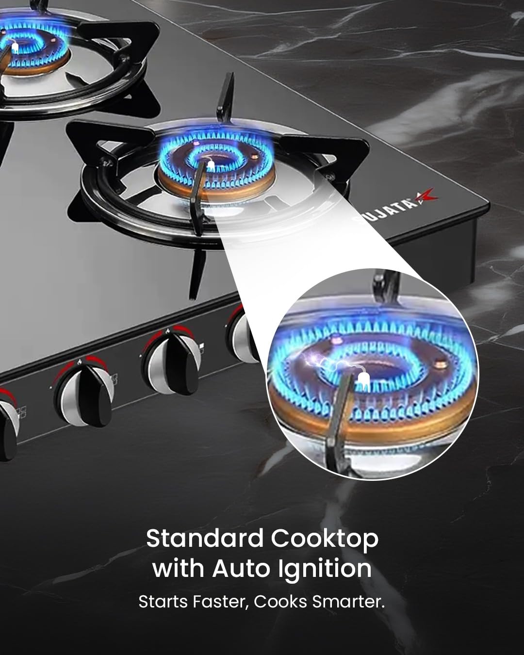 Sujata Standard Auto Ignition Gas Stove 4 Burners | 9 Years Warranty | 4 Burner Gas Stove Glass Top, Stove 4 Burner, ISI Certified, SABAF Valve, LPG & PNG Compatible, 360° Rotating Nozzle (Black)