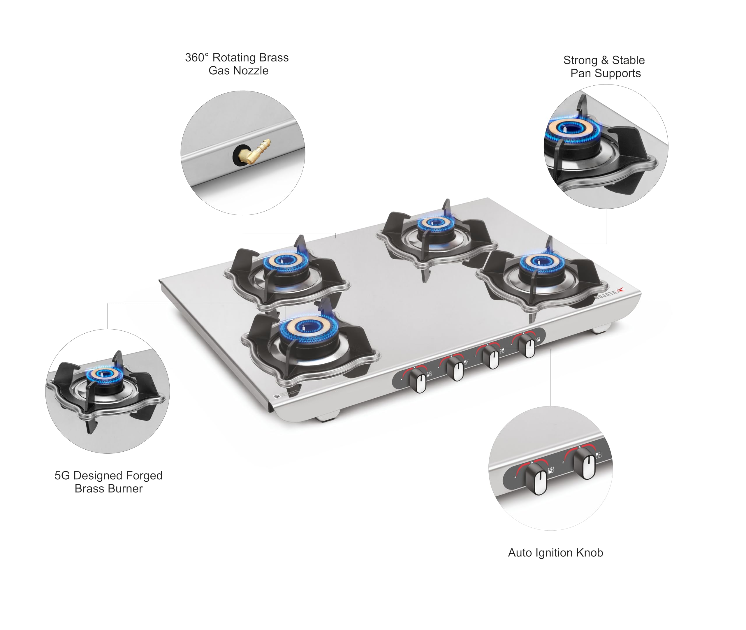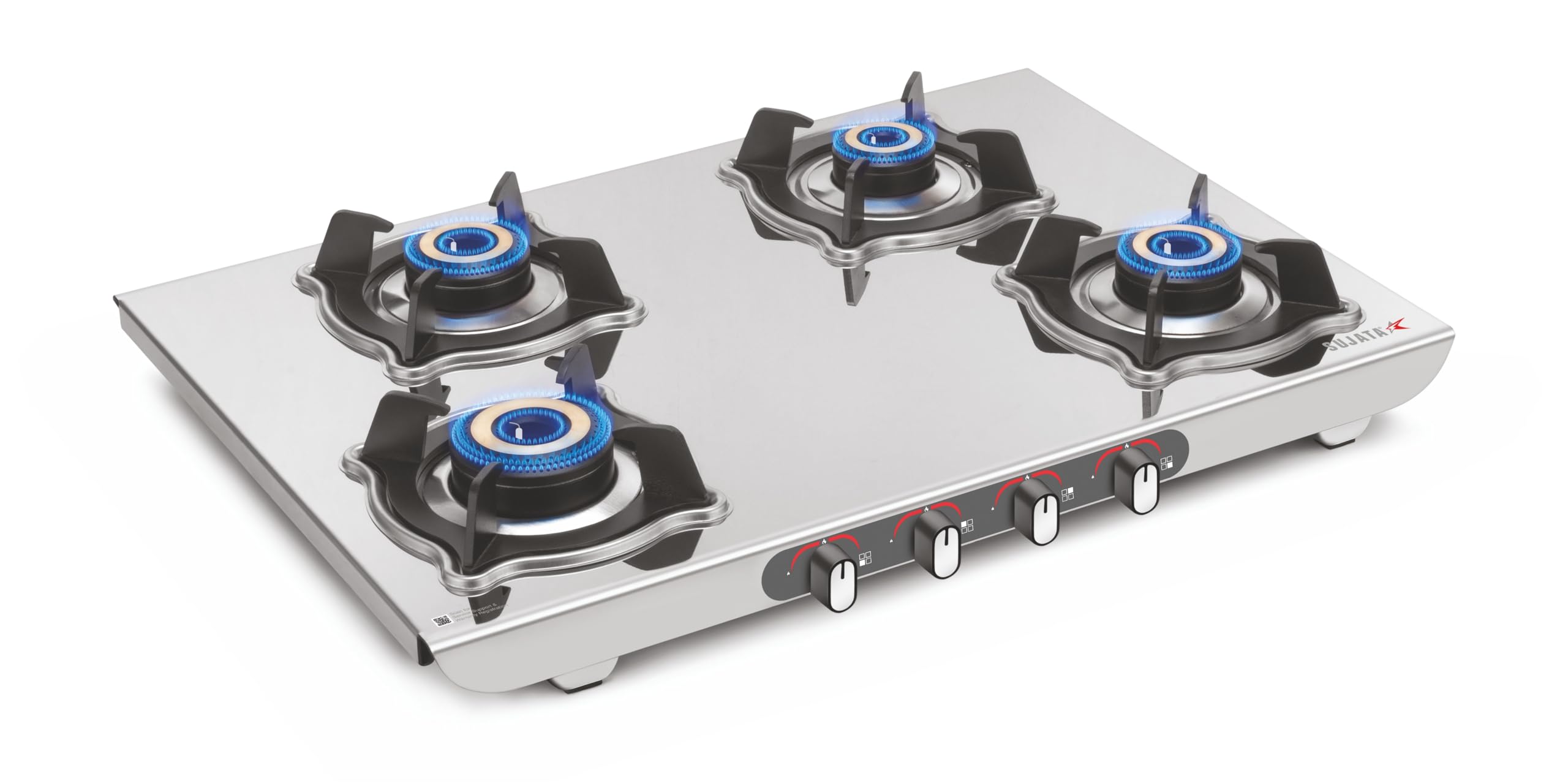 Sujata Sterno Auto Ignition Gas Stove | 9 Years Warranty | Gas Stove 4 Burners Steel Body, SABAF, ISI Certified, LPG & PNG Compatible, Jumbo Brass Burners (Stainless Steel)