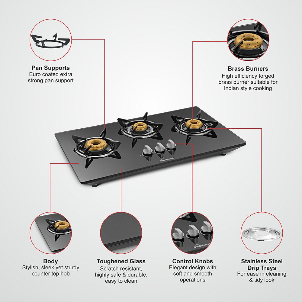 Sunflame Hob Glass Top 3 Burner Gas Stove, Manual Ignition, black