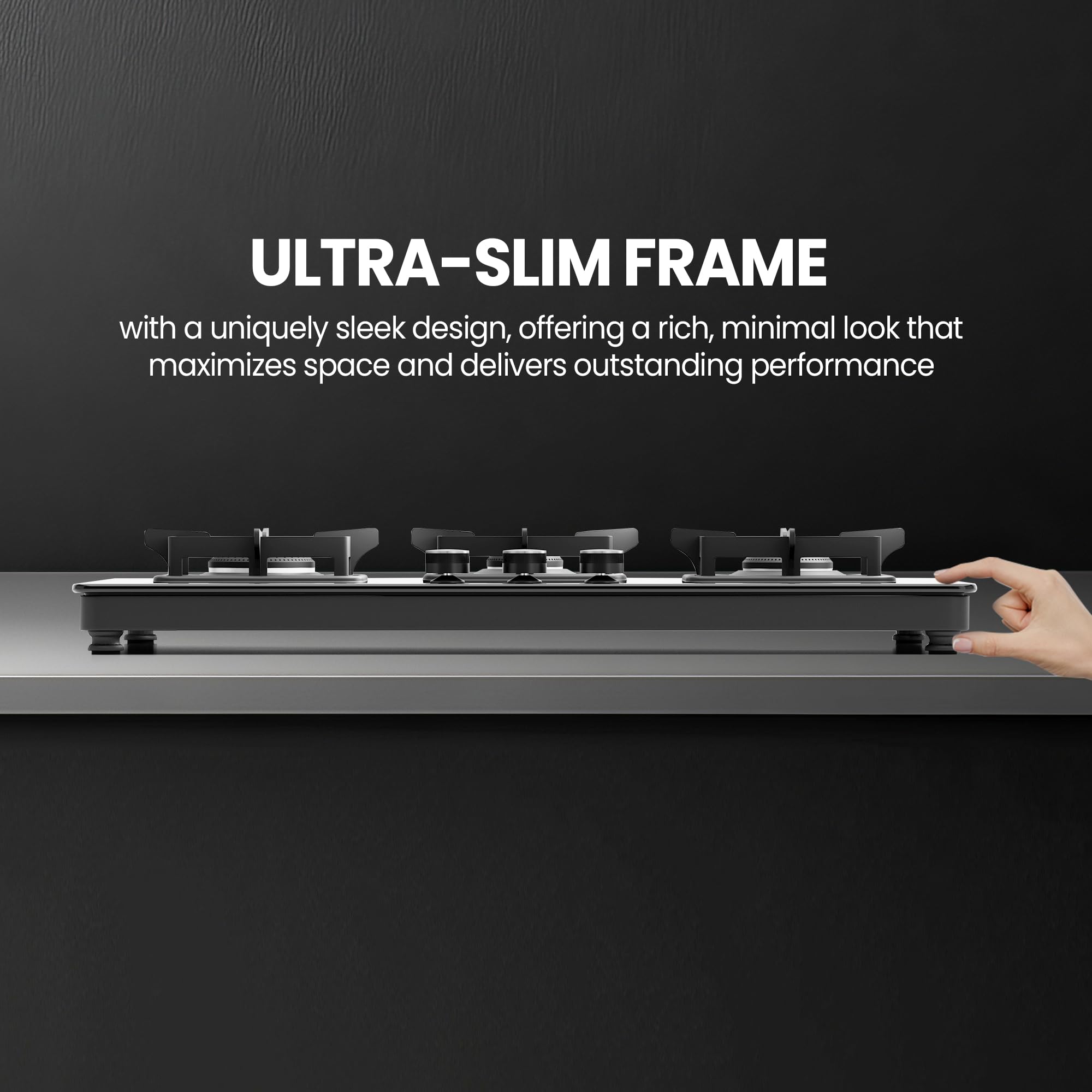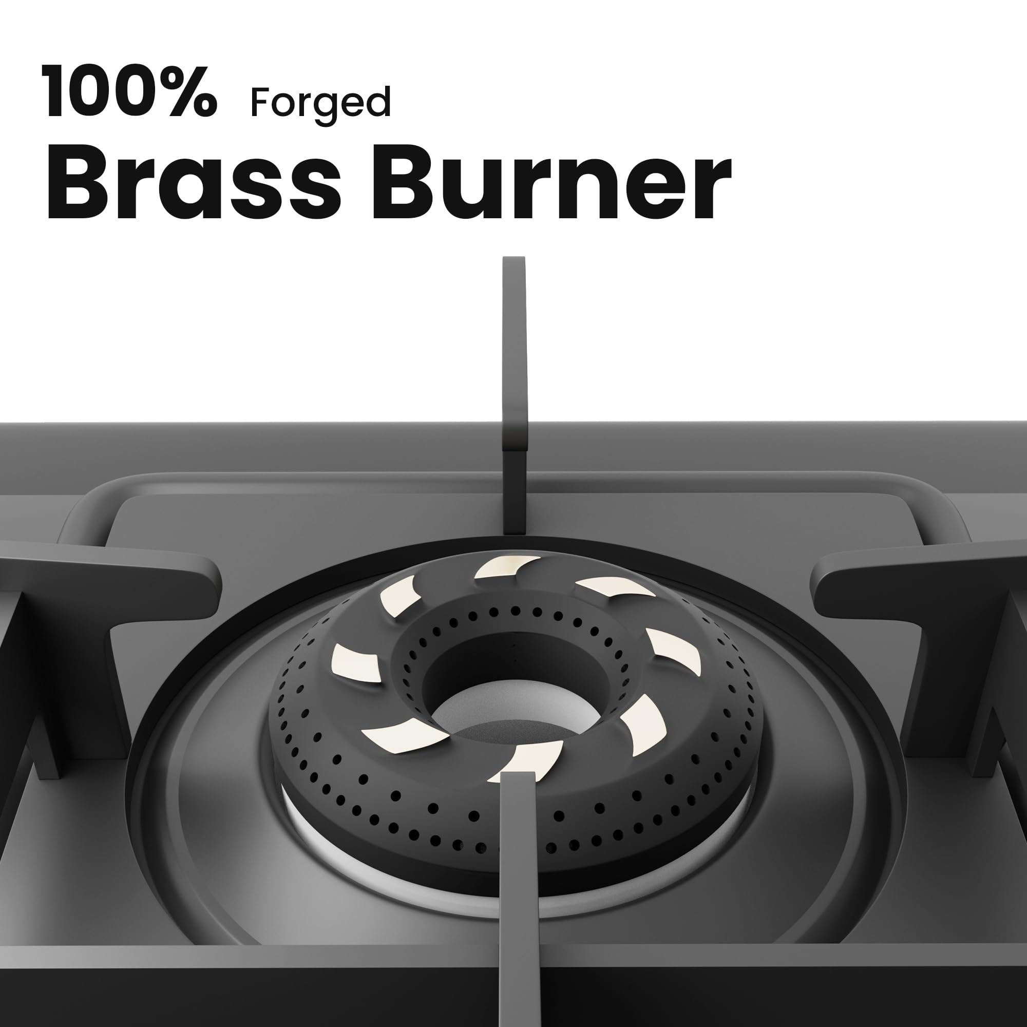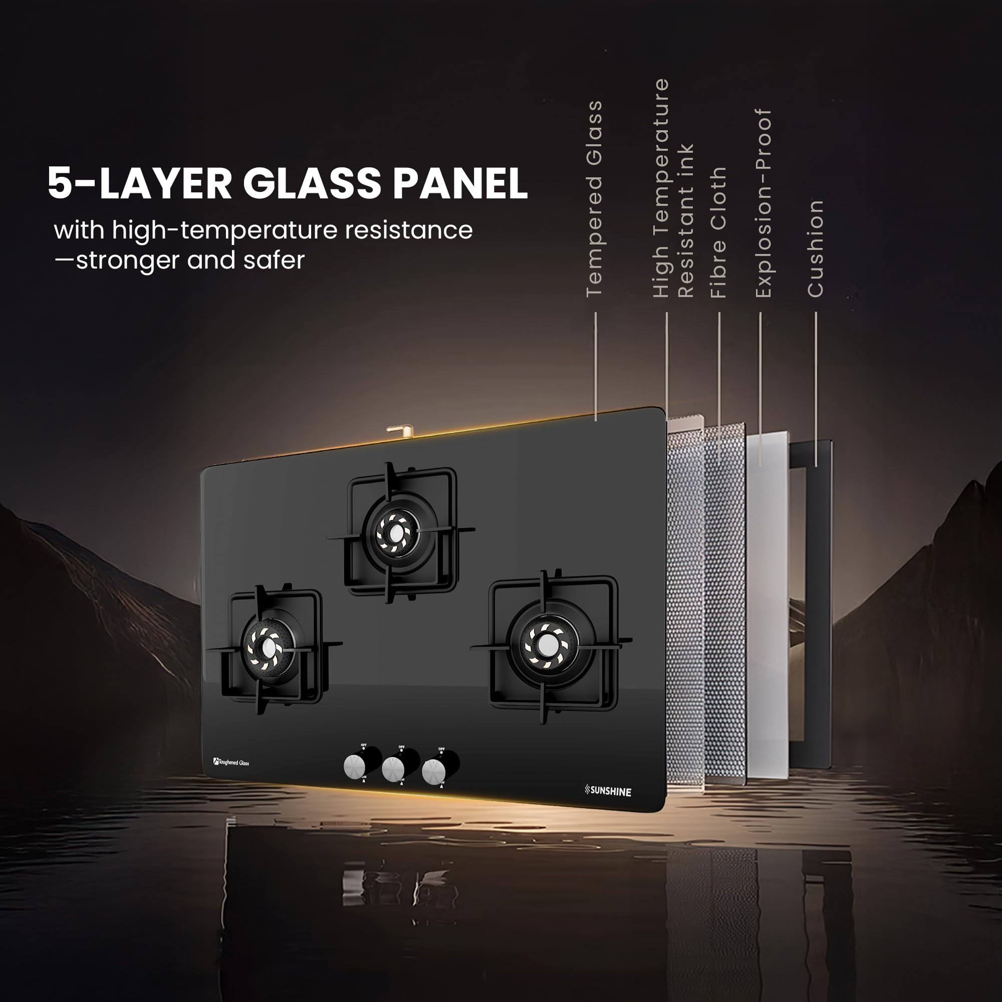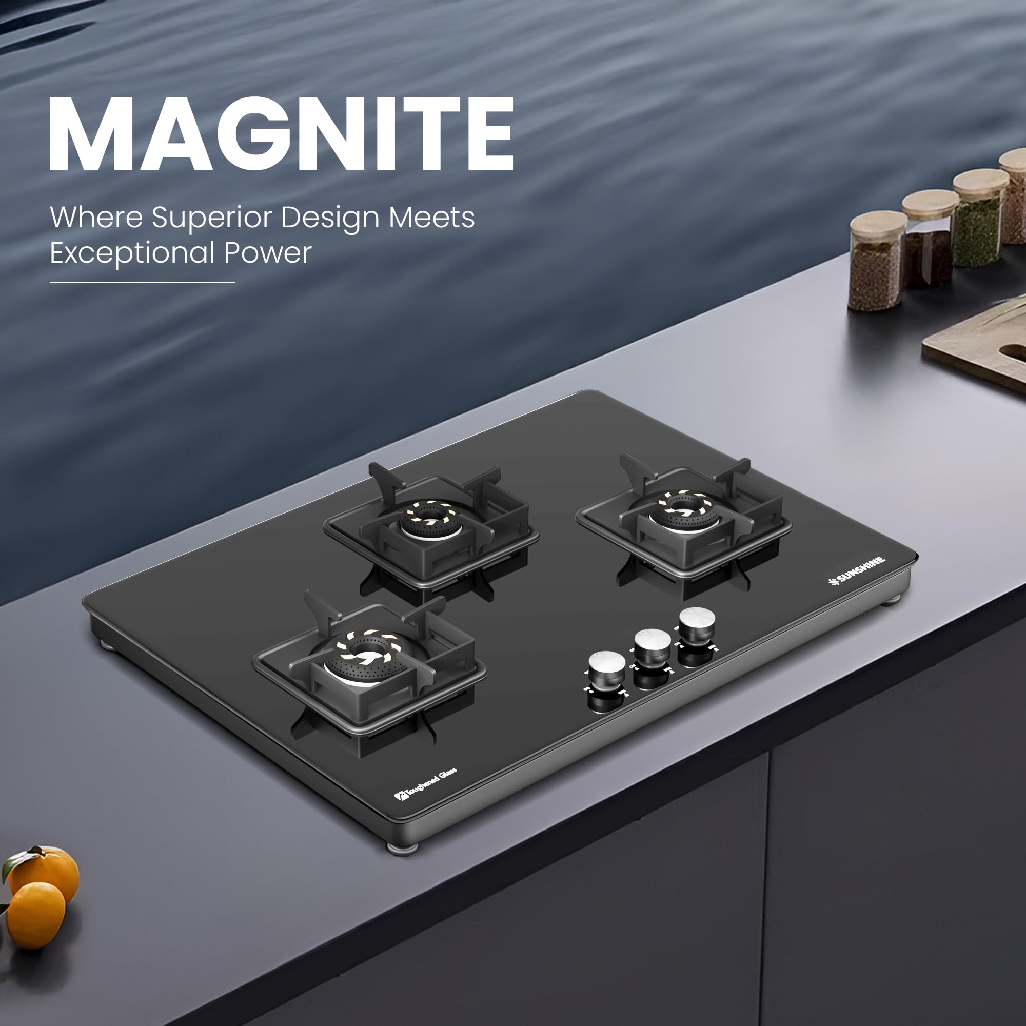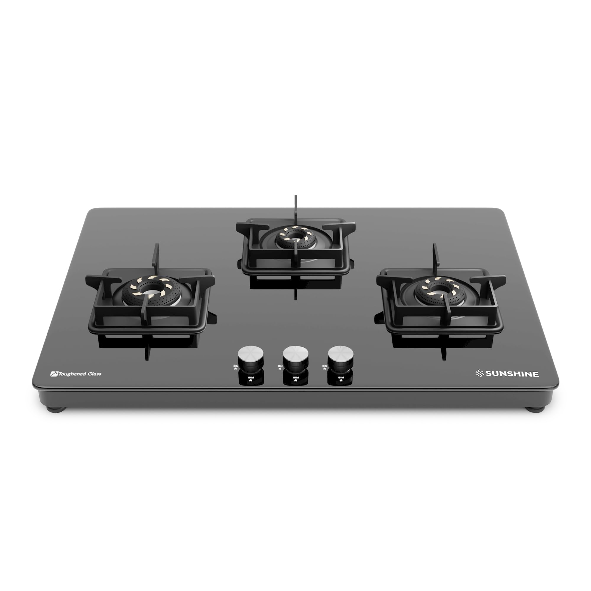Sunshine Magnite 3 Burner | Slimmest 3 Burner Glass Gas Stove | Hob Top Cooktop | Tempered Glass, 360° Rotating Brass Gas Nozzle | Manual Ignition | LPG Ready & PNG Compatible (Premium - Black)