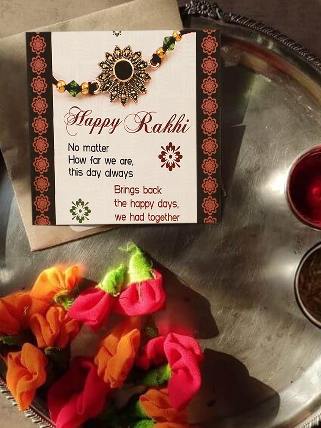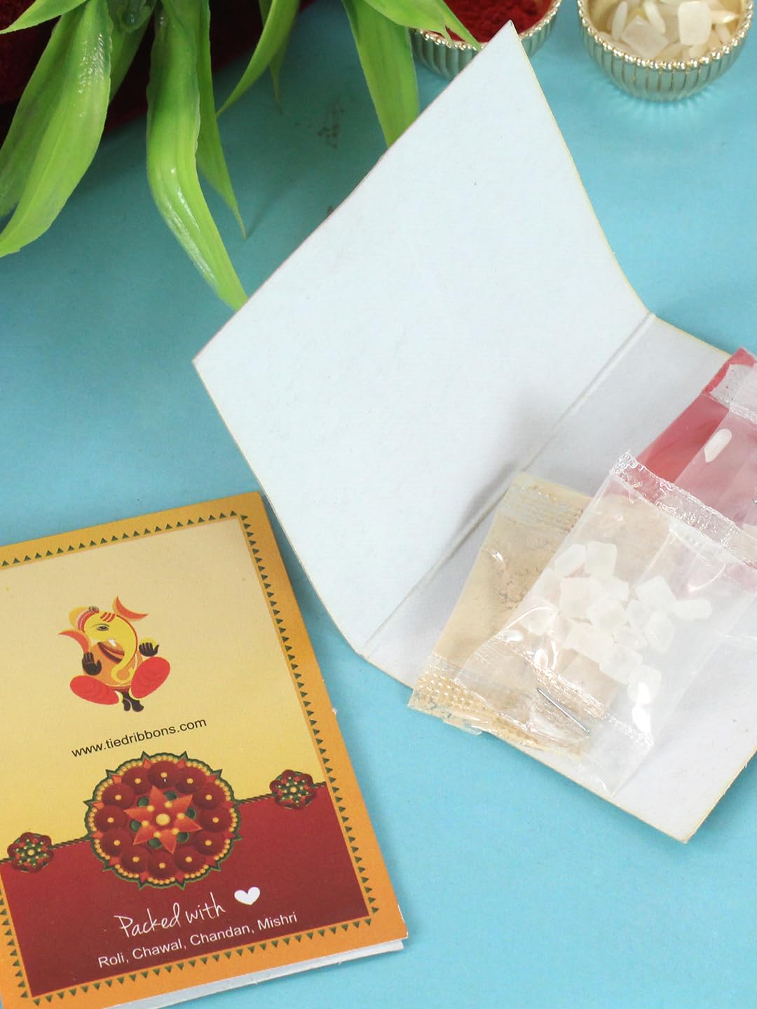 TIED RIBBONS Rakhi For Brother Chocolates Combo With Gift - Set Of 2 Premium Rakhi With Chocolates Pack Mini Greeting Card And Roli Chawal - Rakhi Gift For Brother, 250 Gram