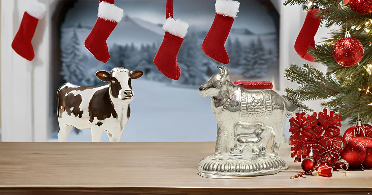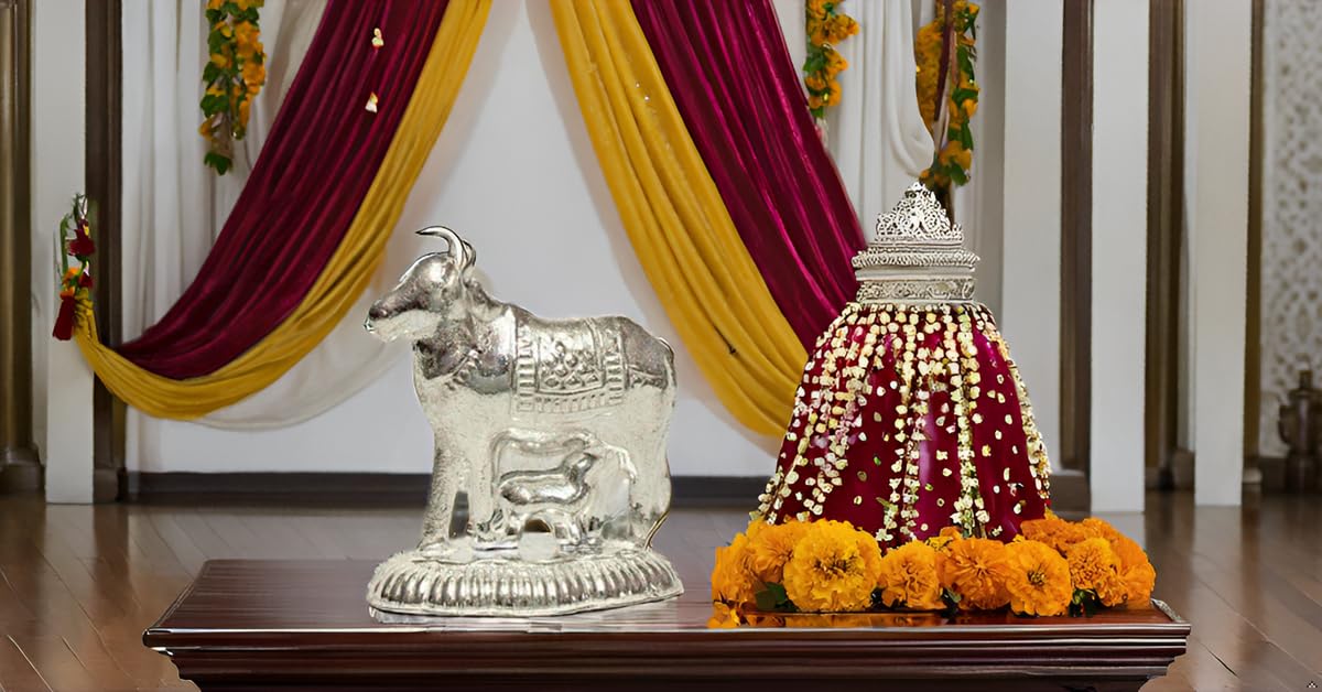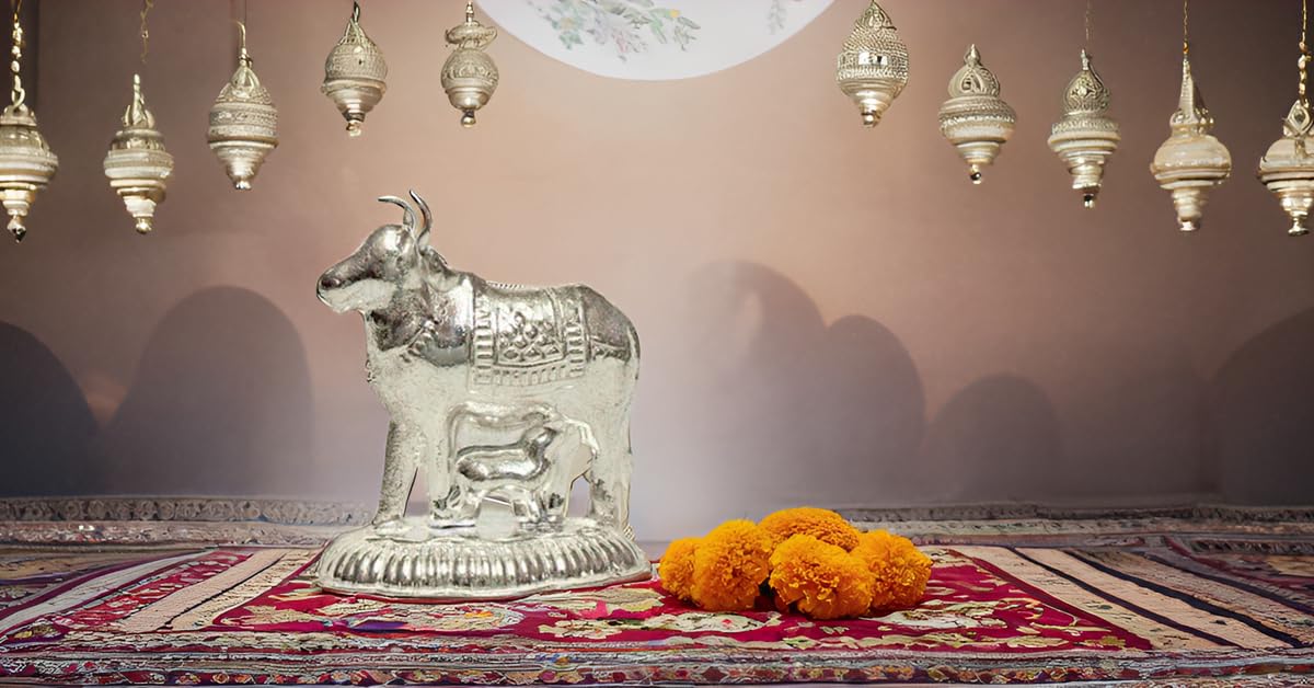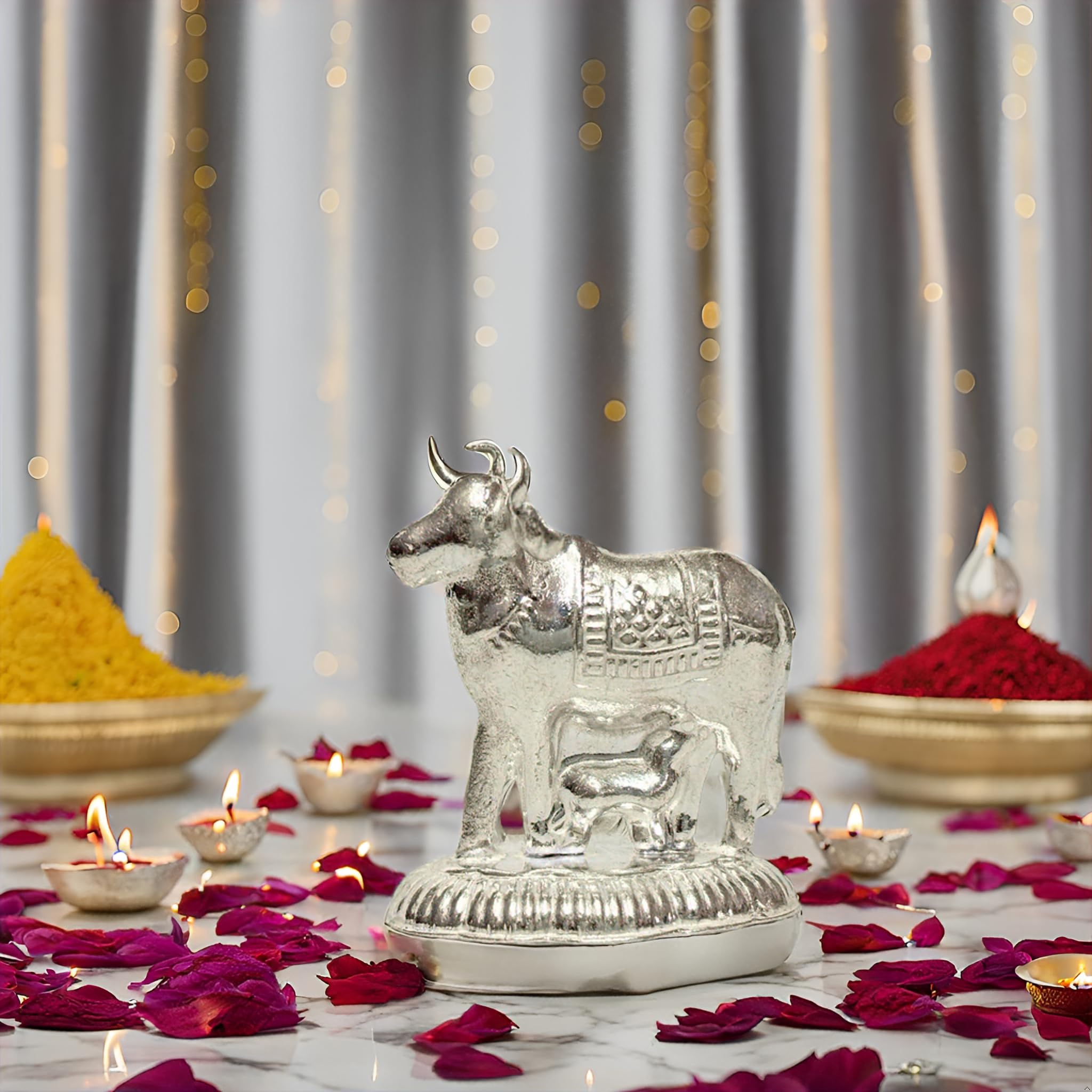Vail Creation German Silver Kamdhenu Cow and Calf Idol Decoration for Pooja Room Gift Worship Office Home Decor Items | Silver Cow and Calf Statue