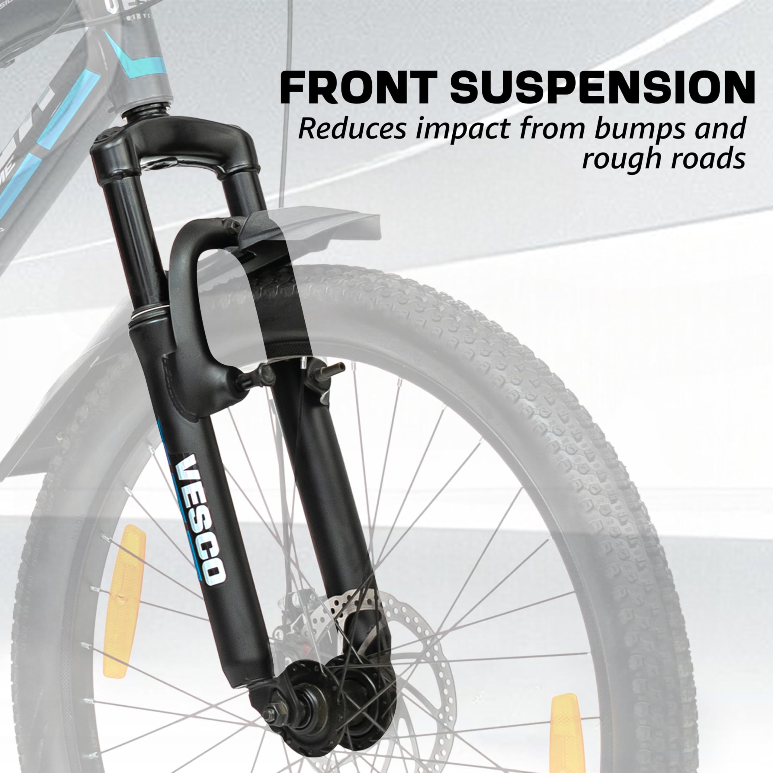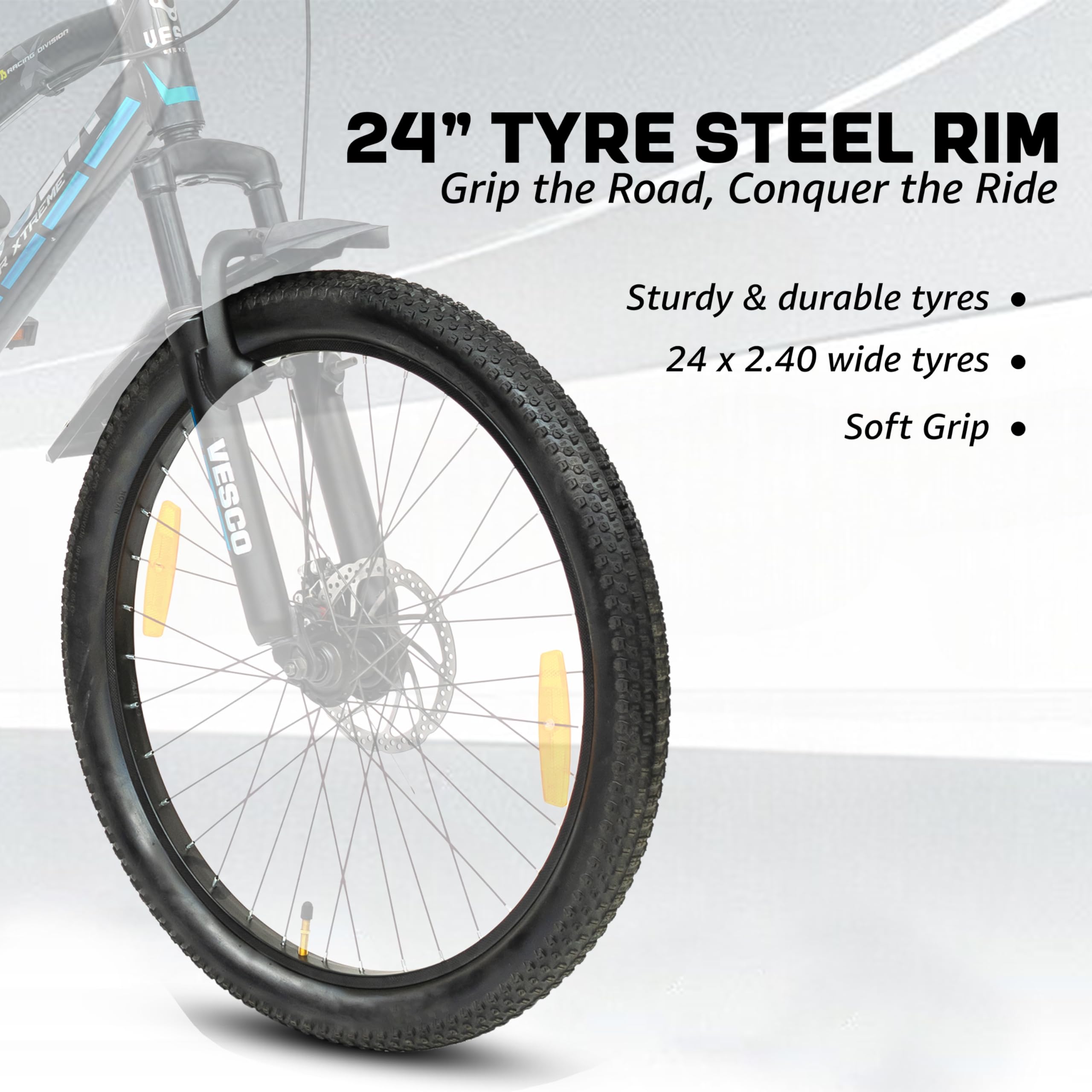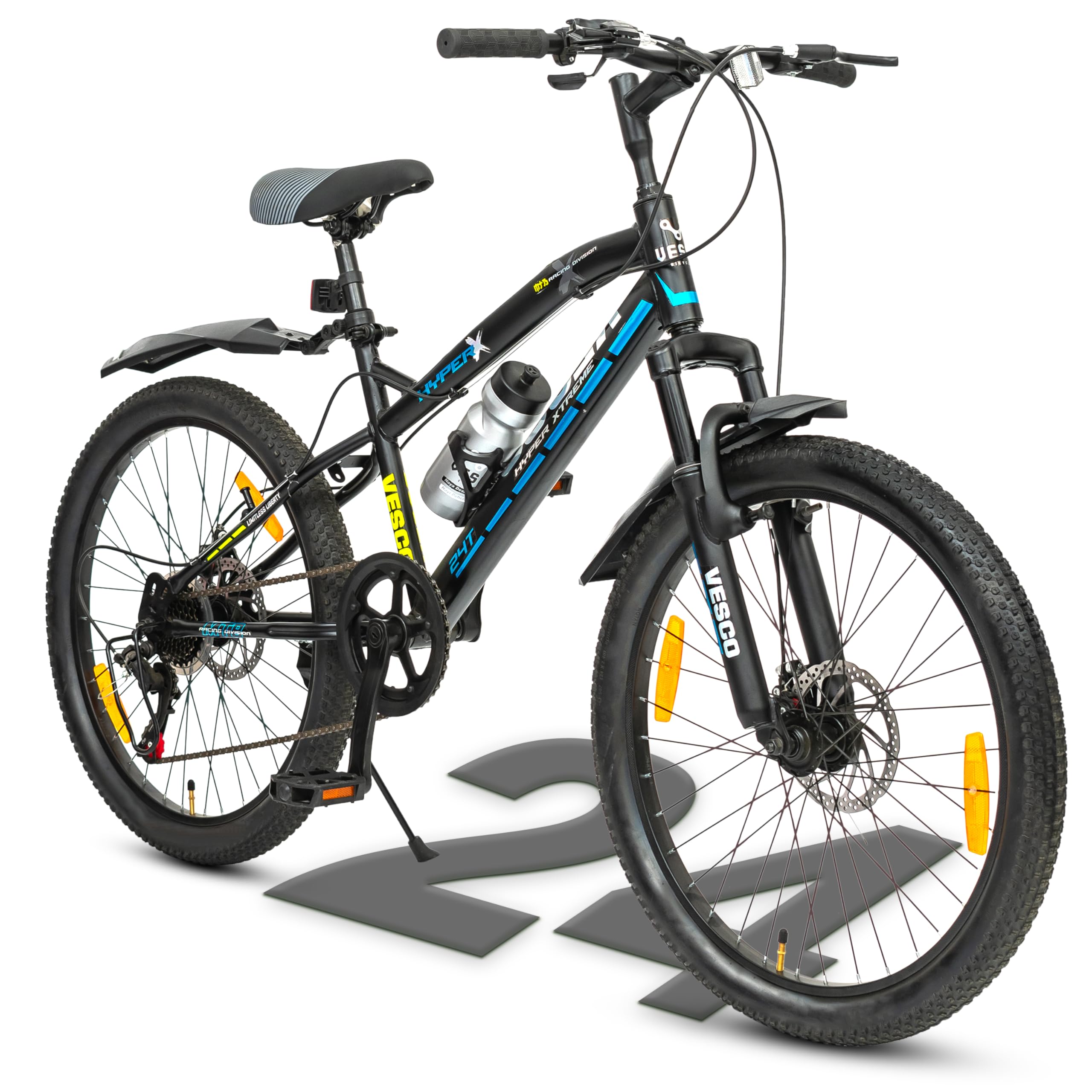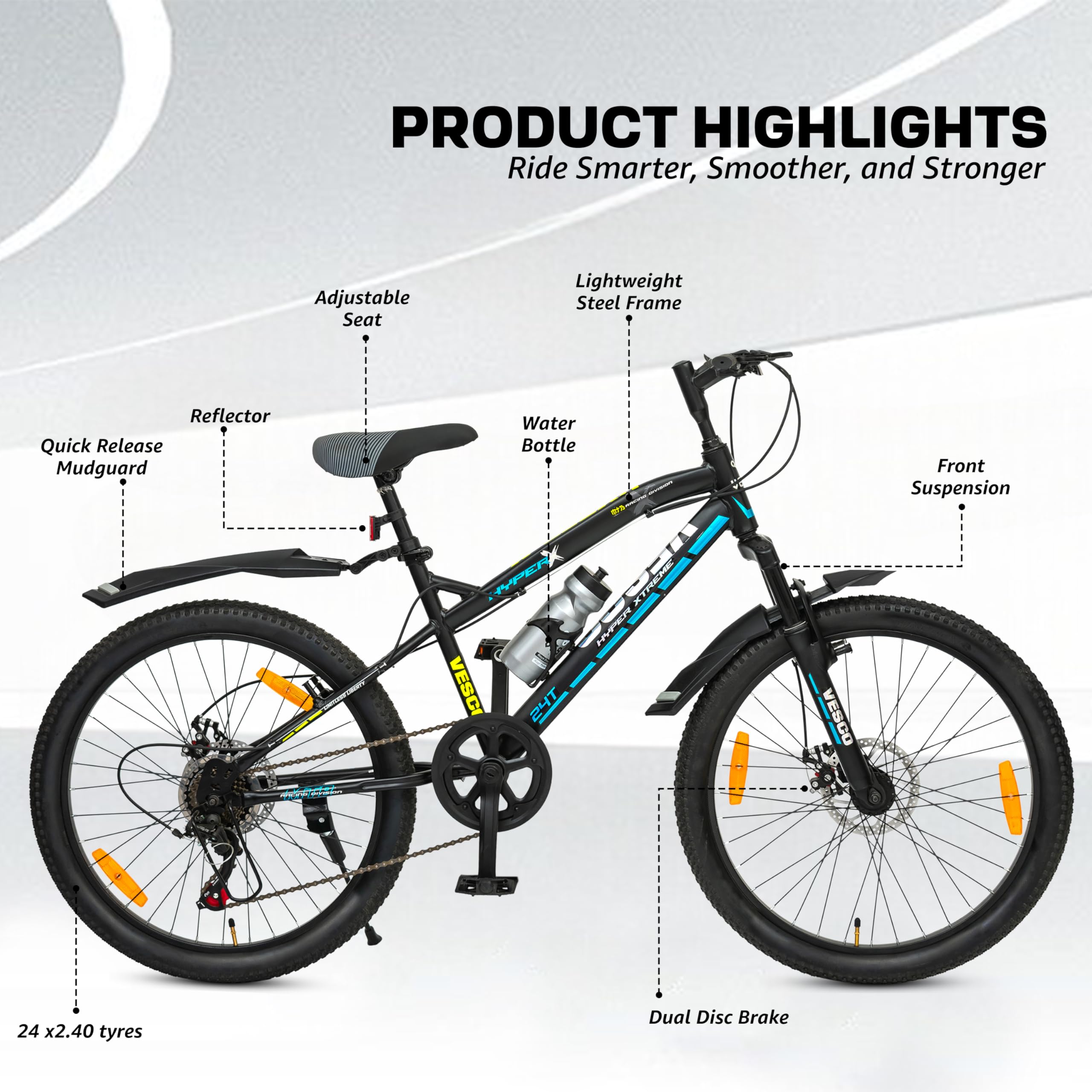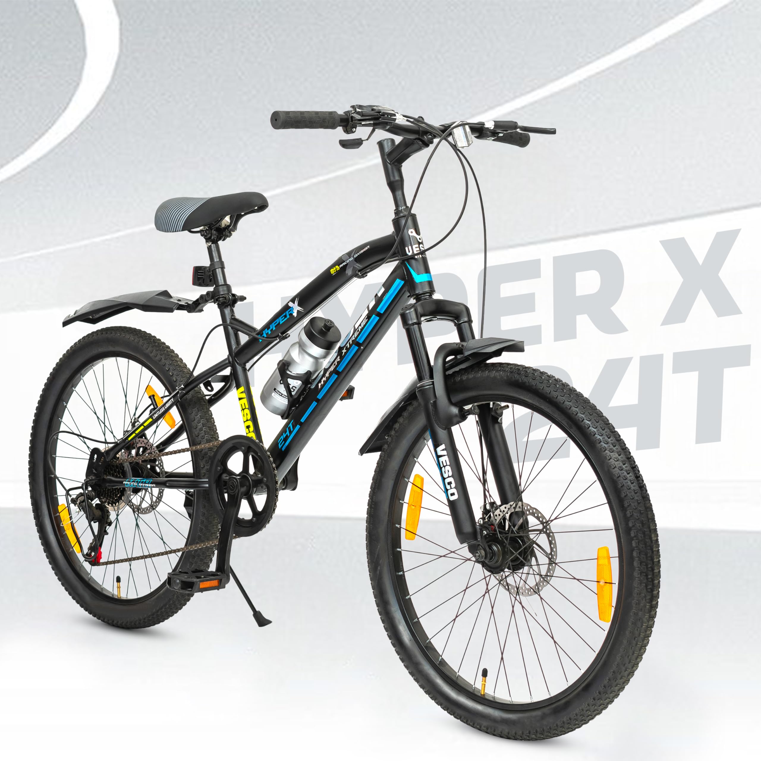 VESCO Hyper-X 24T MTB 7 Speed Gear Cycle for Boys & Girls | Dual Disc Brake | Front Suspension | 16 inch Frame | Ideal for Kids 10-12 Years Mountain Bike (Black)