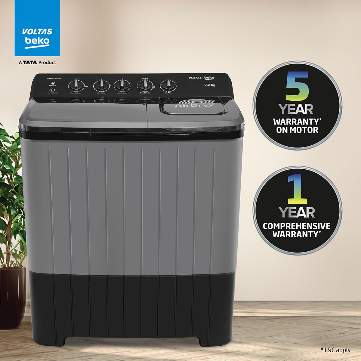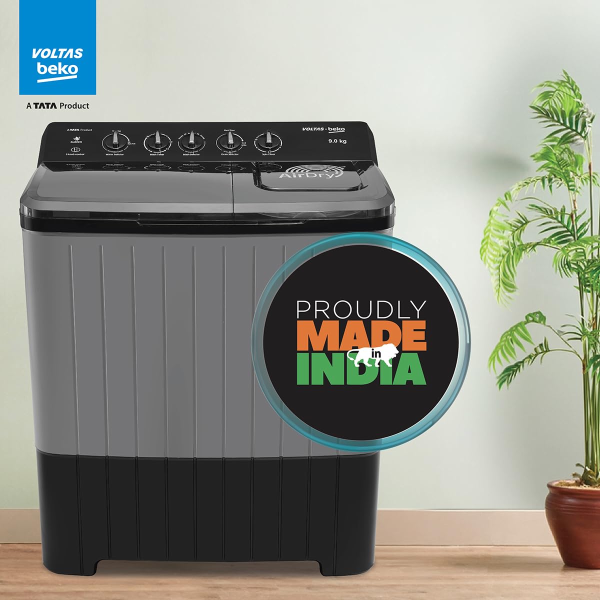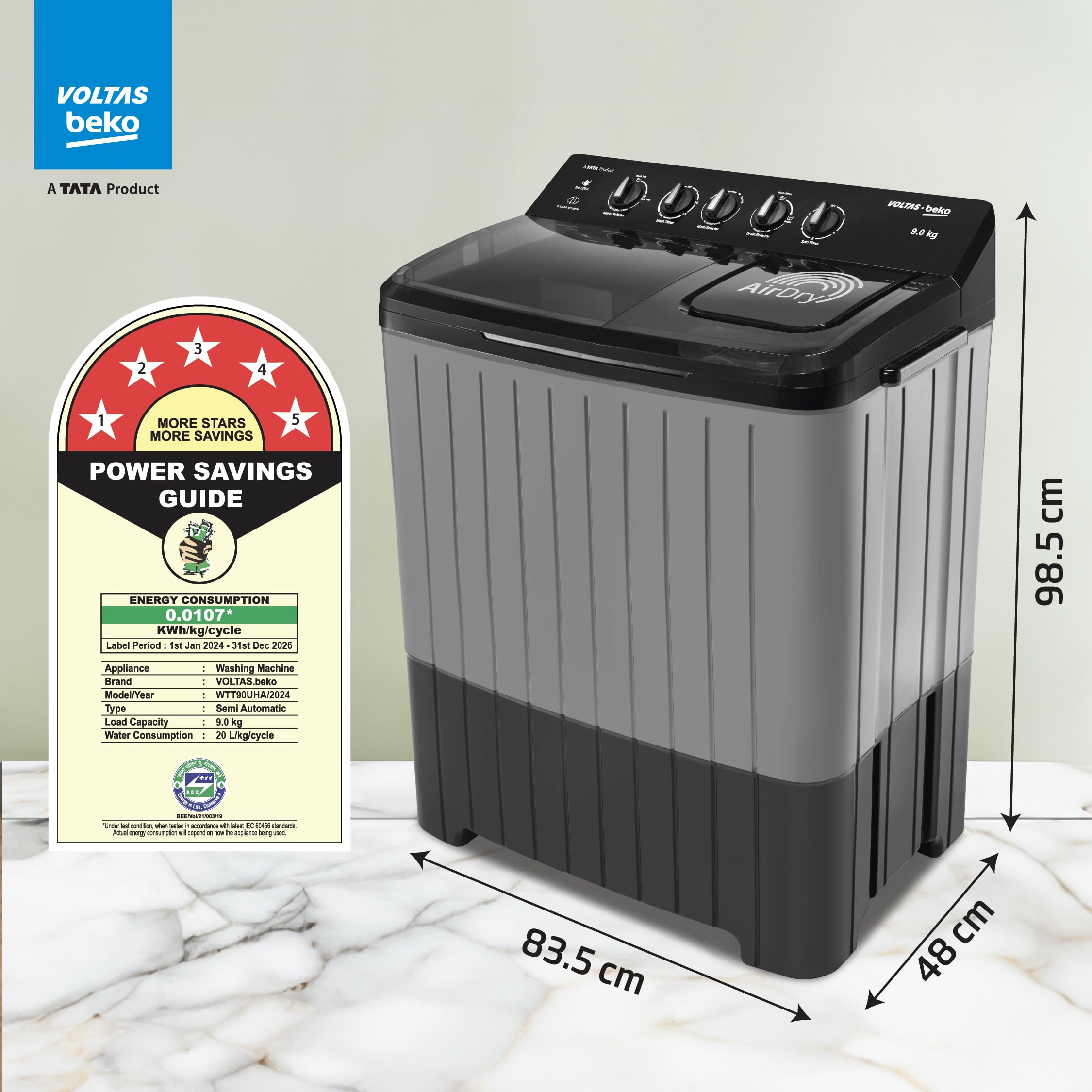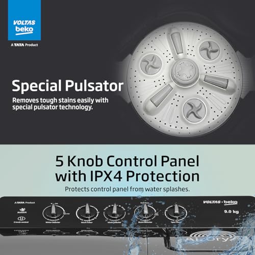 Voltas Beko, A Tata Product 9 Kg 5 Star Semi-Automatic Top Loading Washing Machine (WTT90UHA/OK5B1B1S23, Black, Pulsator Wash Method and Double waterfall technology)
