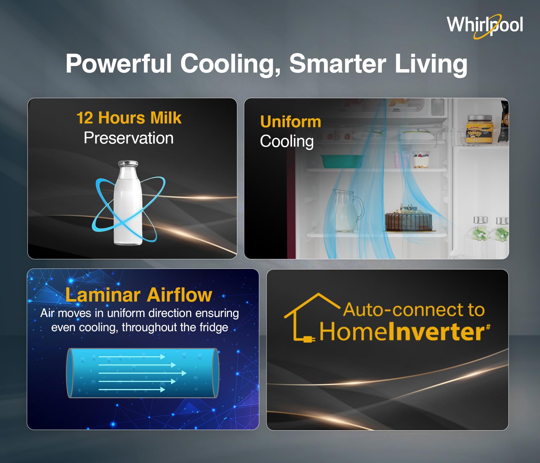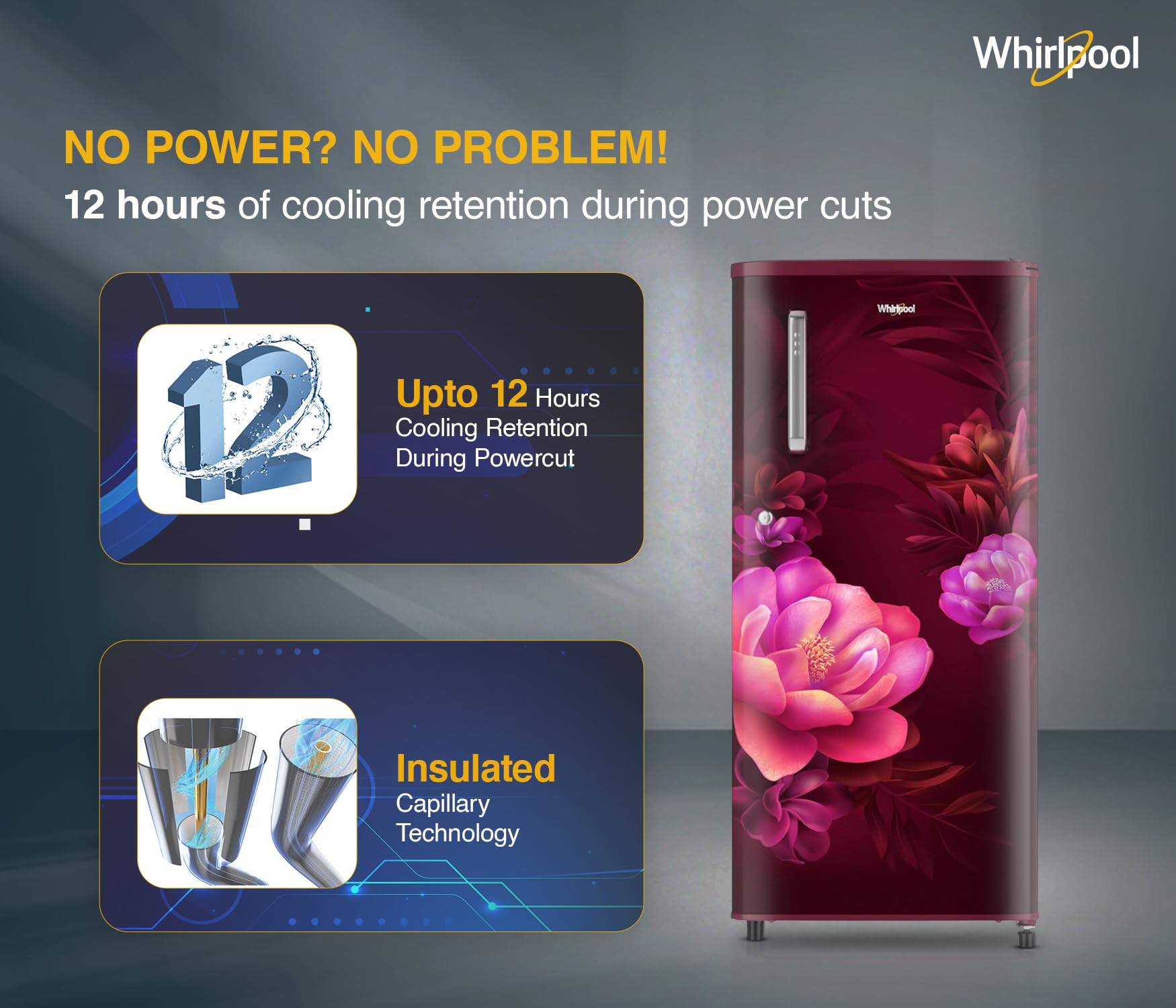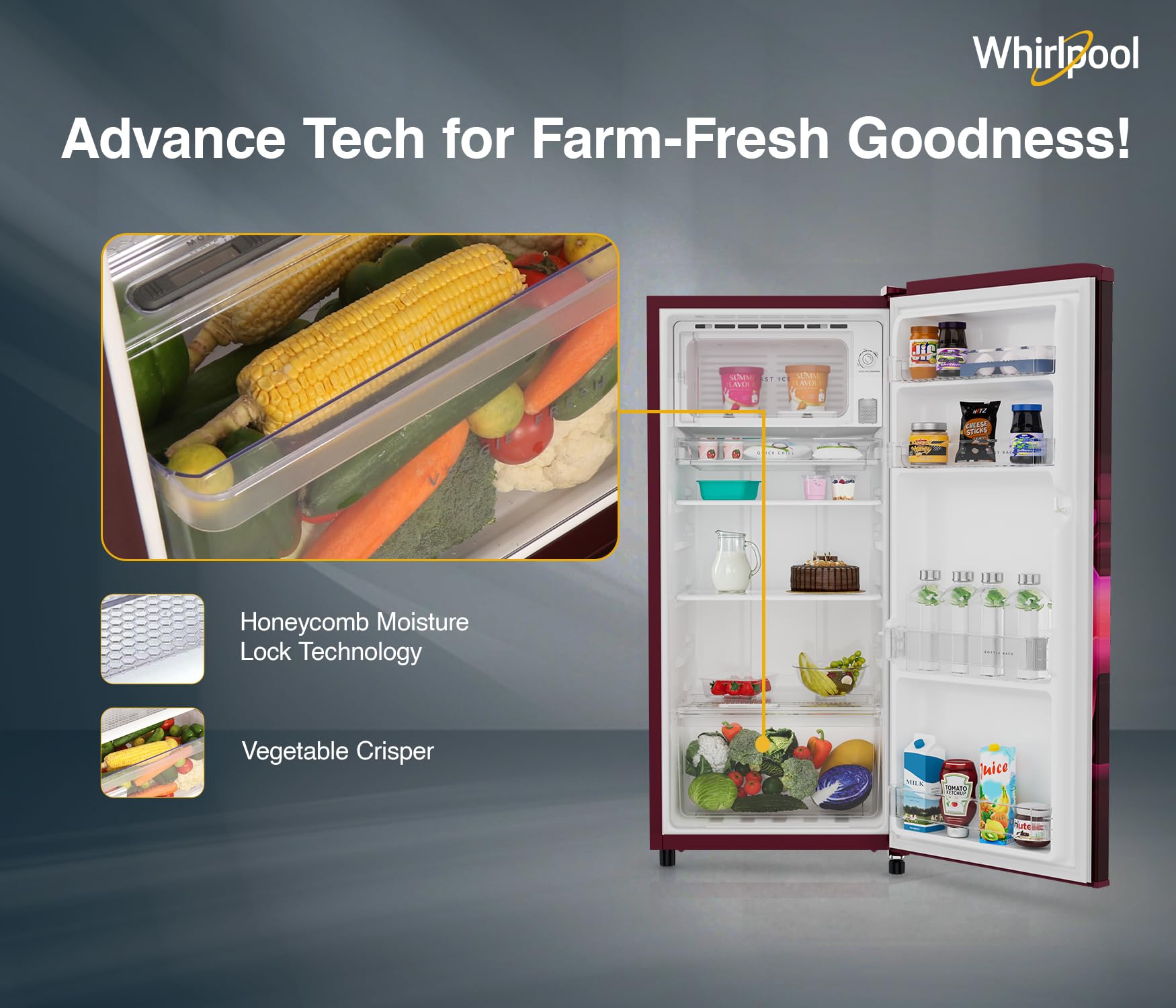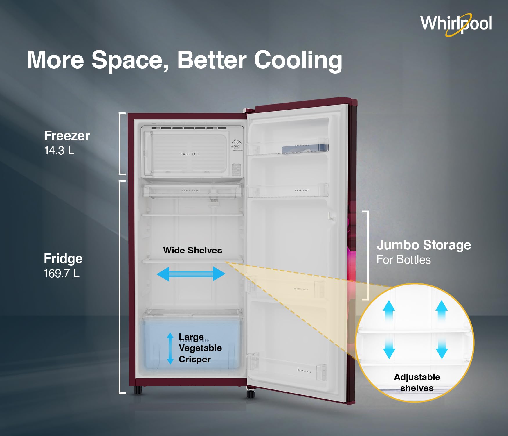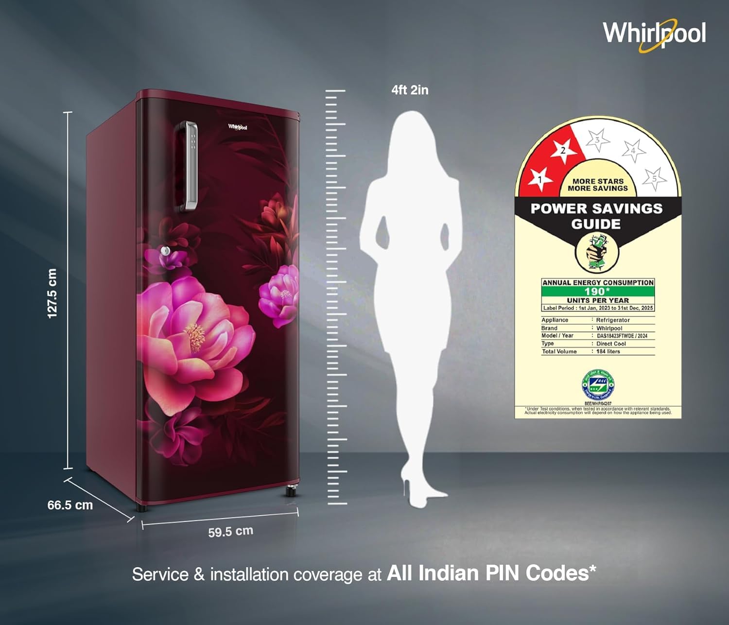 Brand: WhirlpoolColor: WINE SERENA -ZFeatures: Single door refrigerator with Capacity: 184 liters for families with 2 -3 members Capacity: 184... Read more