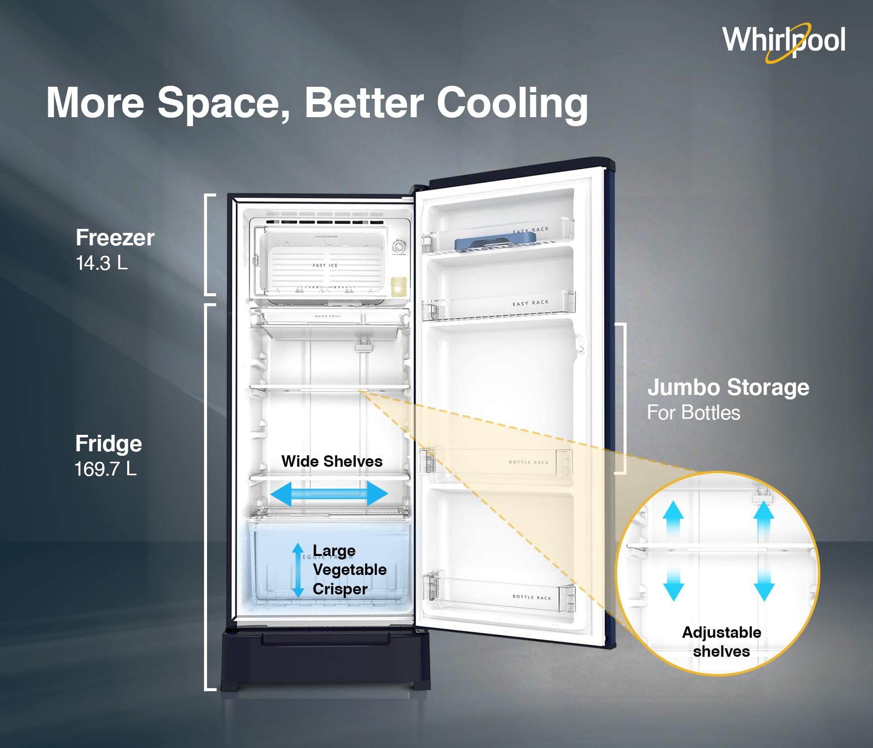 Brand: WhirlpoolColor: SAPPHIRE SPRING-ZFeatures: Single door 5 Star refrigerator with Intellisense Inverter Technology Single Door 5 Star Capacity: 184 liters... Read more