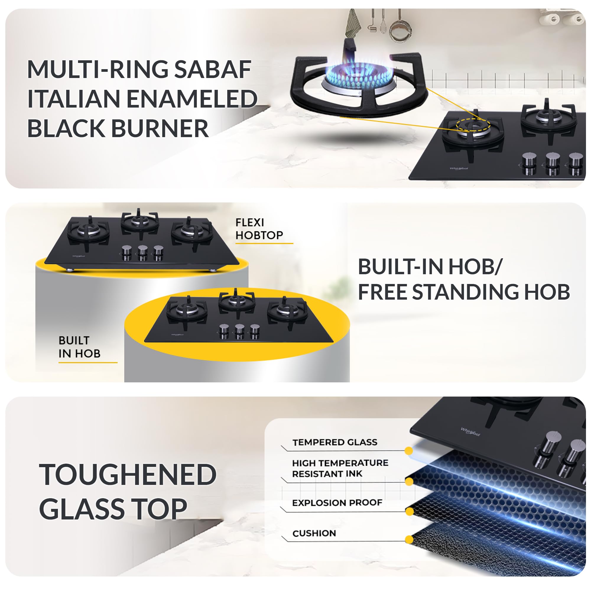 Whirlpool Hob 3 Burner Auto Ignition Gas Stove (Glass Ceramic, Elite Hybrid 703 Mt Gas Hob), Black