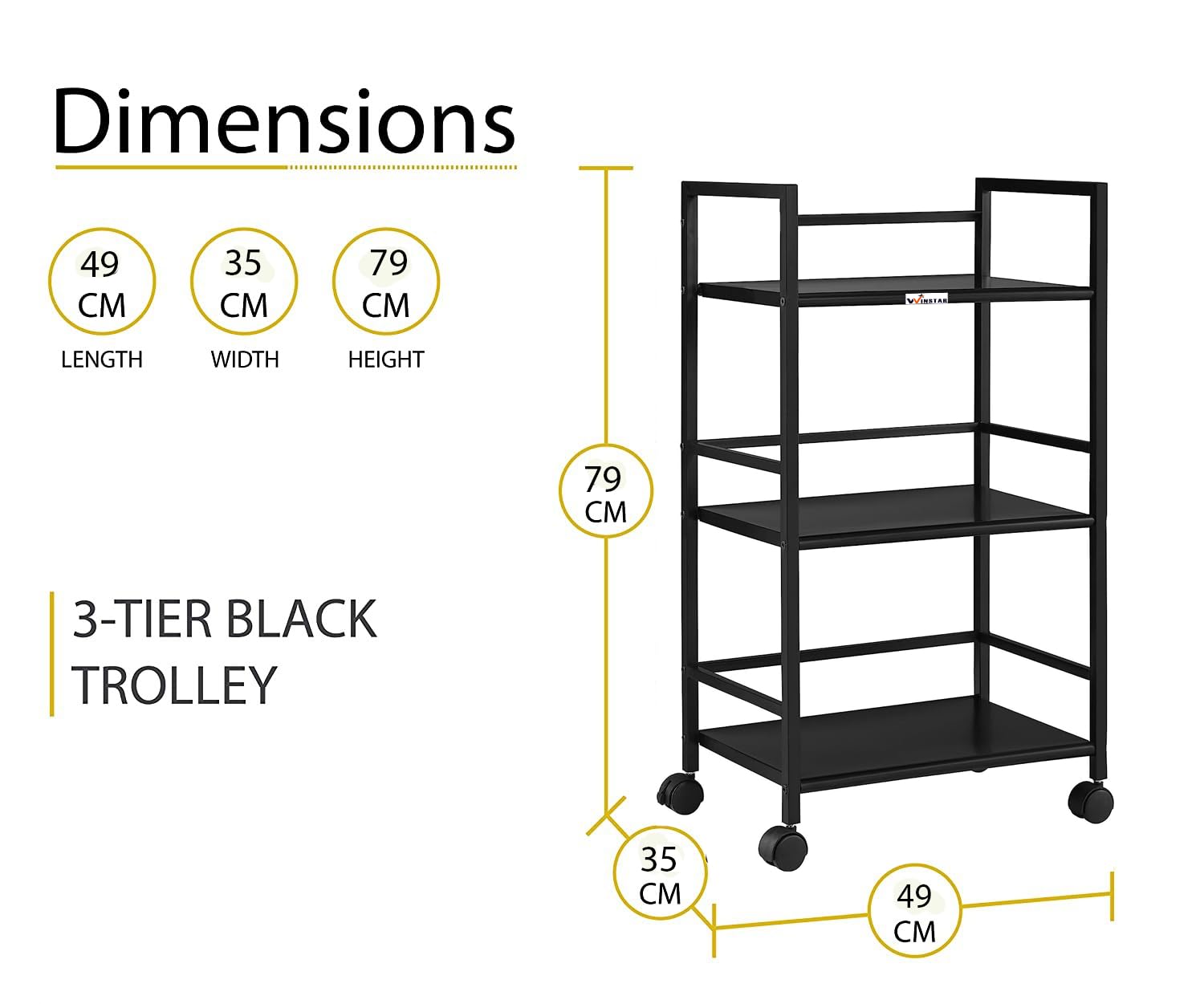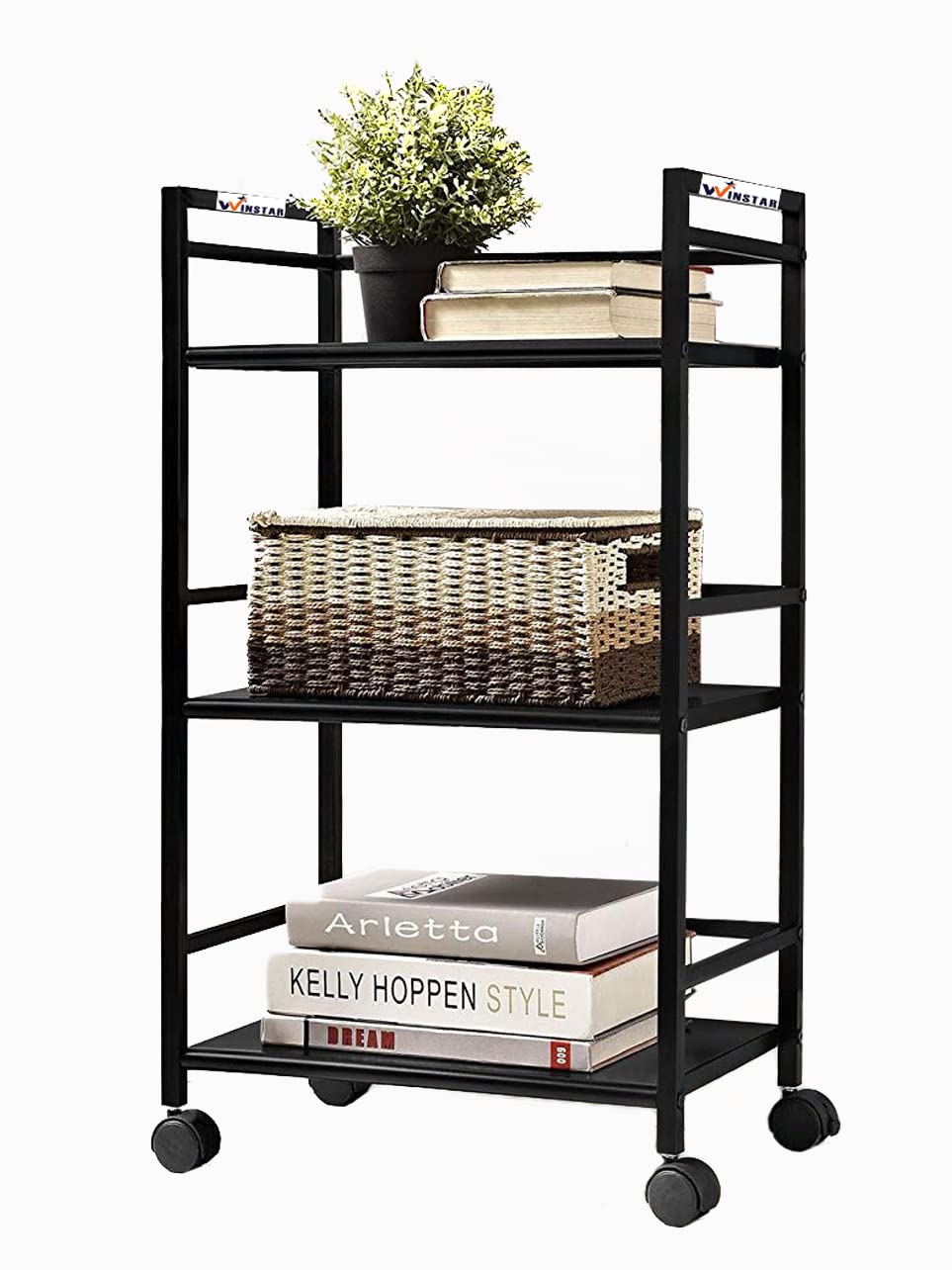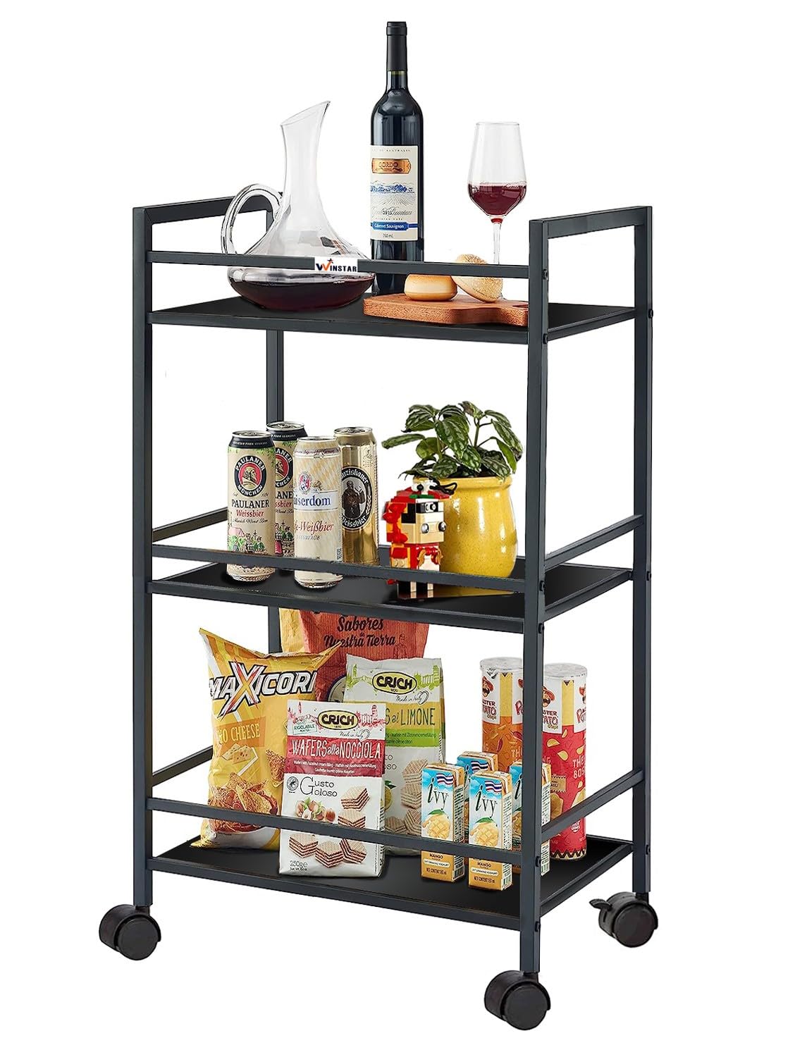 WINSTAR Metal Rolling Trolley with Lockable Wheels | Heavy Duty Multifunctional Metal Frame Cart | Ideal for Home, Kitchen, Bathroom and Office Storage | (Black, 3-Tier)