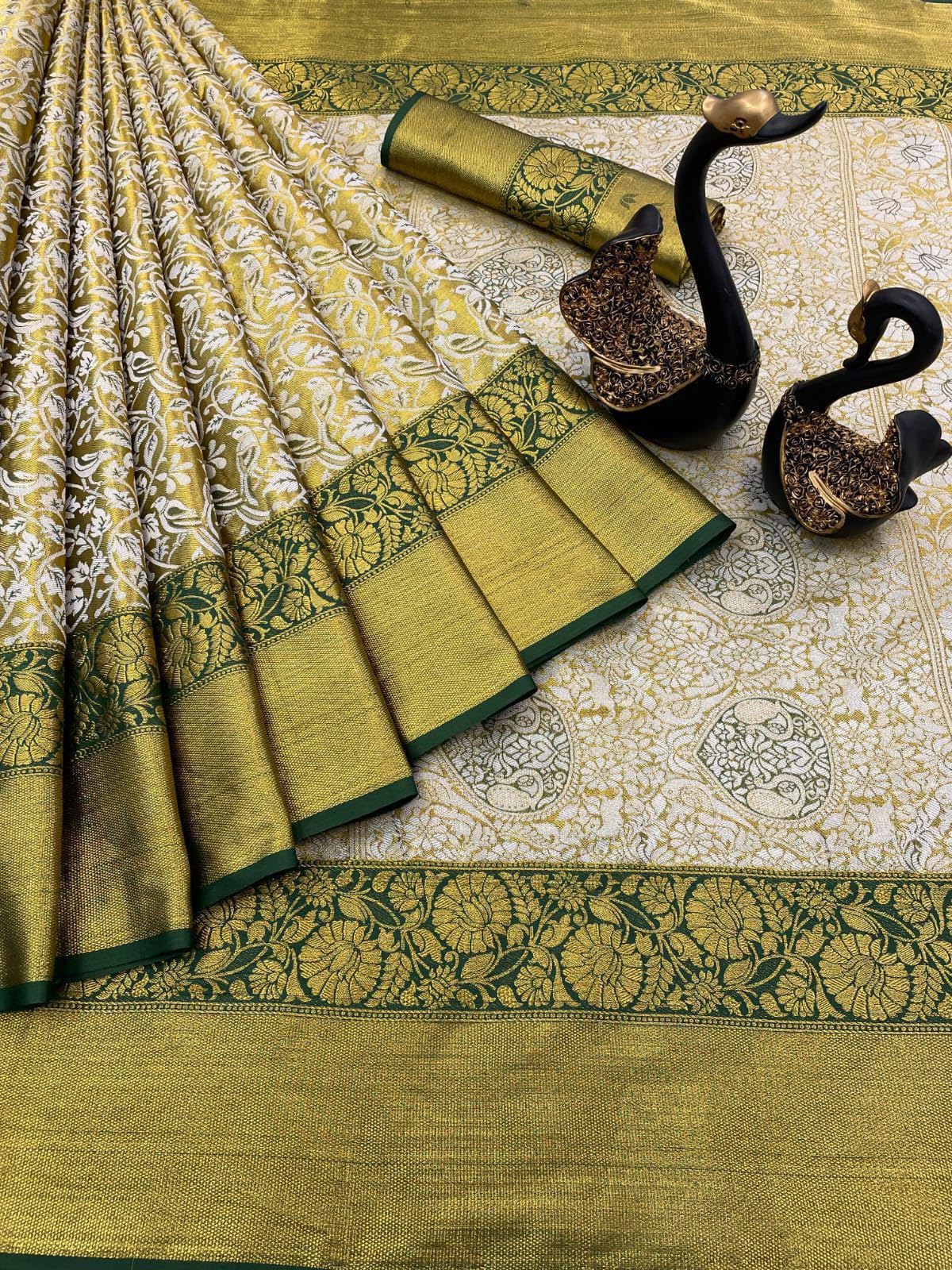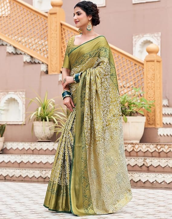ZECVA Women's Pure Kanchipuram Kanjivaram Silk Saree For Women With Zari Weaving All Over Saree Attach With Unstitch Blouse Piece (GREEN)